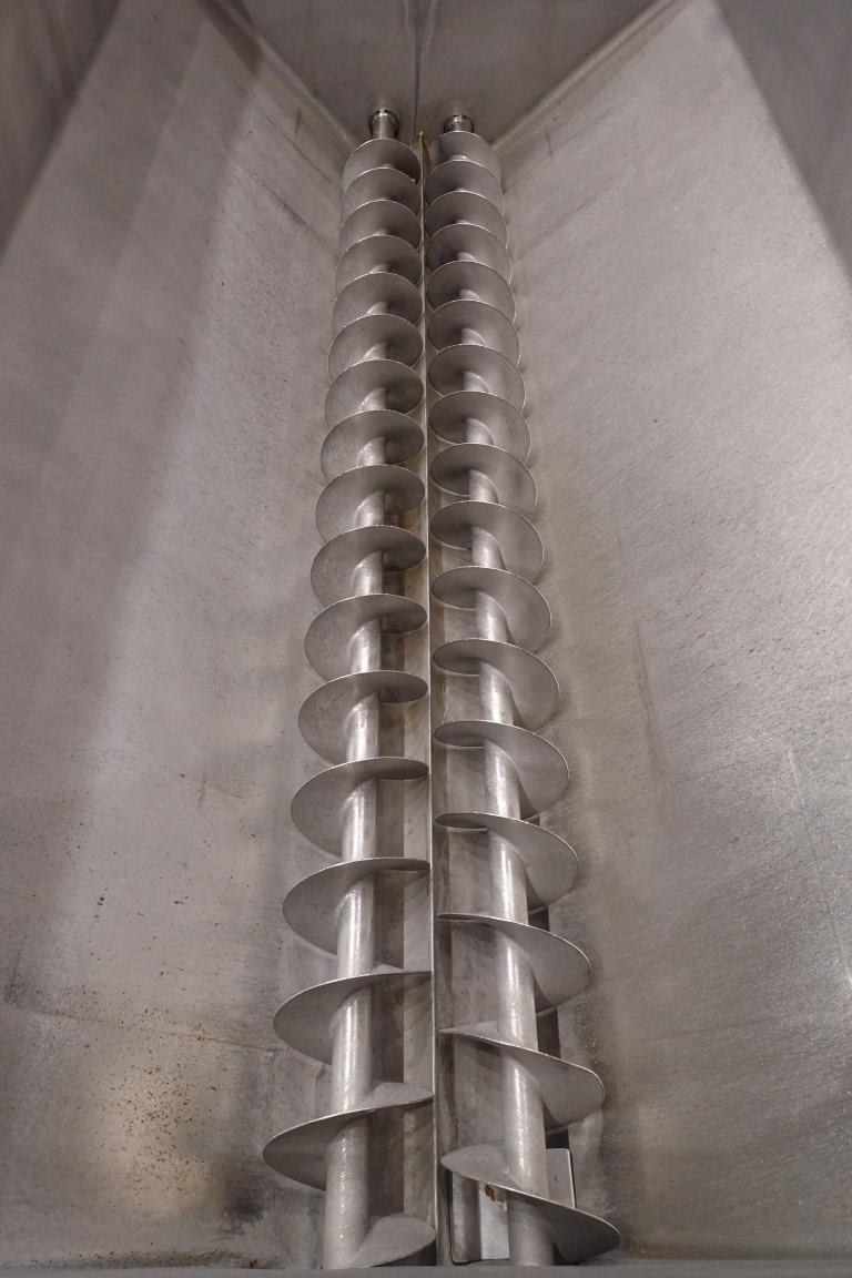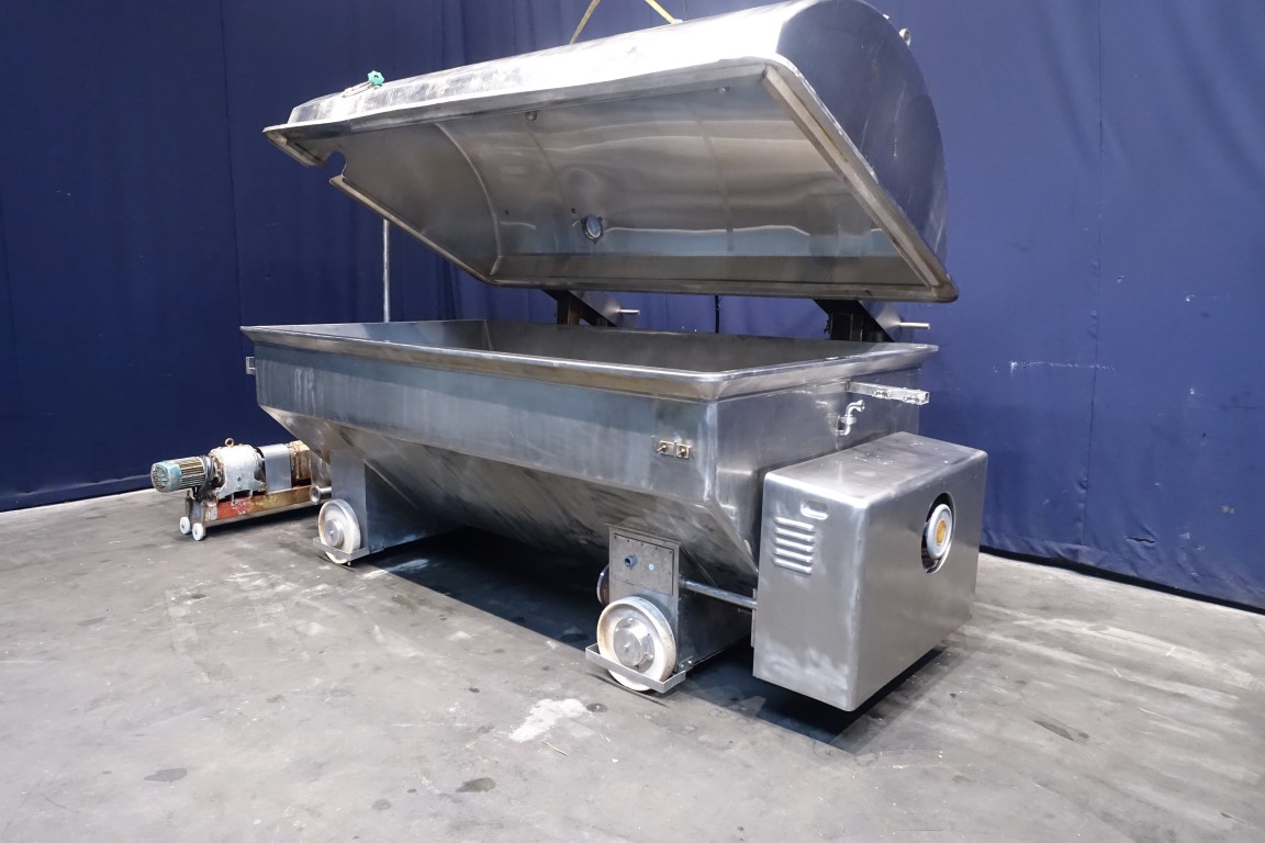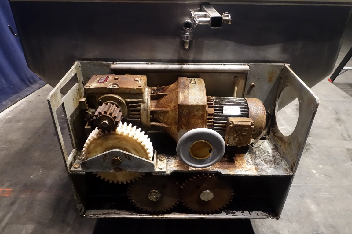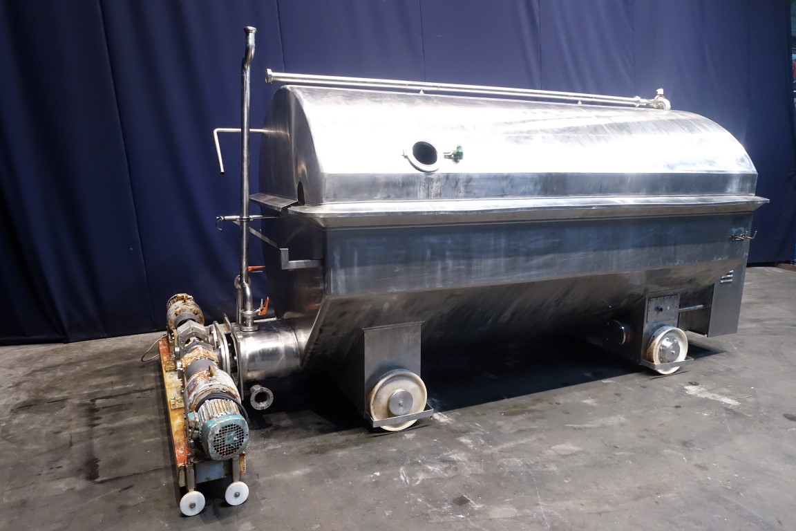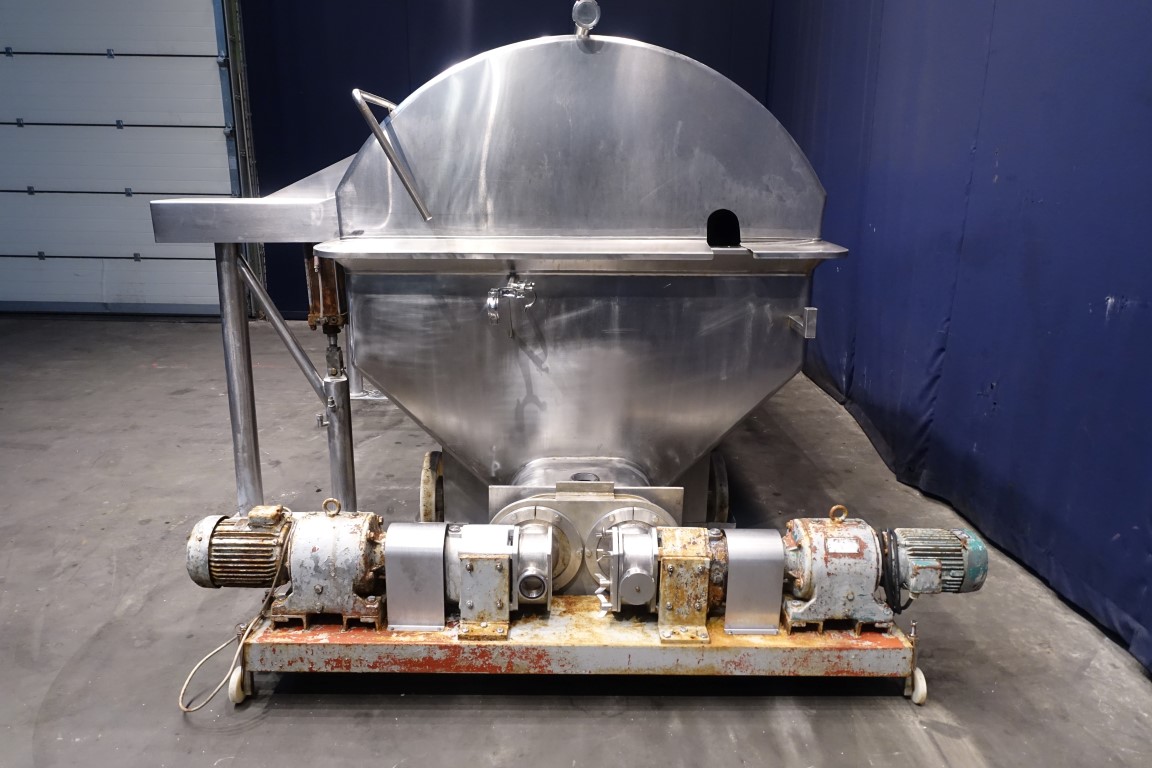 Mobile open butter buffer tank (butter silo) with cover. 2 Augers with 1 motor with mechanical reductor, motor 3 kW - n1: 1410 rpm - n2 (speed augers) 5,8 - 29 rpm (mechanical reductor). Cover pneumatic tiltable and with sight glass. CIP cleanable by 2 spray bowls in lid. 2x round flange connections for 2x butter pumps (including 2 butterpumps make: Pasilace with plastic impellors, motor 2,2 kW). Excluding controls. Total outside dimensions: 390 x 260 x 230 cm.