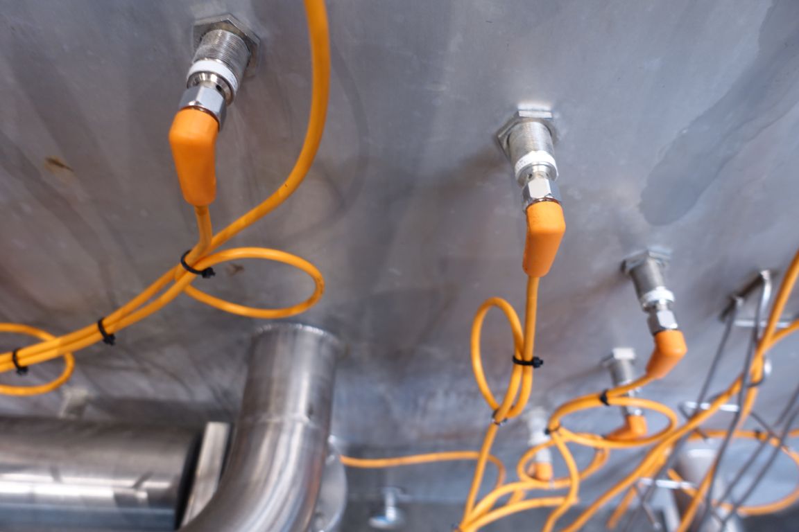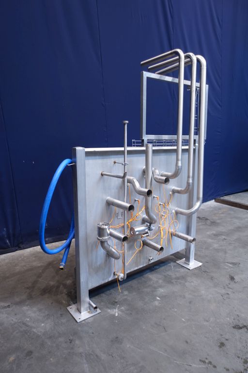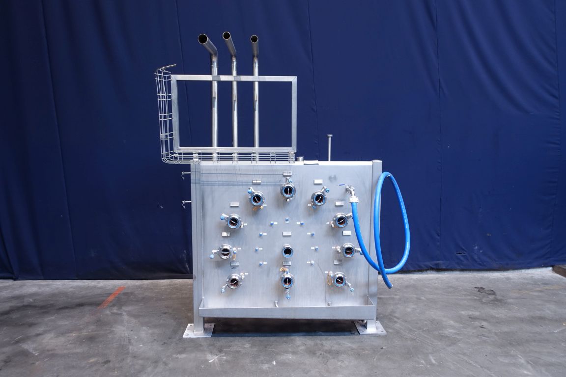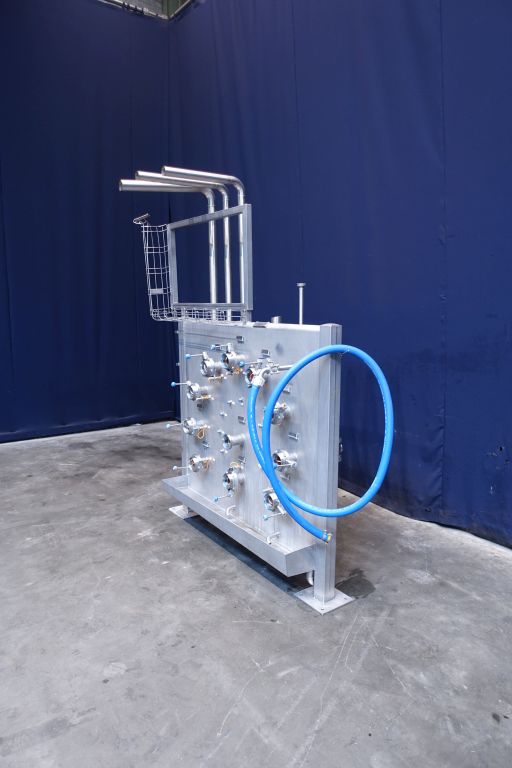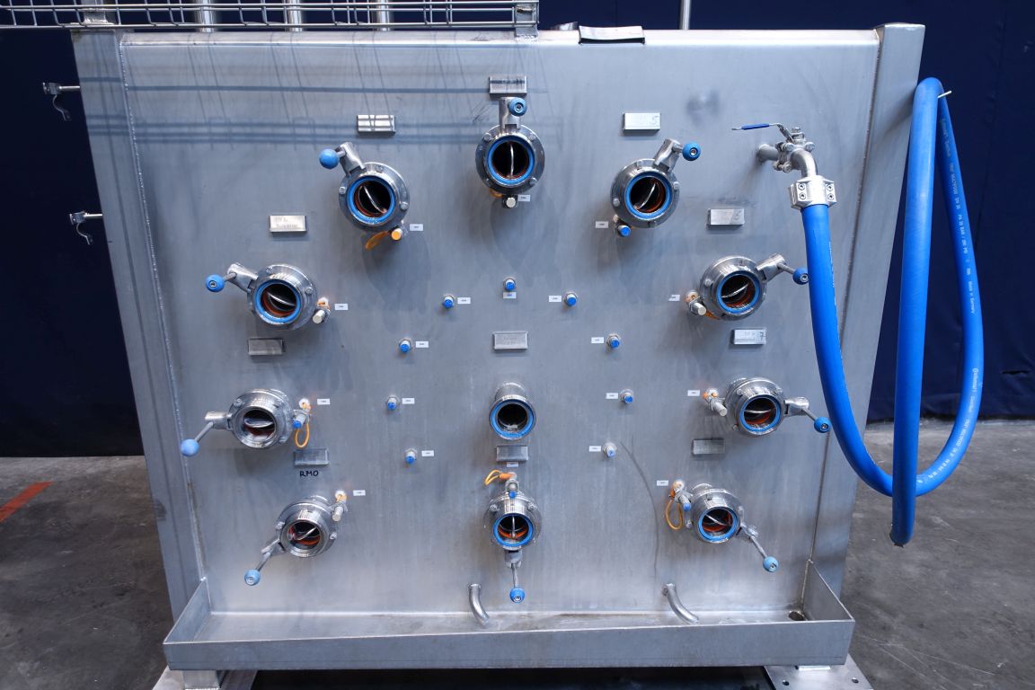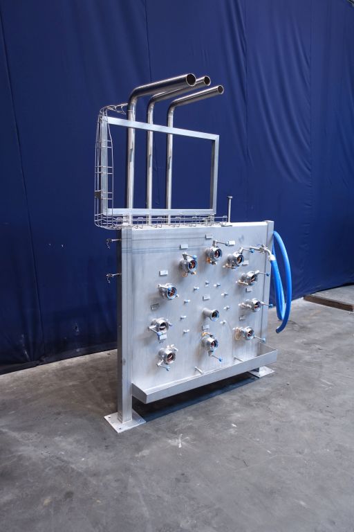 Swingbend panel in front of 4 tanks, for CIP and product outfeed. 11 connections: 2,5'' DIN. All connections with sensors. Total dimensions: 190 x 70 x 230 cm.