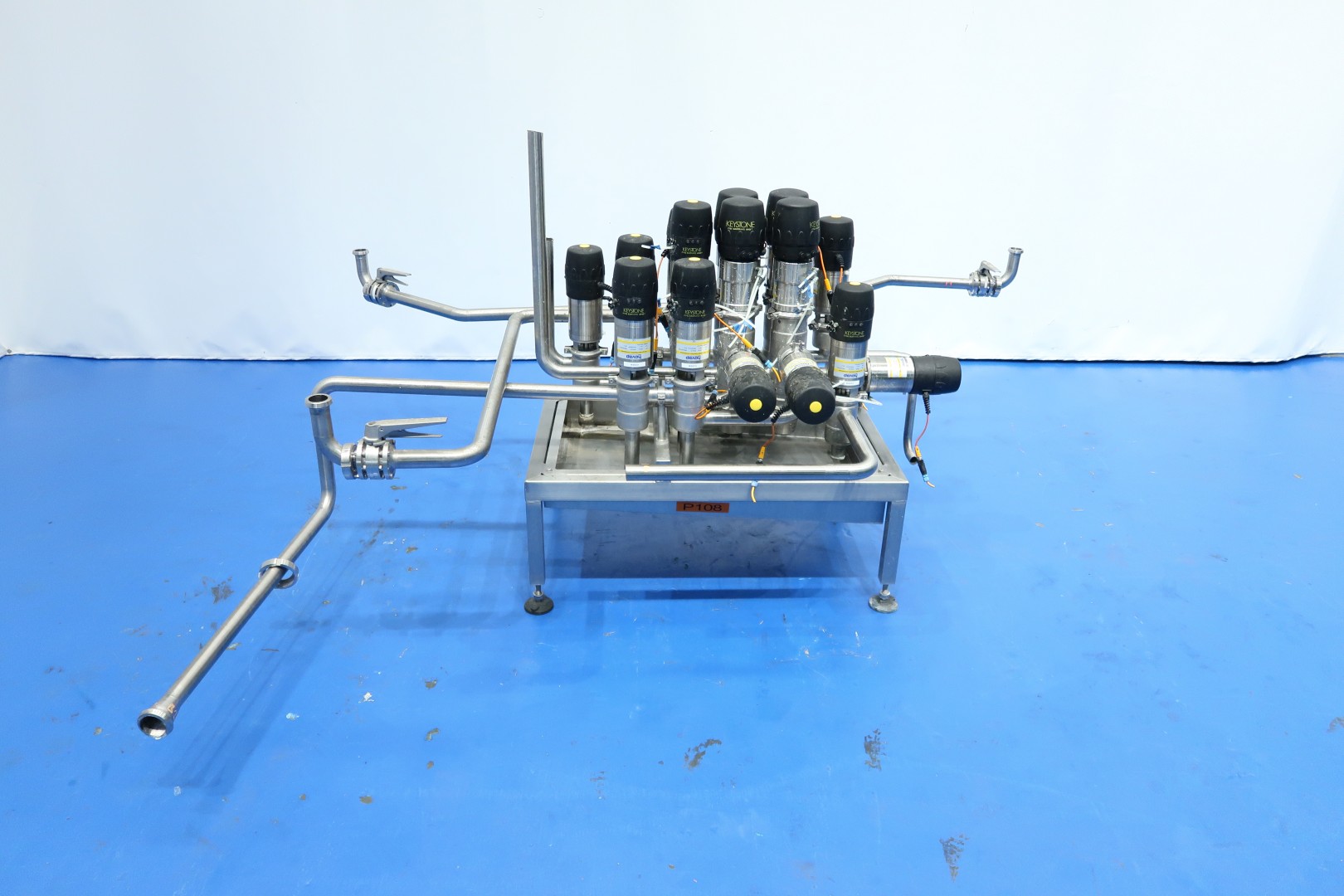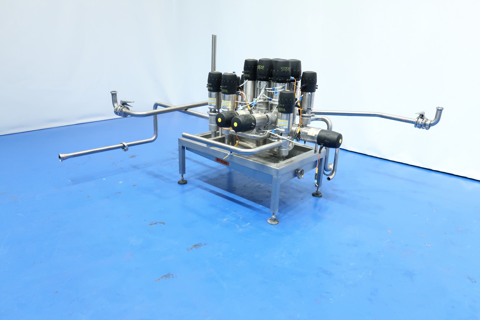 Product valve-manifold, air operated, DN40. With 15 x Hovap and Keyston Smart heads valves: 9x 2Way - 2x 3Way - 4x 4Way and 3x manual butterfly valve. 9 Mixproof valves. Connections DN40. On stainless steel frame with leakage plate with 4 x adjustable feet. Total dimensions: 230x180x135 (lxwxh) cm - weight: 200 kg.