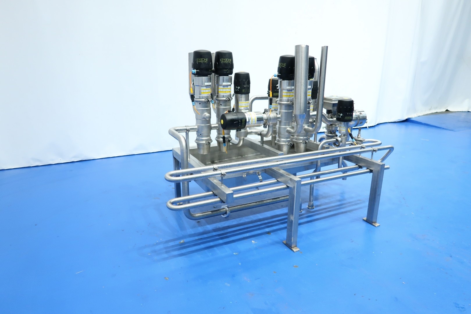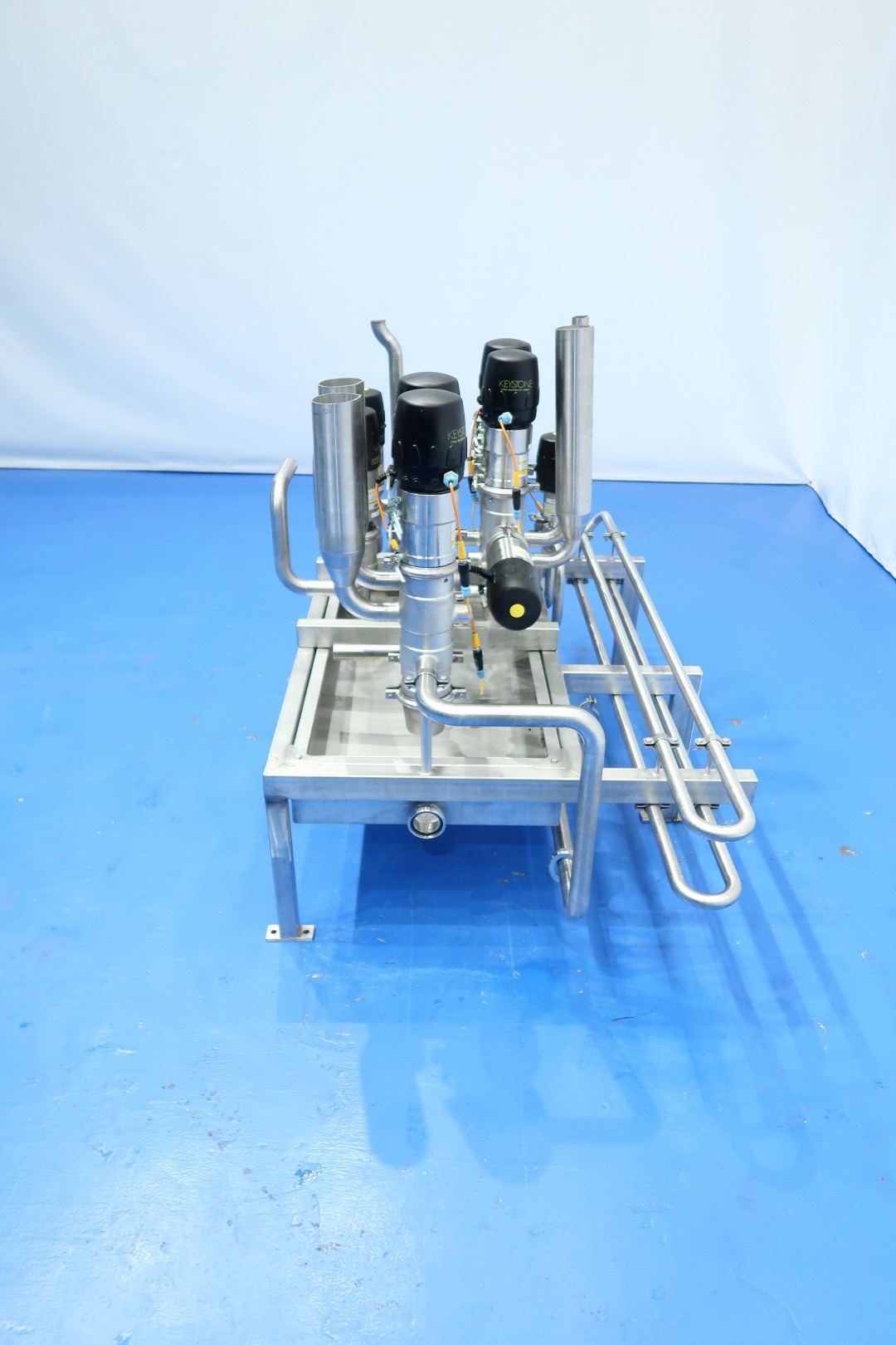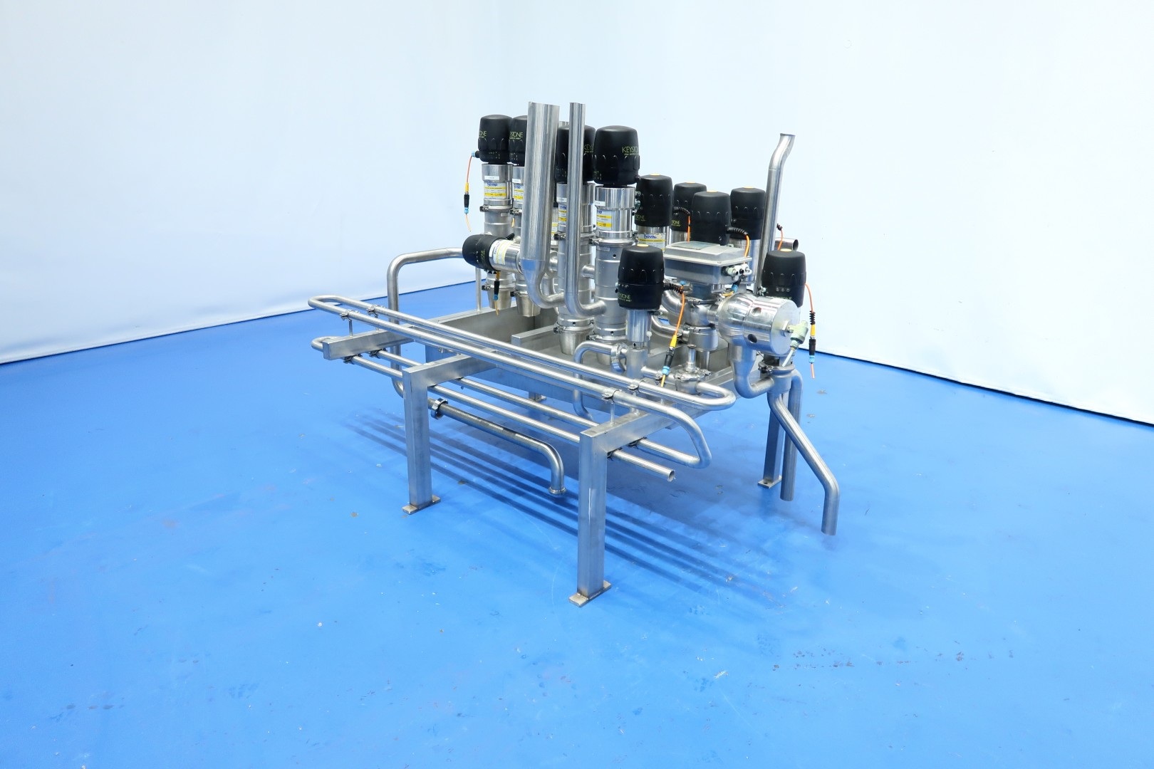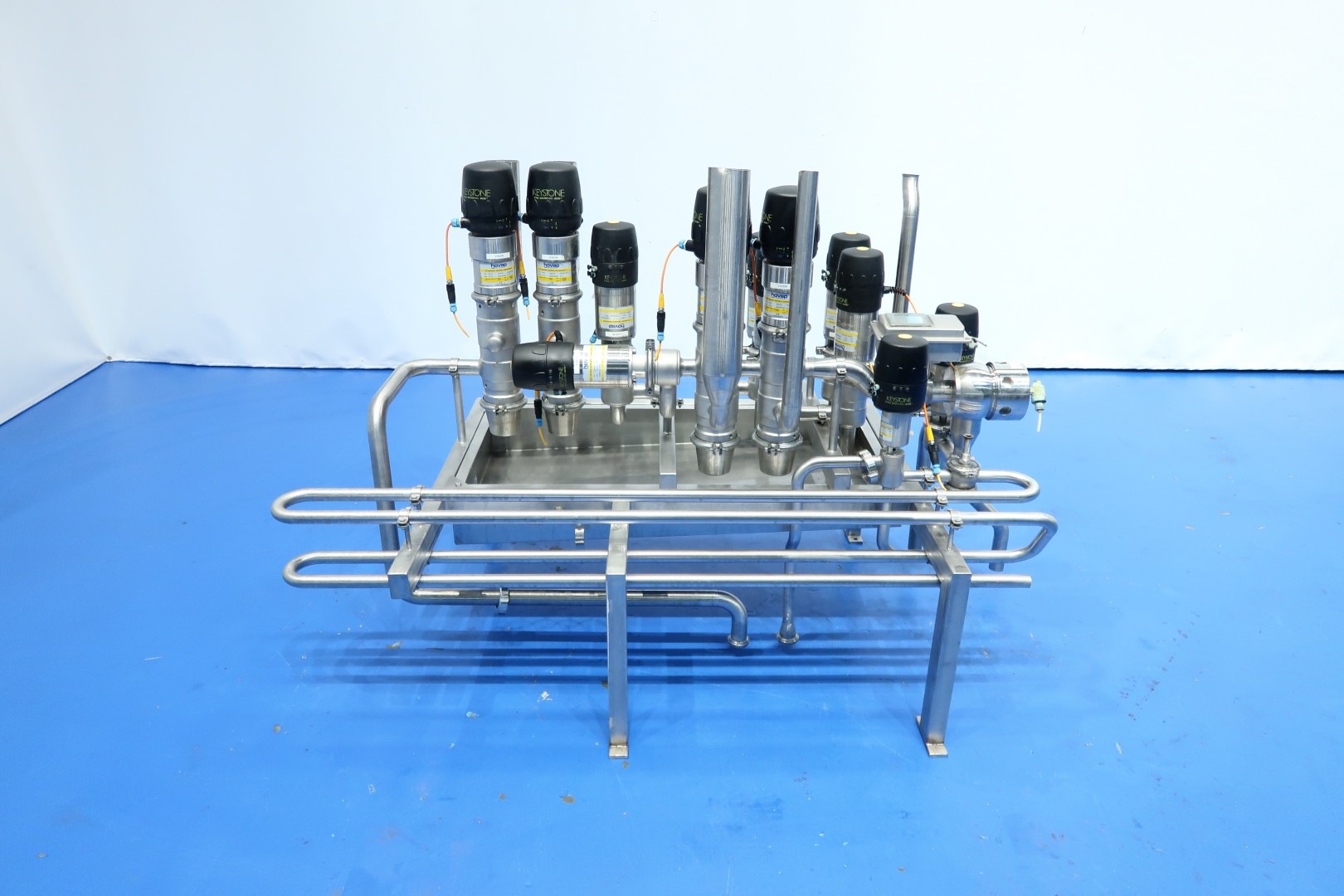 Product valve-manifold, air operated, DN40. With 12 Hovap with Keystone smart heads (mastermind avid F784): valves: 4x 3Way -(2 x Mixproof) 2x 4Way (mixproof) - 6x 2Way. 7 x Mixproof valves. 1 x Conductivity transmitter E&H on varivent connection and colunter pressure valve Tuchenhagen model DHV DN65. On stainless steel frame with leakage plate. Total dimensions: 164x100x117 (lxwxh) cm - weight: 195 kg.
