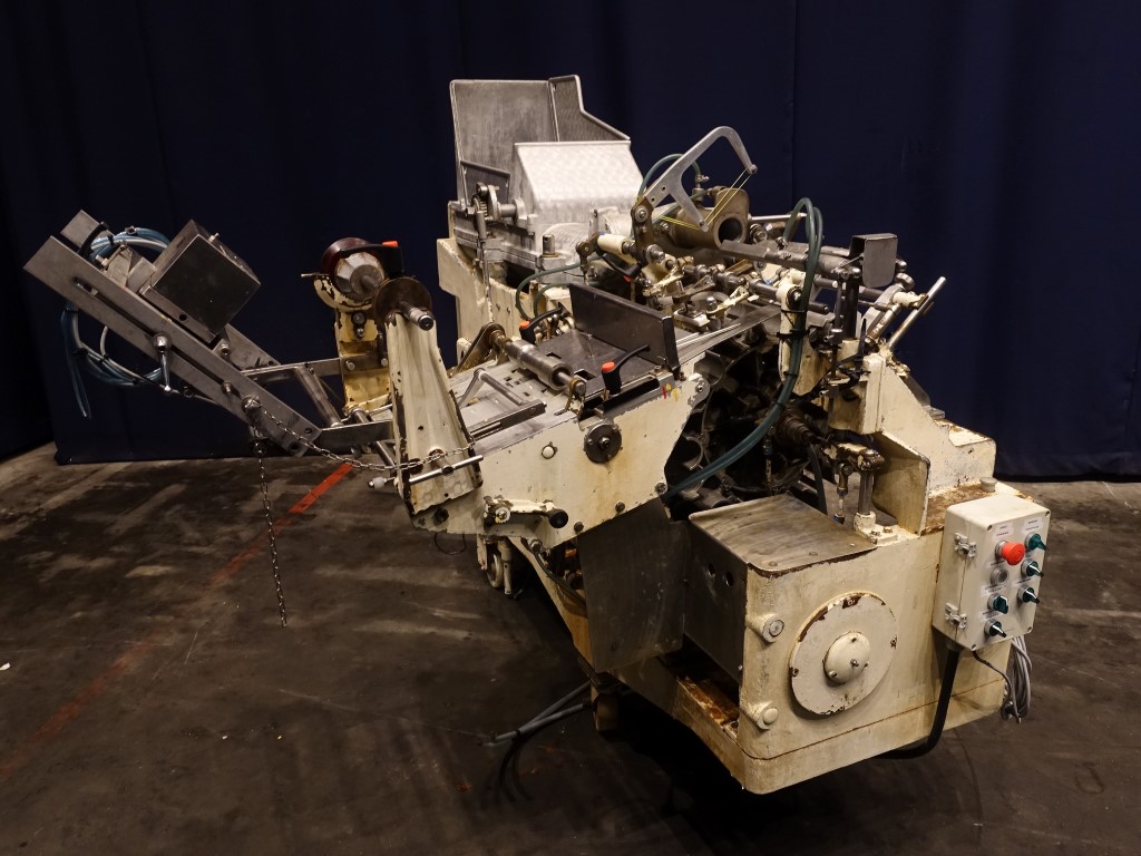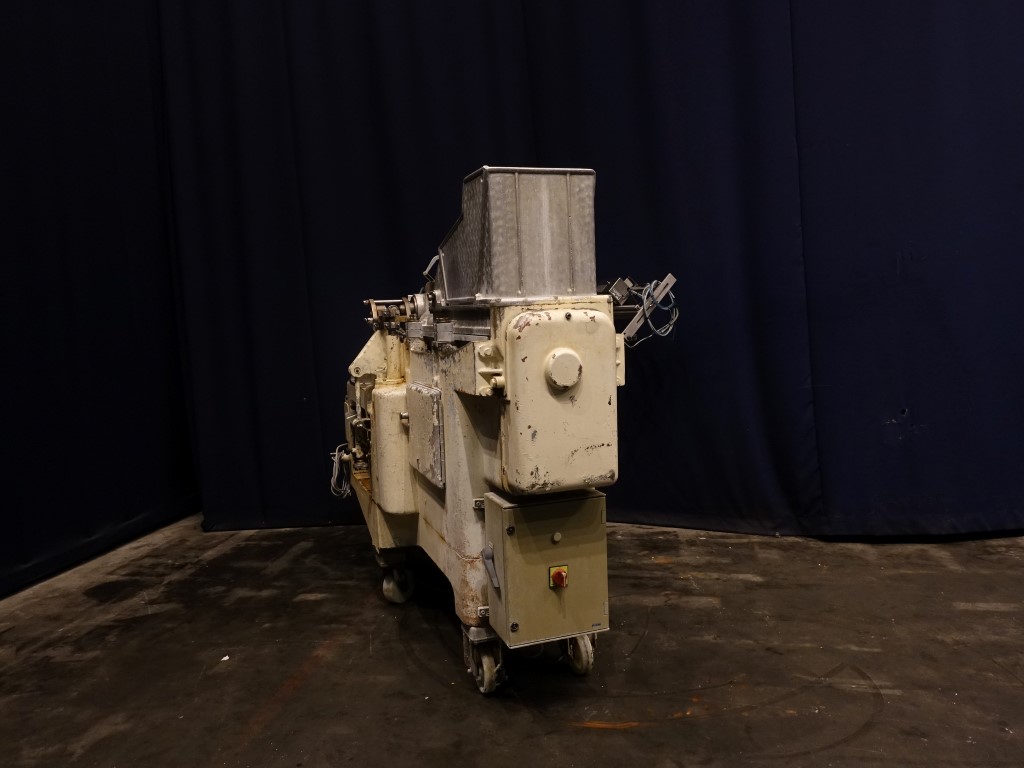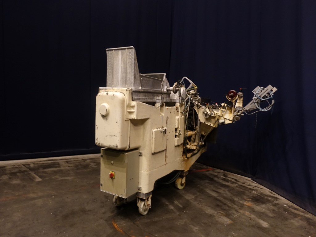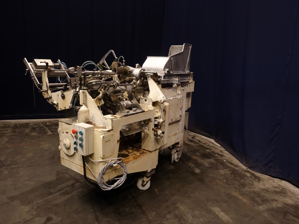 Full Automatic filling and wrapping machine for Rolls of butter (round cylindric shaped) in aluminum foil or parchment paper. Product feed by trough and augers. Date coder by hot foil printer (Metronic 806 serie). Photo cell for print centring device (paper correction by spot mark). 2x Format sets on this machine: 250 gram, ø 45 x 160 mm + 500 gram, ø 55 x 200 mm. Control panel with relay control. Complete with plexiglas safety guards. Total dimensions: 170 x 220 x 180 cm.