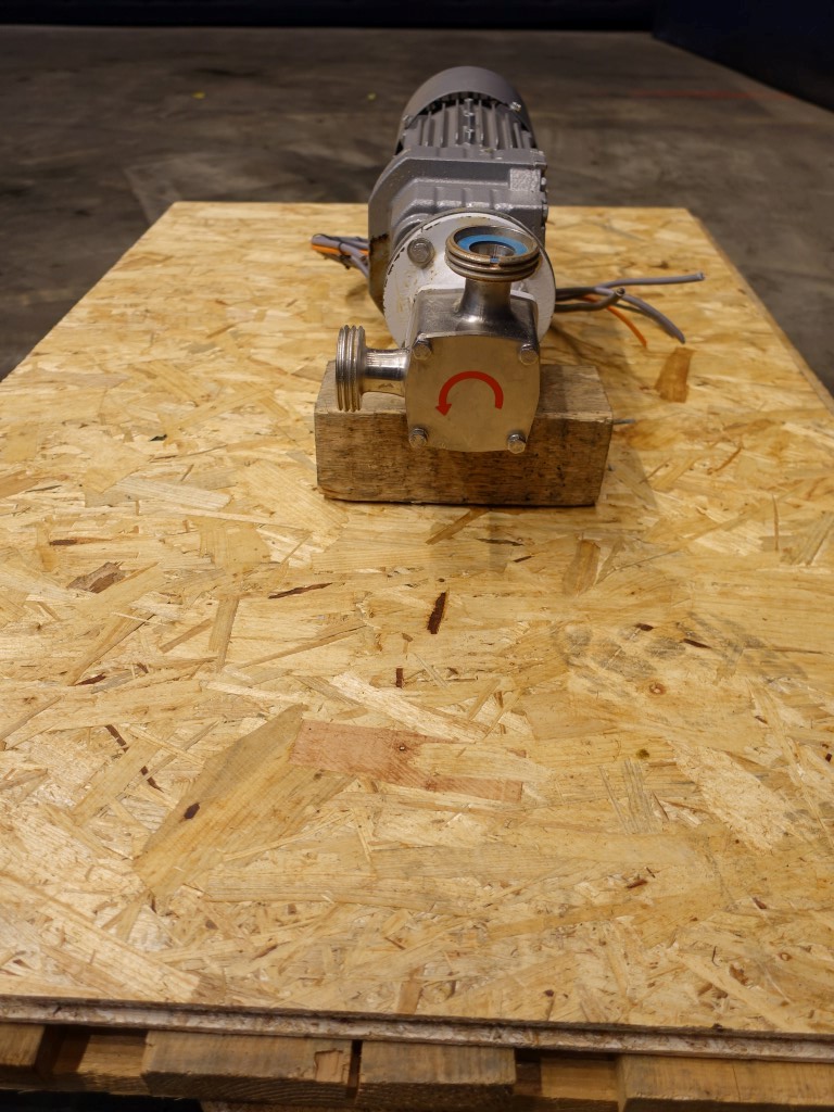Pureflo' Hygienic Self-Priming Flexible Impeller Pump. Current motor: 0,55 kW -2,68 A - n1: 1370 rpm - n2: 244 rpm. Impellor diameter: 65 mm. Up to 330 litres/minute at 3m head @ 1500 rpm. Max. differential pressure 1 bar. Connections: 1'' / 1'', DIN.