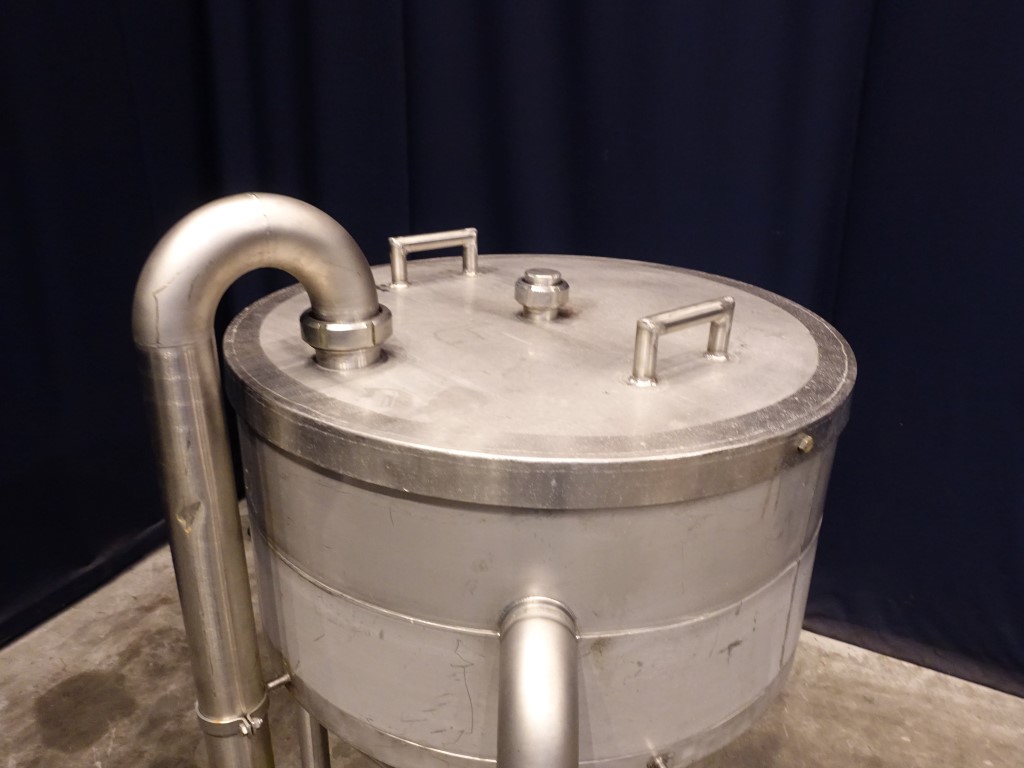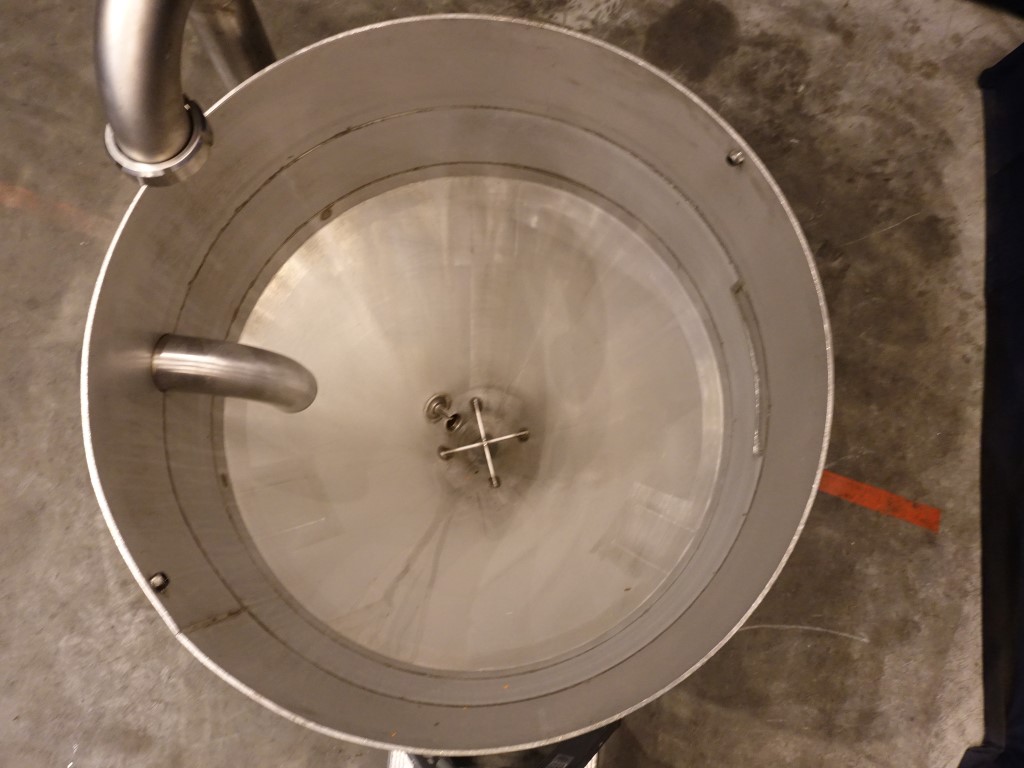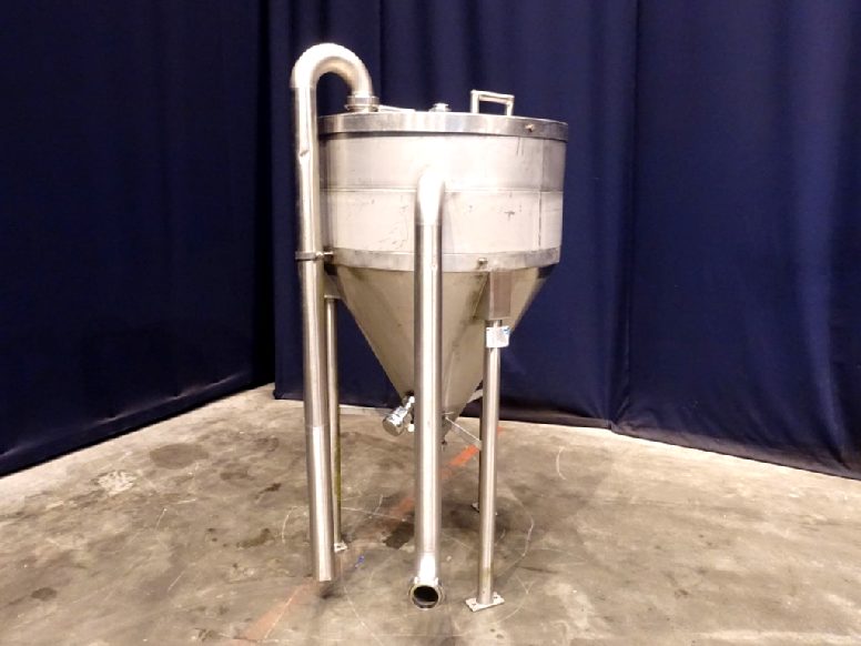 Open conical hopper, open top with cover. Conical. Product outlet, 2,5'' DIN. Outlet height: 40 cm. Connectors for low level. 3 Feet. Inside dimensions of tank: diameter 82 cm, height 40 cm. Total dimensions: 100 x 100 x 100 cm.