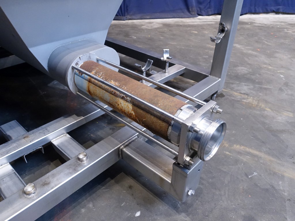 Hopper with 2 augers and excentric screw pump. Bottom of hopper stainless steel with stainless steel augers. Top part of hopper polycarbonate. Open top with 3 covers. 2 CIP spraybowls. Augers and excentric screw pump on 1 motor. Motor: 7,5 kW - 14,7 A - n1: 1430 rpm - n2: 237 rpm. Stator diameter ± 125 mm and stator length: 50 cm. Outlet connection: 4'' DIN. Outlet height: 40 cm. To be used as feed system of blended / grinded cheese after a ribbon or peddle mixer to a cooker. Total dimensions: 180 x 220 x 210 cm.