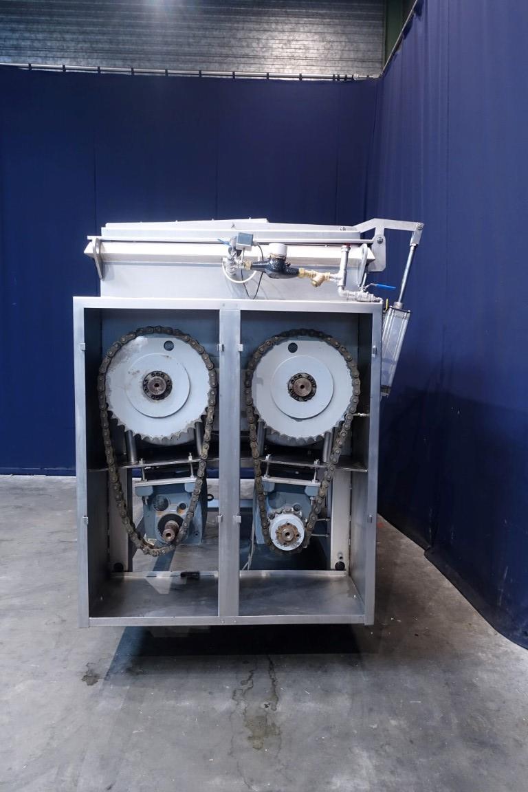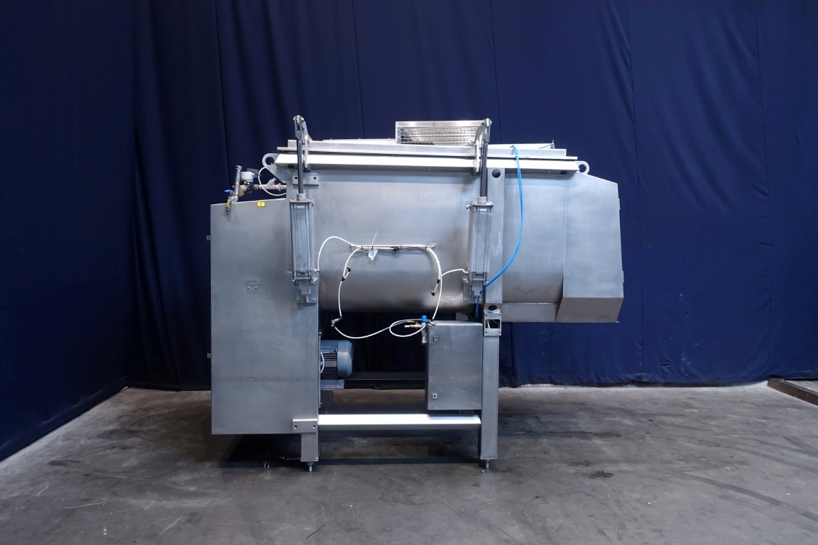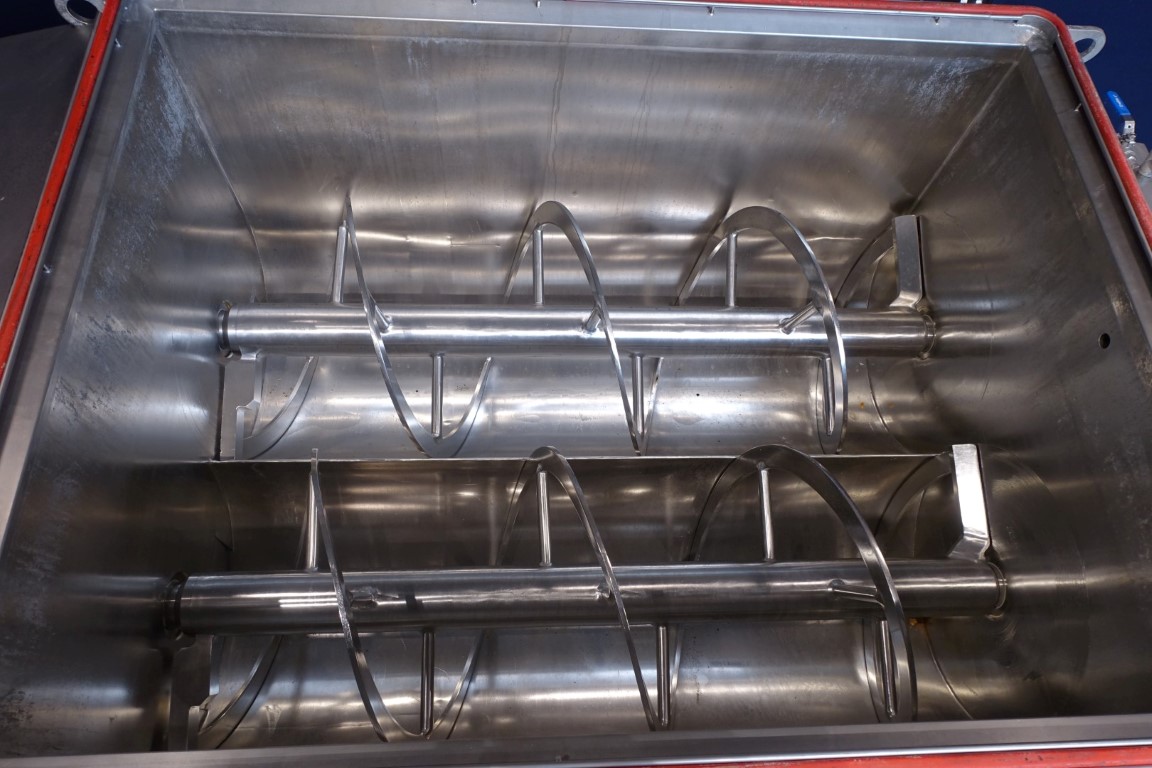 Ribbon blender with 2 axles. Horizontal. Single jacketed. Manual cleanable. Outlet slides, pneumatic controlled. Closed cover with an ingredient inlet, manual. Cover pneumatic tiltable. Motor: 6/7,5 kW - 11,4/15 Amp - 39/78 rpm. Motors already reconditioned. Dimensions product room: 170 x 130 x 120 cm. Total outside dimensions 280 x 170 x 280 cm. Total weight: 2.270 kg. Will be sold together with STN11948 (Infeed conveyor). Last photo is of both together.