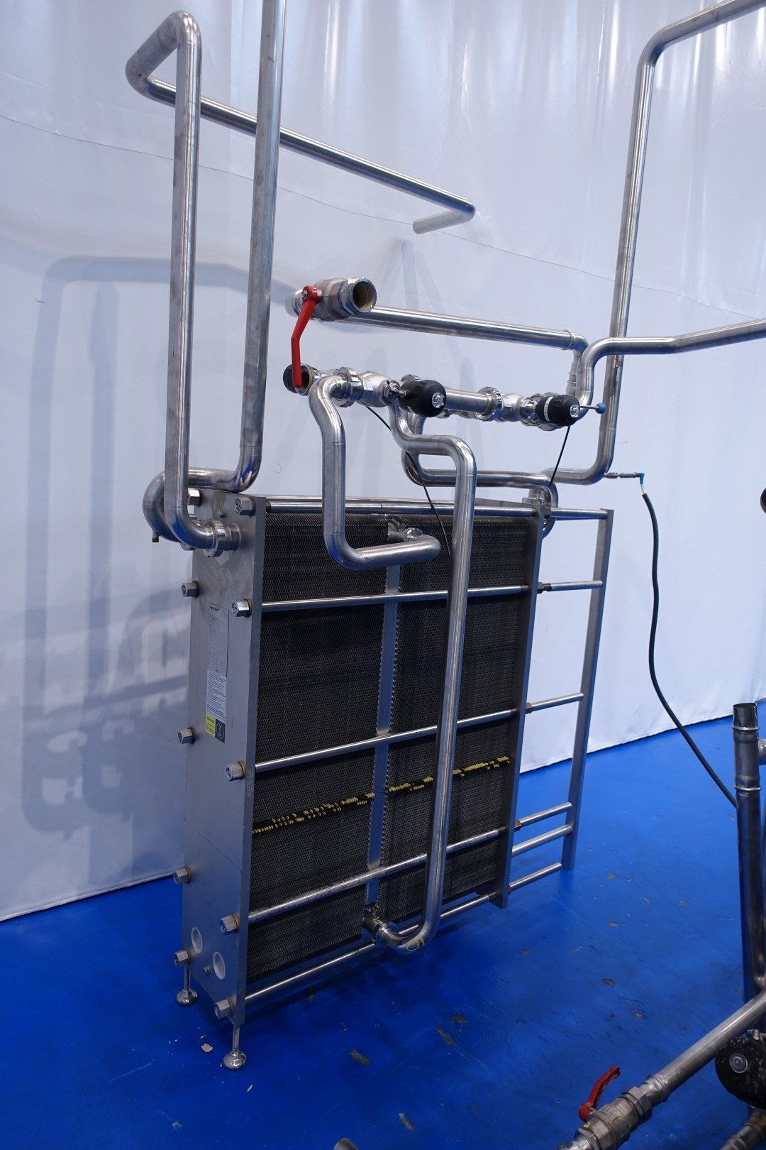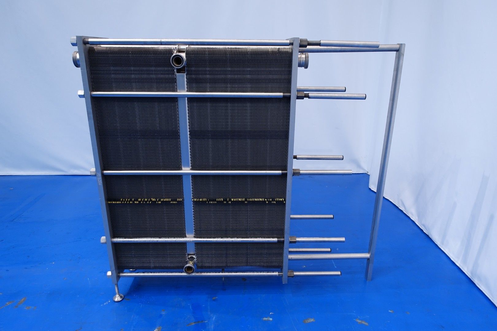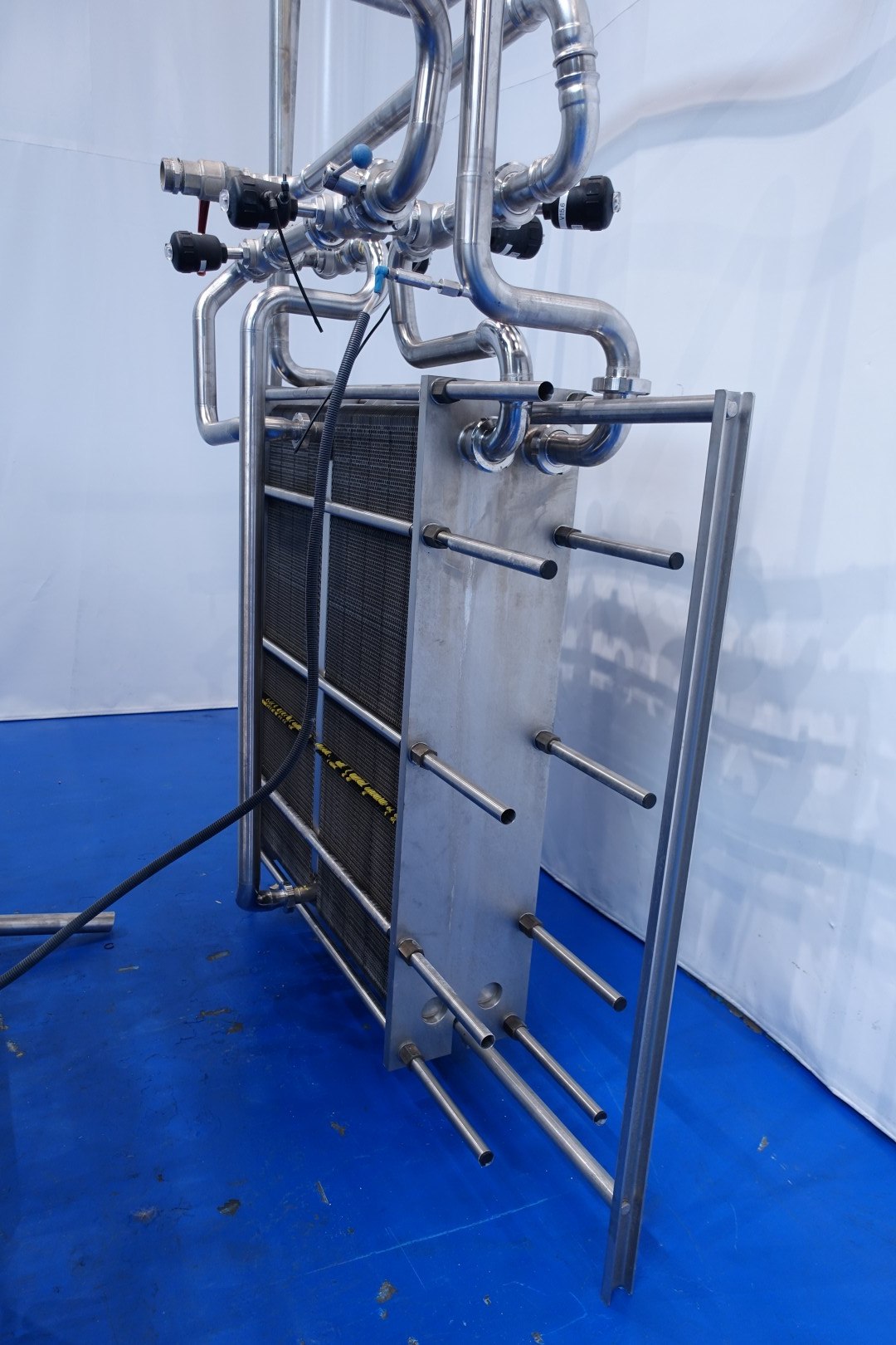 Plate heat exchanger, sanitary (PHE). Test pressure: 13,0 bar - beam length: 150 cm, connections: 8x 2" Din. Currenct configuration: 2 Sections: 121-151 plates (total 272) - Connections head: 2 up, follower 2 up. Weight: 640 kg.