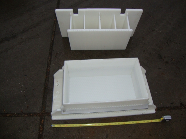Pawl conveyer press for cheese moulds consisting out of 2 rows of 40 cylinders each total 80 press places.1 cylinder 1 mould, With pneumatic infeed system and spray pipe for cip cleaning. Including 2 sets of micro perforated rectangular cheese moulds. First set of 100 moulds for standard ‘Euroblock’ format. Each cheese per mould 15 kg, size: 50x30x20 cm. Second set of 120 Multiforms. 5 rectangular "bread" cheeses per form, Each cheese 3-3.5kg. Size per cheese 25x12.5x±10-12c. Moulds have springs in cover for equal pressing. No controls. Total dimensions: 18.80 x 1.90 x 2.26 mtr.