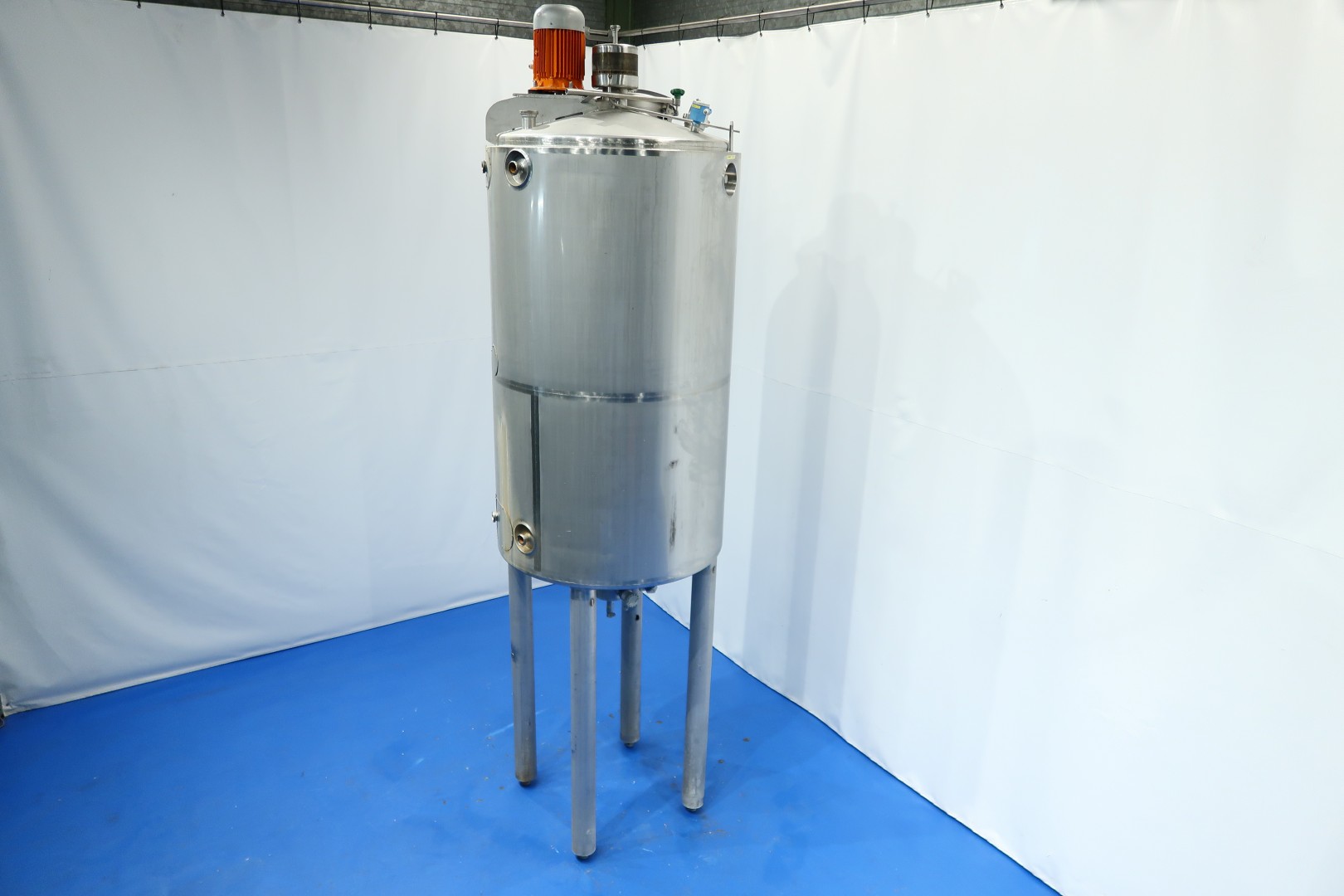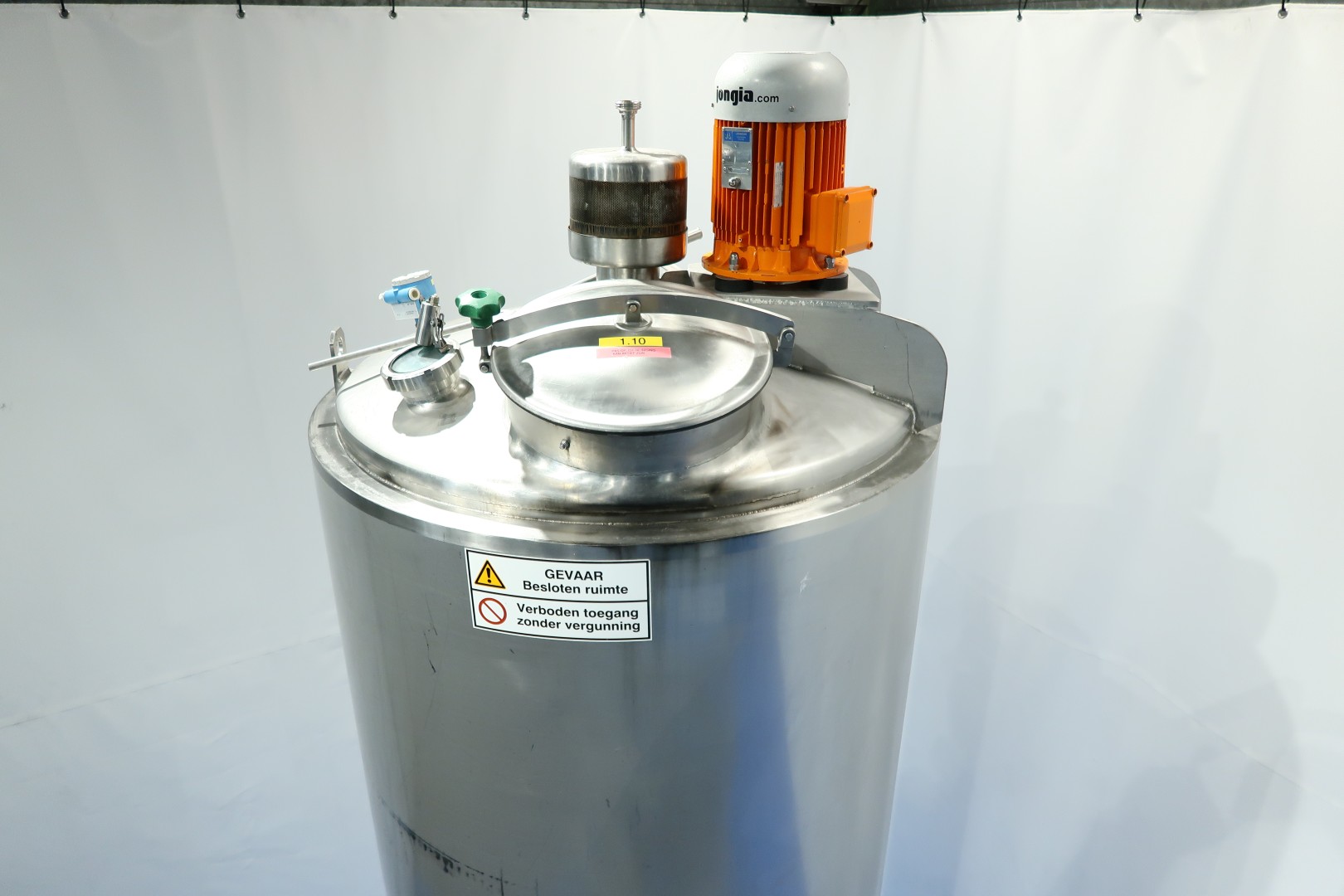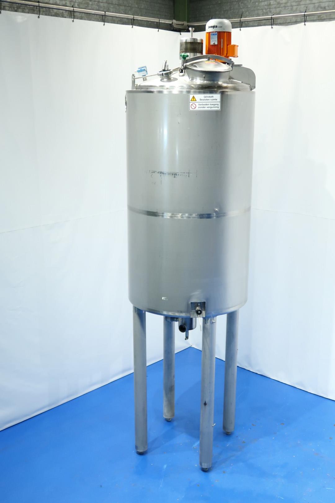 Double jacketed and insulated vertical mixtank. Previously used for cooling and mixing cream. Top driven Jongia JDR propellor agitator, 0,21 KW - n 230 rpm. Jacket: test pressure 10 bar, insulated side and bottom, pressure in tank atmospherique. Product Outlet 1 x 3" Din (no valve). Outlet height: 147cm. With cleanable sample valve. In bottom 3 x sensor: temperature, pressure and level. In top levelsensor and safety sensor on manhole-lid. With breather, sightglass with lamp 1 cip spray bowl, manhole in top round diameter 43 cm. 4 Adjustable feet, innner dimensions of tank diameter 120 cm - cylindrical height 220 cm. Documentation including drawings available. Outer dimensions: 130x130x465 (lxwxh) cm - weight: 715 kg.