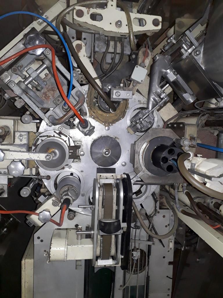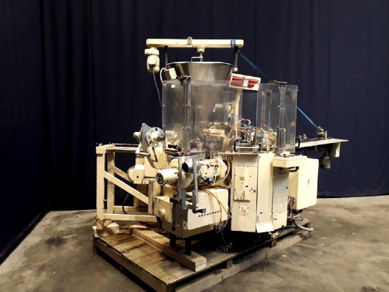 Automatic in box filling and wrapping machine for round portions of processed cheese. Single head piston doser with electrik heated hopper (± 75ltr), with scraper agitator. Product: processed cheese, semi liquid, hotfill. Working principle: Preformed round carton boxex infeed by conveyor, Foil infeed from reell. foil cut and formed into the box, filling, top foil from roll, forming of the foil, dispensing top foil and tip seal, folding, sealing, outfeed by conveyor along the infeed conveyor. 2 Suction blowers for waste foil. Excluding controls.