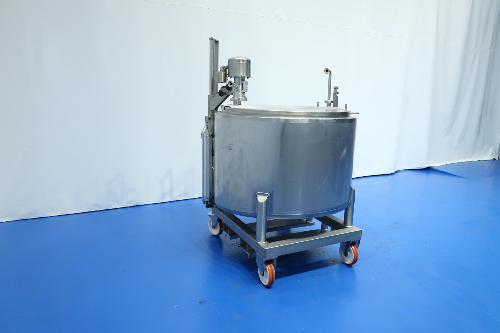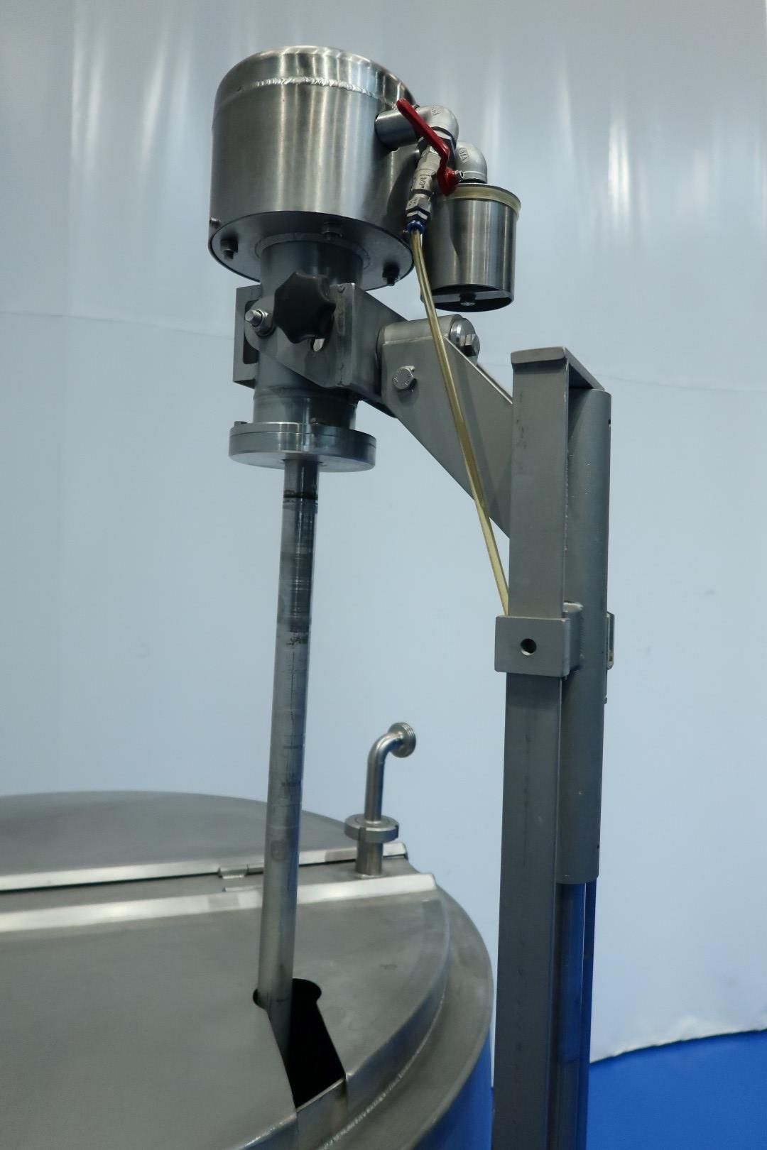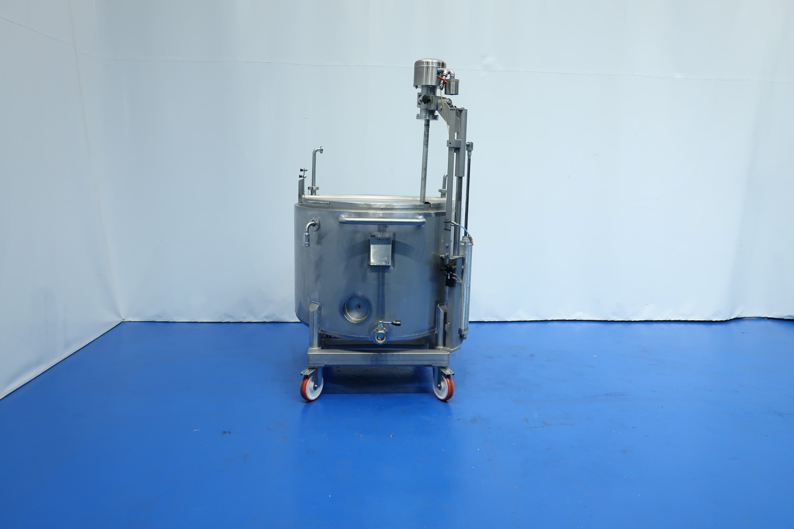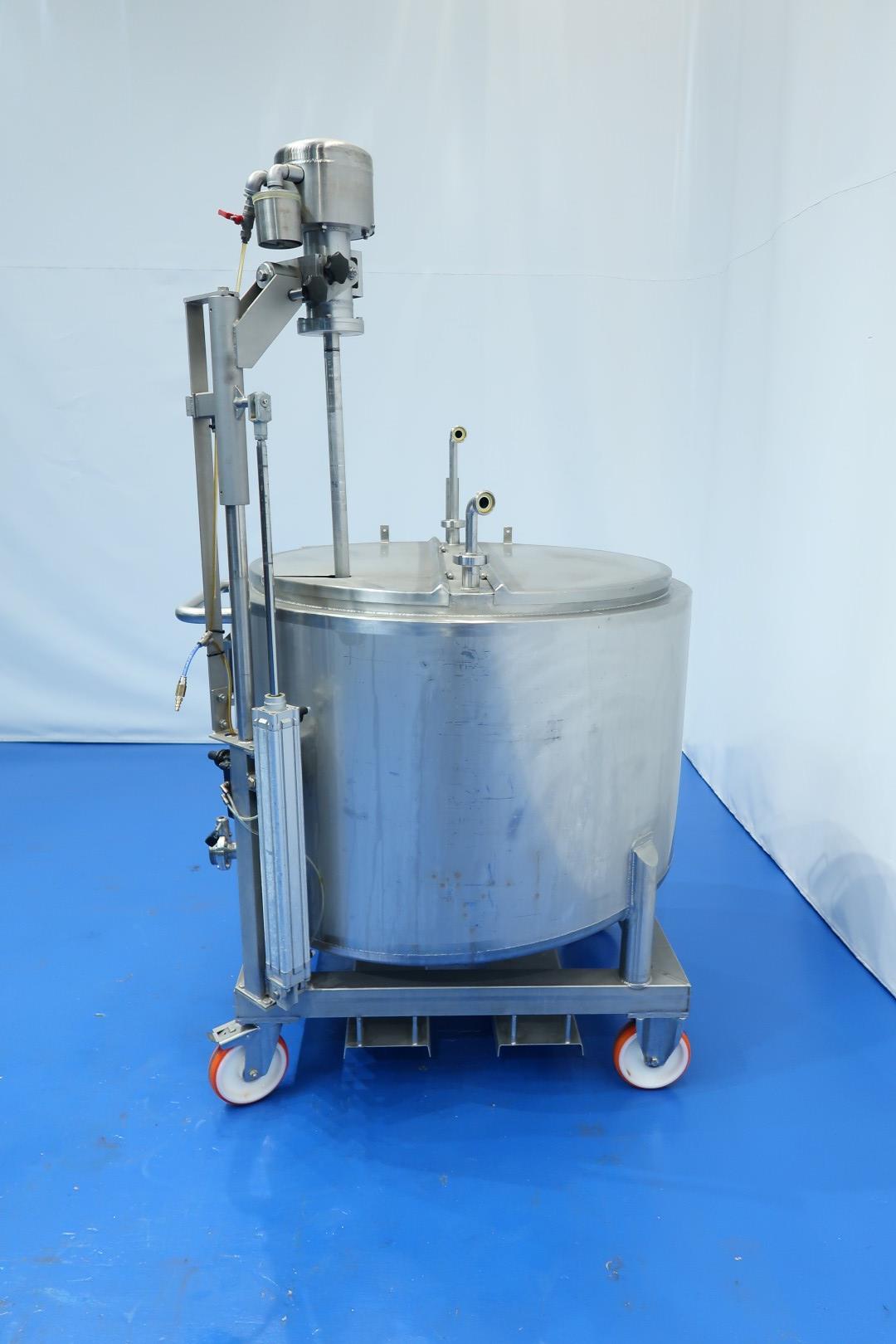 Double jacketed mix/process tank on mobile SS frame. Top side driven propellor agitator with lifting option. Pressure in double jacket 5 bar and Volume 3,7 ltr/ 160 °C. Complete agitator can be lifted via an air cilinder. Jongia TD 35-L agitator motor driven by compressed air. Manual speed variation by a ball valve. Outlet manual butterfly valve, connection 3" Din. Test video available. Total dimensions: 130x122x189 (lxwxh) cm - weight: 405 kg.