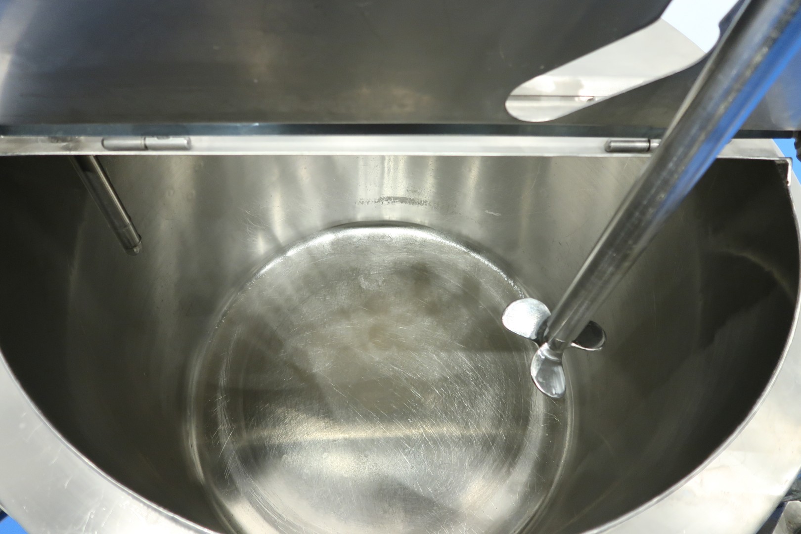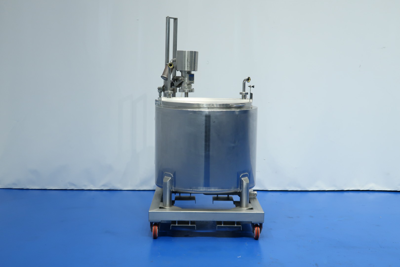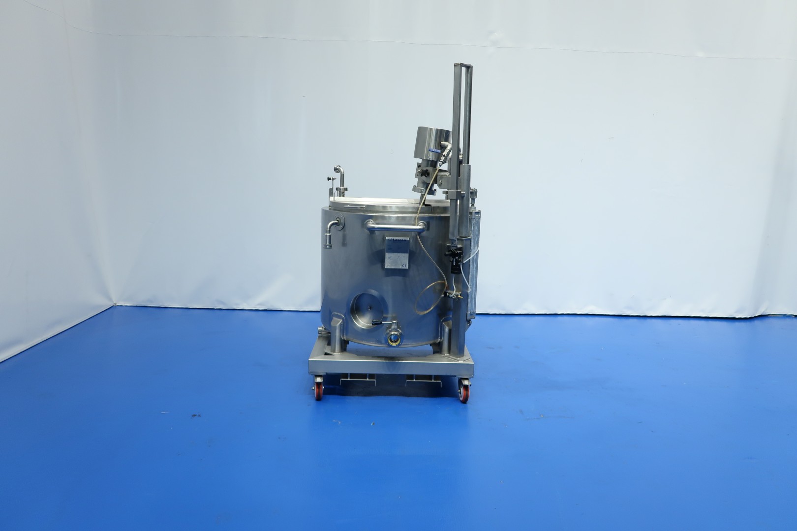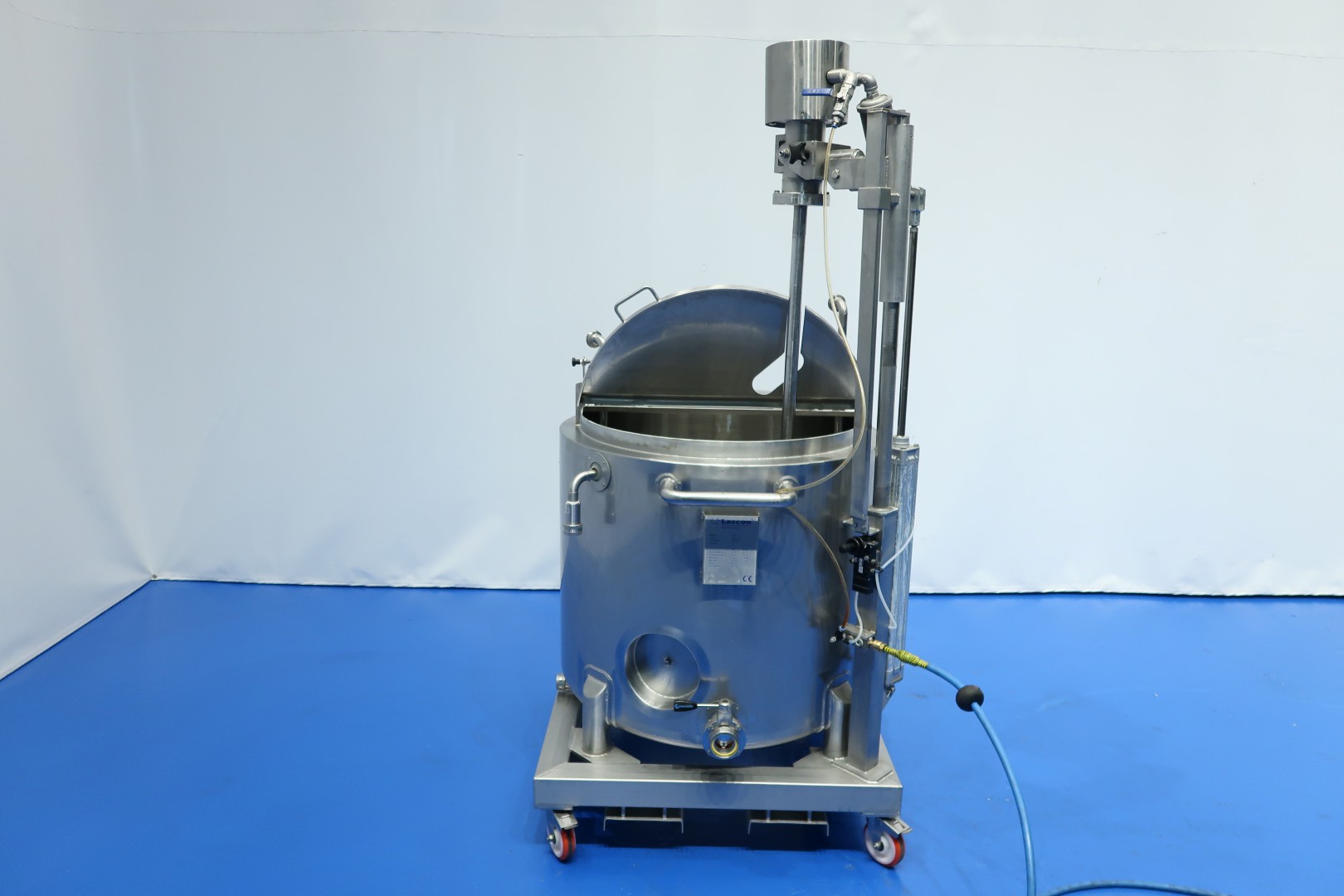 Double jacketed process tank on mobile SS frame. Top side driven agitator with 'propellor' stirrer. Pressure in jacket: 5 bar and volume: 1,0 ltr, temperature: 160 °C. Complete agitator can be lifted via an air cilinder, Jongia TD 35-L agitator motor driven by compressed air and speed control by manual ball valve. Outlet manual butterfly valve, connection 3" Din. video available. Total dimensions: 105x95x190 (lxwxh) cm - weight: 275 kg.