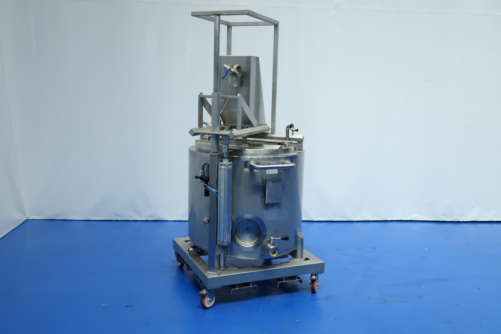 Double jacketed process tank on mobile SS frame. Top side driven agitator with 'cup' stirrer. Pressure jacket: 5 bar and volume: 1ltr. temperature: 160 °C. Complete agitator can be lifted via an air cilinder. Agitator motor driven by compressed air variable speed by manual ball valve operation. Outlet manual butterfly valve, connection 3" Din. Test video available. Total dimensions: 100x95x206 (lxwxh) cm - weight: 330 kg.