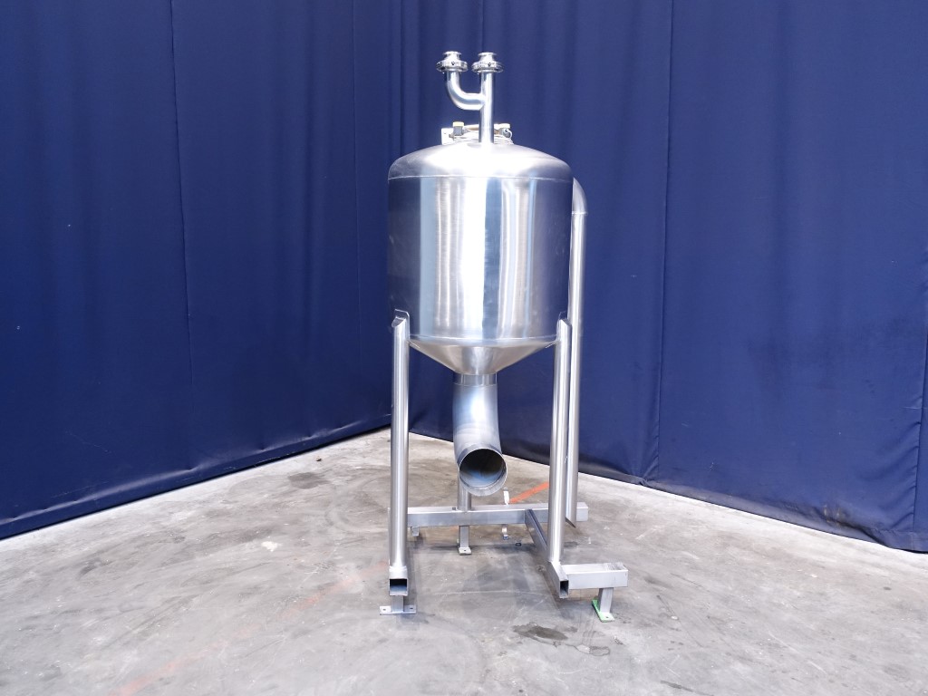 Vertical level tank. Pressure in tank atmospherique. Conical bottom. Product outlet, 8'' and outlet height: 70 cm. Material: 304L. Connections for: high and low level sensors. Manhole in top, round, diameter 200 mm. 4'' Overflow tube. Butterfly valves on inlet. 4 Feet. Inside dimensions of tank: diameter 800 mm and height 600 mm. Total dimensions: 110 x 110 x 240 cm.