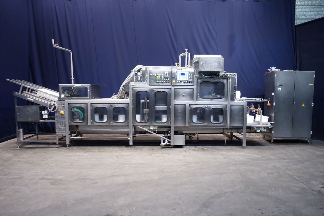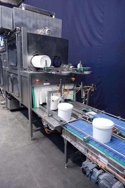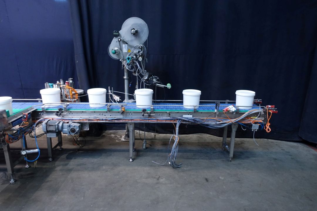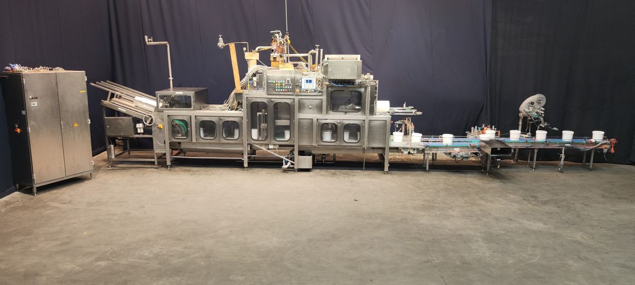 2 Line bucket filling machine. Filling volume from 2 up to 10 liter. Buckets with handle. Currently set on buckets of 5 kg. Bucket 5 kg: diameter 220 mm and height 160 mm. Automatic system: destacking, bucket decontamination (by spray a peroxide mix in the bucket), turning system, filling by flow transmitters, snap cap cover decontamination and applying on bucket by sliding system, after push station. Whole machine under sterile air over pressure system, Automatic CIP cleanable. Controls: Siemens Simatic S5. Including duo outfeedconveyor, converting with pusher two one lane. Can be delivered with two x original labellers, different stock-items (STN15235 and STN15236). Power: 400 V AC, 24 V DC, 50 Hz, total dimensions including conveyor 1160 x 170 x 290 cm. Dimensions filling machine 740 x 130 x 290 cm. Documentation available: operation manual and electrical scheme.