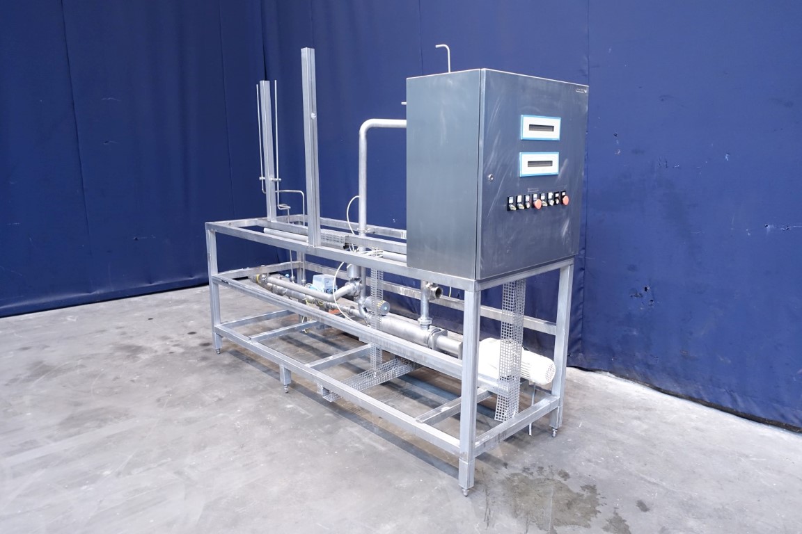 Inline Quark mixing device to add Cream to fresh cheese to increase the fatt content. 2 ingredients, Cream and fresh cheese are added together controlled by 2 flowtransmitters (make ABB). After injecting the cream the 2 ingredients are mixed together in a rotary mixer Miromatic model KME100 (100mm diameter with a variable speed paddle mixer inside), skid mounted including all by-pass and product valves, 3 steamable sample valves, incomplete controls (no program).