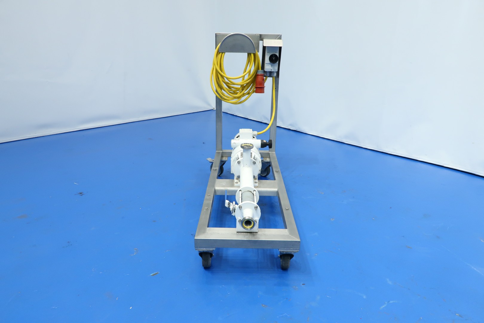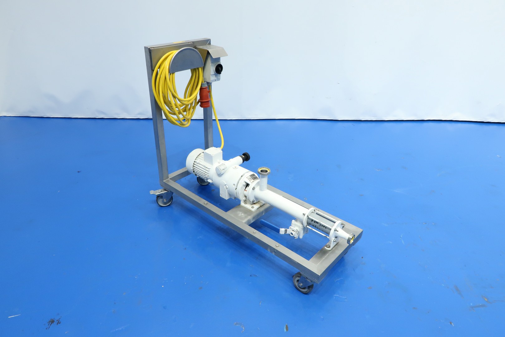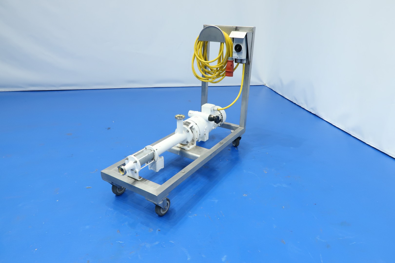 Eccentric screw - Mono pump mounted on mobile SS frame with on/off switch. Max pressure 2 bar - max temperature 50 °C. Current motor: 0,55 kW - 1,5 A - 1.380 rpm - 50 Hz. N1: 1.380 rpm - i = 2,36 - n2 100-593 rpm. Manual adjustble reductor. With non sanitairy manual drain valve. Connections: (in) 1" Din / (out) 1" Din. Total dimensions: 110x40x93 (lxwxh) cm - weight: 60 kg. capacity estimated