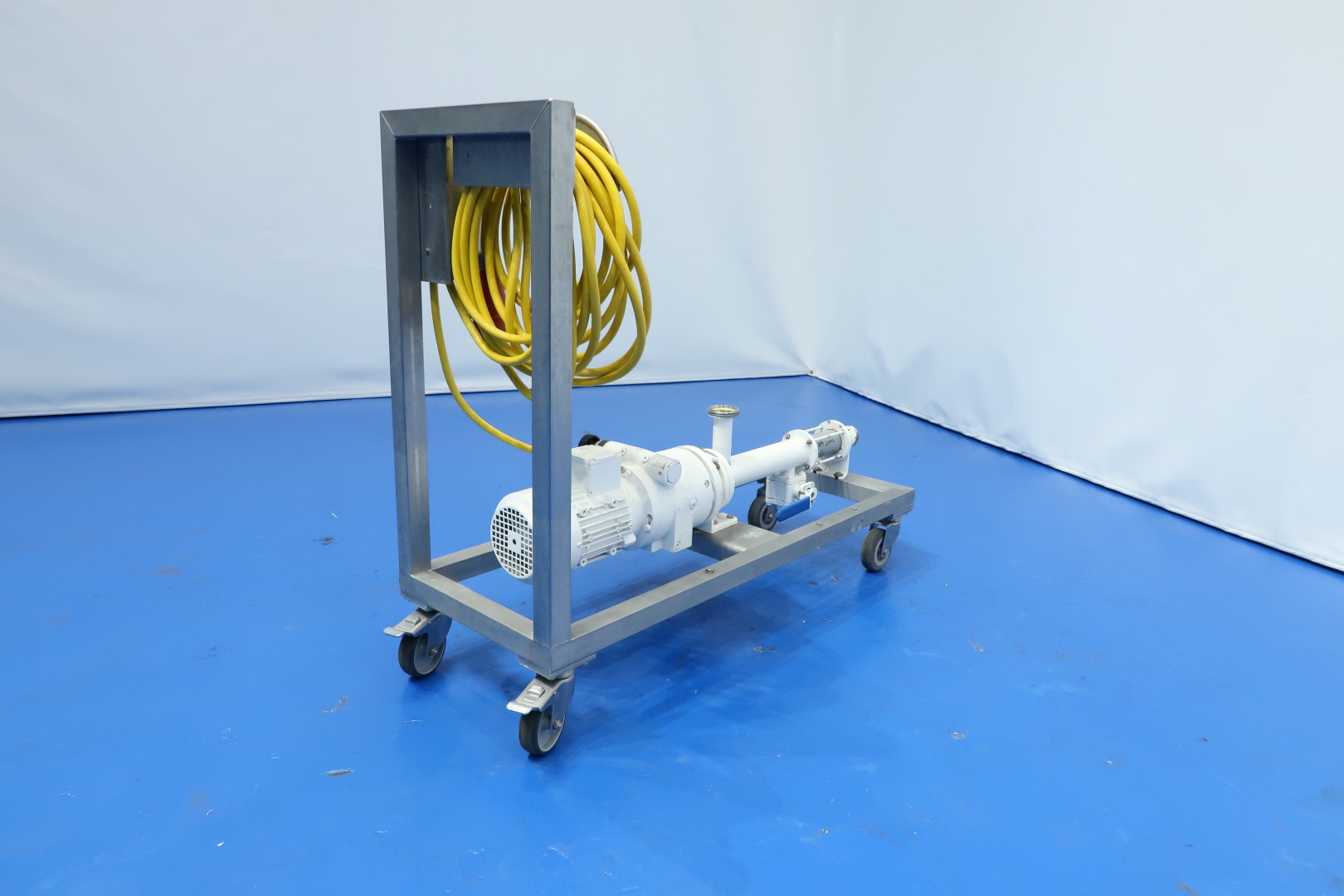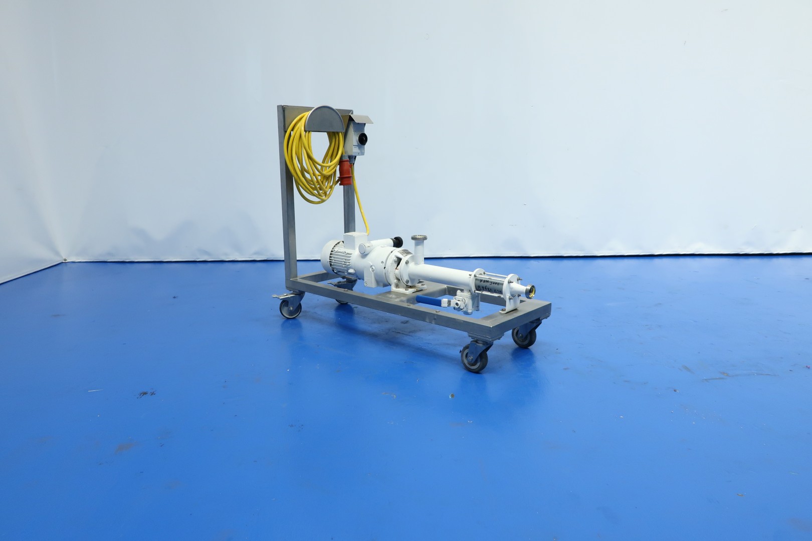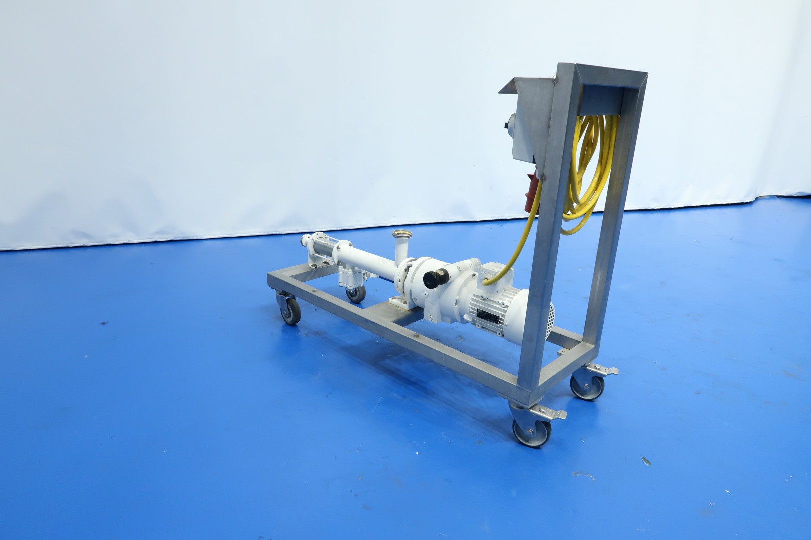 Eccentric screw - Mono pump mounted on mobile SS frame with on/off switch. Max pressure 2 bar - max temperature 50 °C. Current motor: 0,55 kW - 1,5 A - 1.380 rpm - 50 Hz. N1: 1.380 rpm - i = 2,36 - n2 100-593 rpm. Manual adjustble reductor. With non sanitairy manual drain valve. Connections: (in) 1" Din / (out) 1" Din. Total dimensions: 110x40x93 (lxwxh) cm - weight: 60 kg. capacity estimated