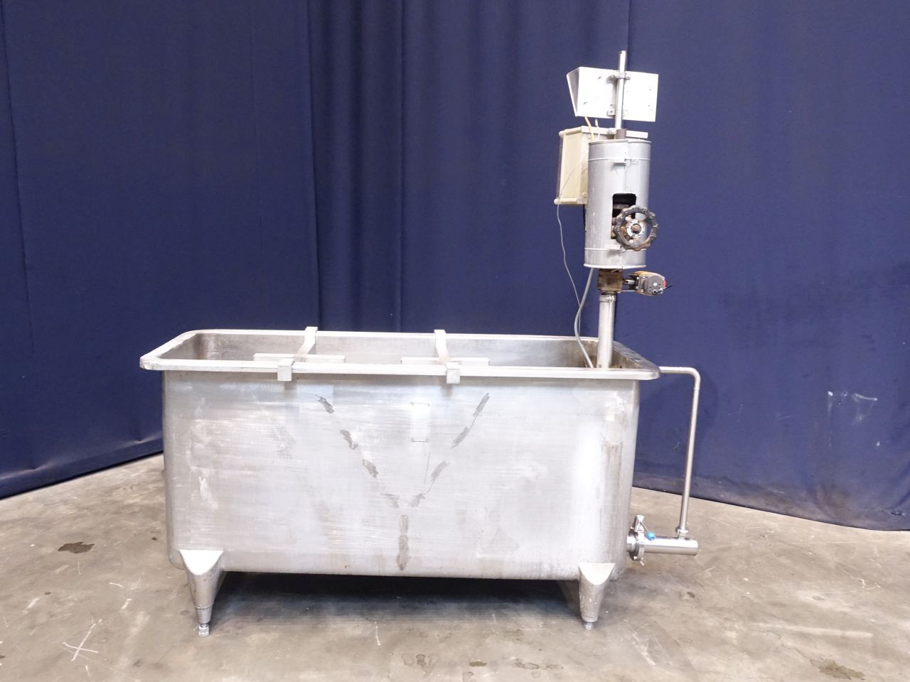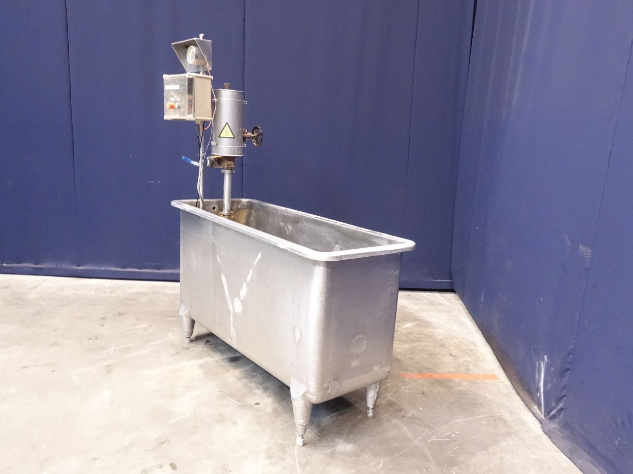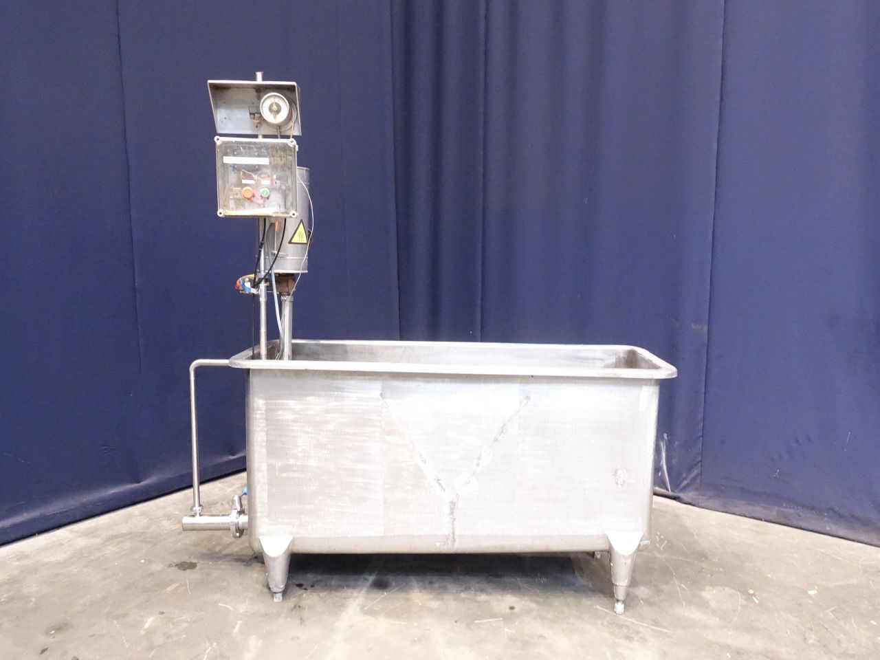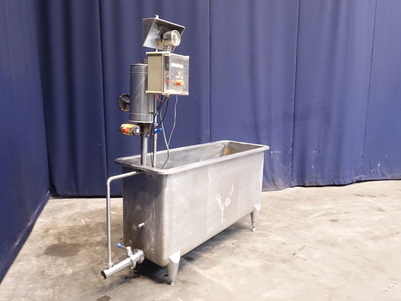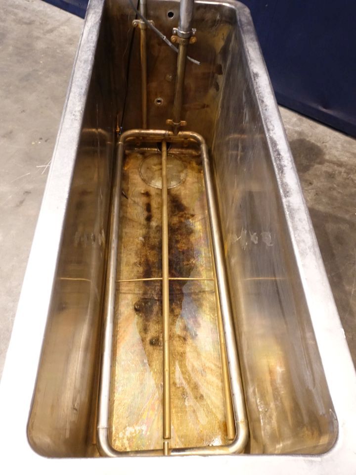 Open leveltank with heating coil. Open top. Flat to the side. Product outlet 2,5'', outlet height: 20 cm. Manual butterfly. 4 Adjustable feet. Inside dimensions of tank 152 x 49 x 50 cm. Total dimensions: 190 x 65 x 190 cm. Previously used for cleaning filters.