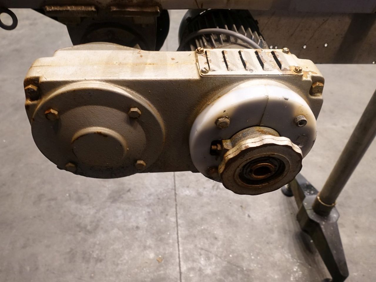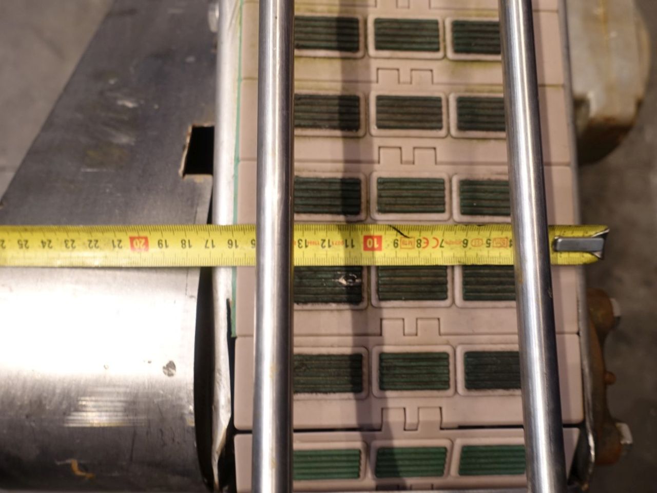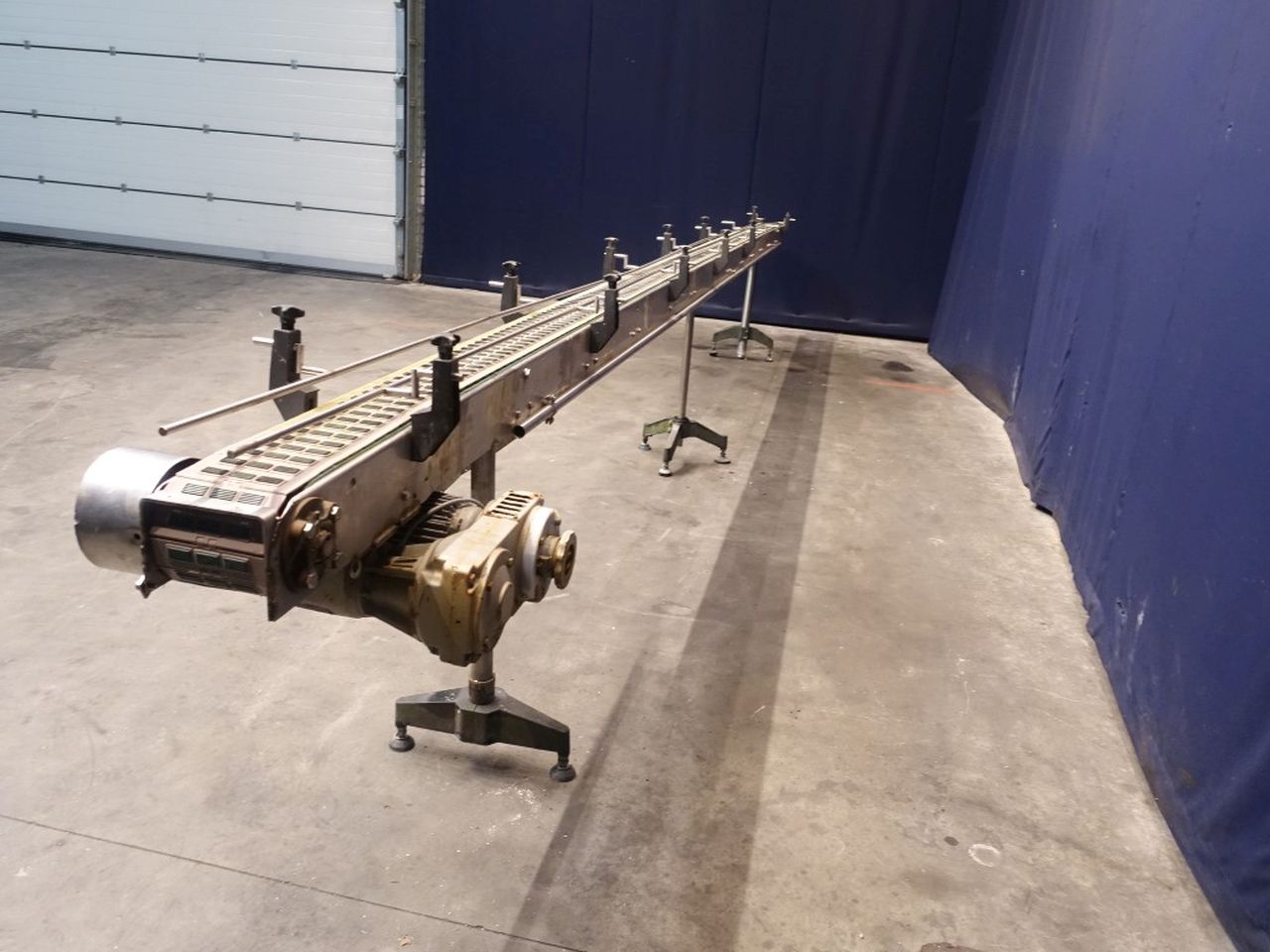 Chain conveyor. Effective Belt: 15 x 710 cm. Motor: 0,55 kW - 1,8 A - 915 rpm. Variable speed with manual variator. Horizontal. Total dimensions: 720 x 50 x 60 cm.