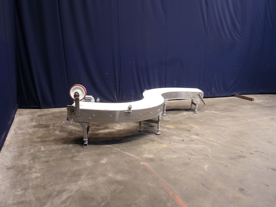 Chain conveyor with S-corner. Effective Belt: 35 x 420 cm. Motordetails unknown (typeshield not readable). Horizontal. Total Dimensions: 400 x 70 x 80 cm.