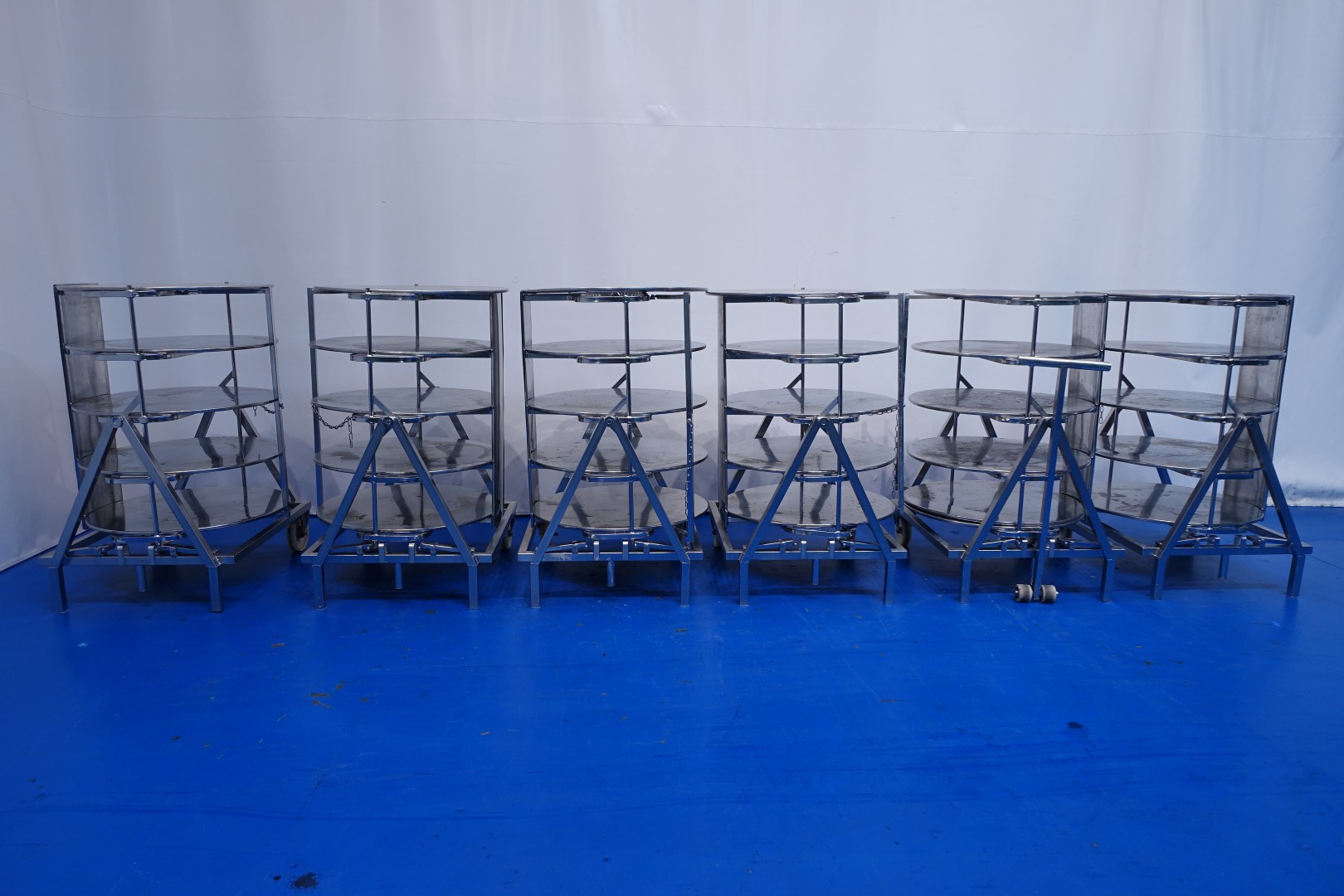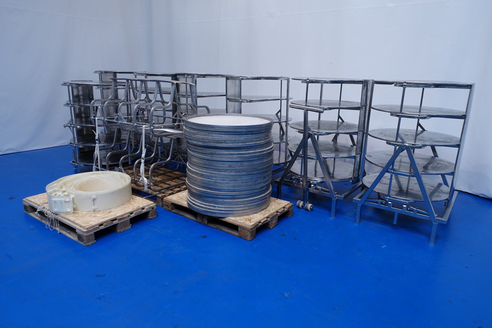 9 Brining containers which to place Big round cheeses in a brine bath in stainless steel. Possible to rotate. with 7 trolleys to move thise containers one side has wheels, other side legs. Used on Emmertaler cheeses of round 75cm approx 85kg each. 4 Cheeses can be placed inside, diameter of plate 90 cm, height between layers ca 23 cm. Leakage/drying nets can be placed under. Complete set consists out of: 9 Brine frames, 7 x mobile cart - 1 x static cart - 32 nets - 12 plastic tightening strips (placed around cheese when brining start to keep the round shape - 1 x lifting/move-beam. Dimensions per cart ca.: 107x107x145 (lxwxh) cm - weight per piece ca. 108 kg.