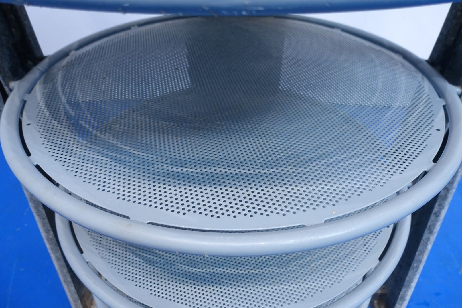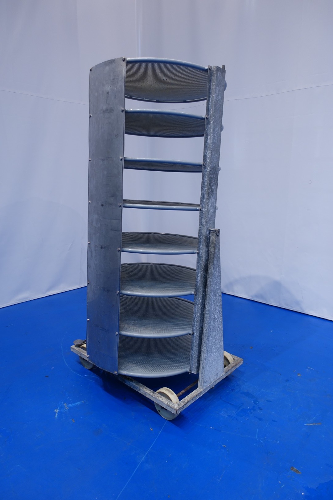 Cheese storage trolley for the maturing room, but specially for heavy round cheeses (up to 90kg round 75- 85cm), on mobile steel frame (round), Turnable. Used for Emmertaler cheeses. 7 cheese per rack placed inside. Each plate with perforated holes. Space between layers 25-26 cm. In total 4 complete sets. Dimensions: 115x80x218 (lxwxh) cm - weight: 115 kg per piece.