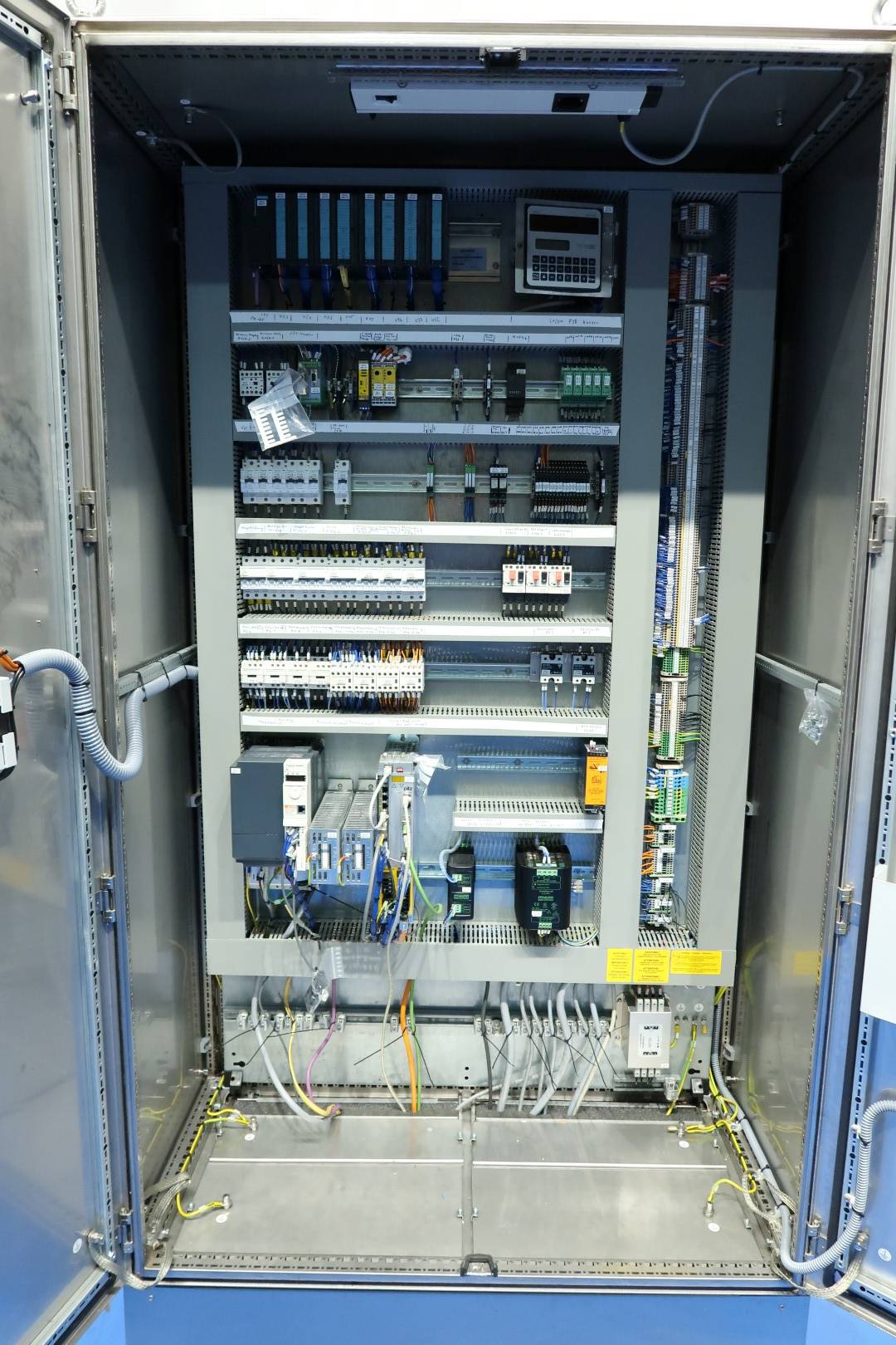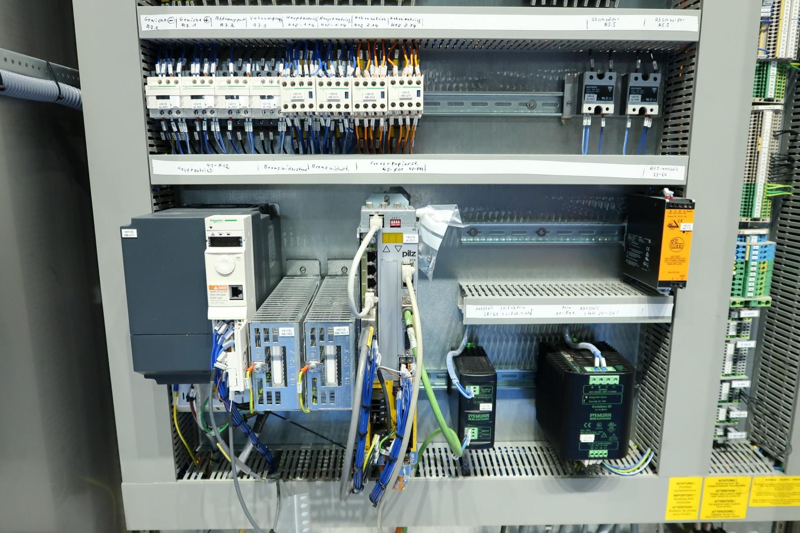 Control cabinet with Pilz servo motor. Originally part of a Benhil 8362 Wrapping machine for margarine. Power: 3PH/N/PE, 400 V - 25 A - 12,5 kW - 50 Hz. Controls: Siemens Simatic S7. Documentation: electrical diagram. Total dimensions: 120x60x234 (lxwxh) cm - weight: 300 kg.