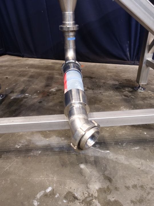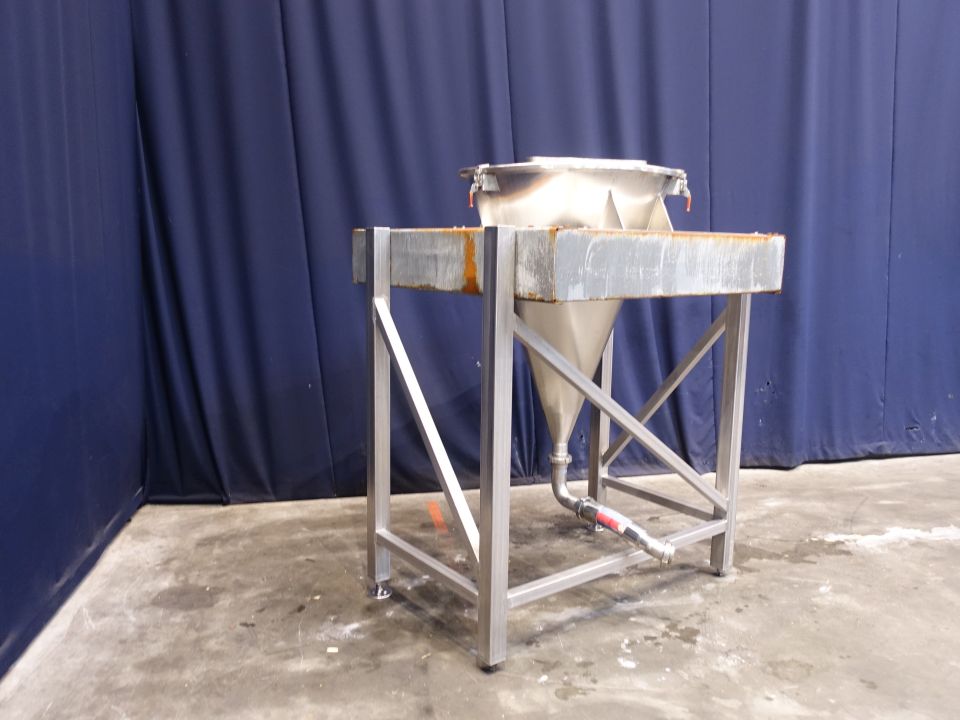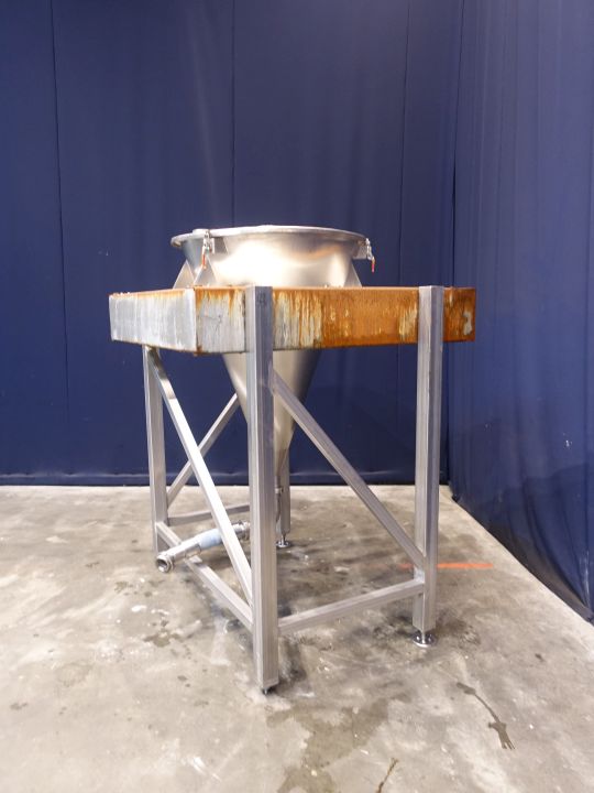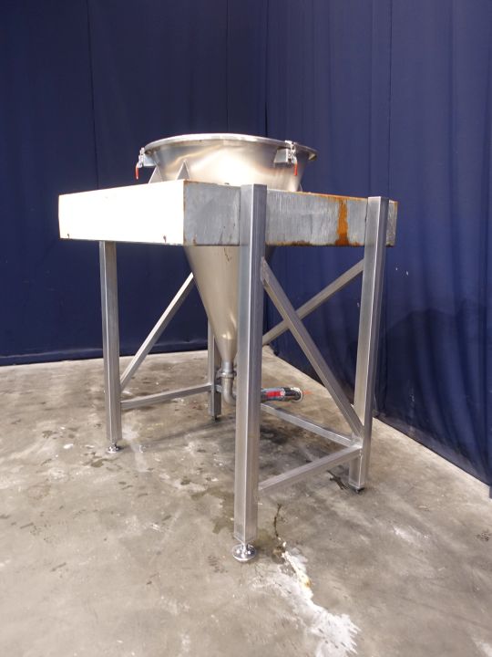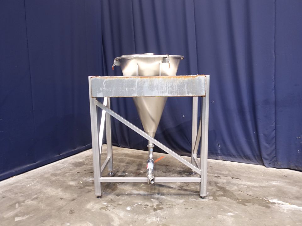 Hopper with open top. Complete conical, DN65, DIN, outlet height: 36 cm. 4 Adjustable feet. Inside dimensions of hopper: diameter 85 cm and height 120 cm. Hopper is hanging in a steel frame. Total dimensions: 150 x 150 x 200 cm.