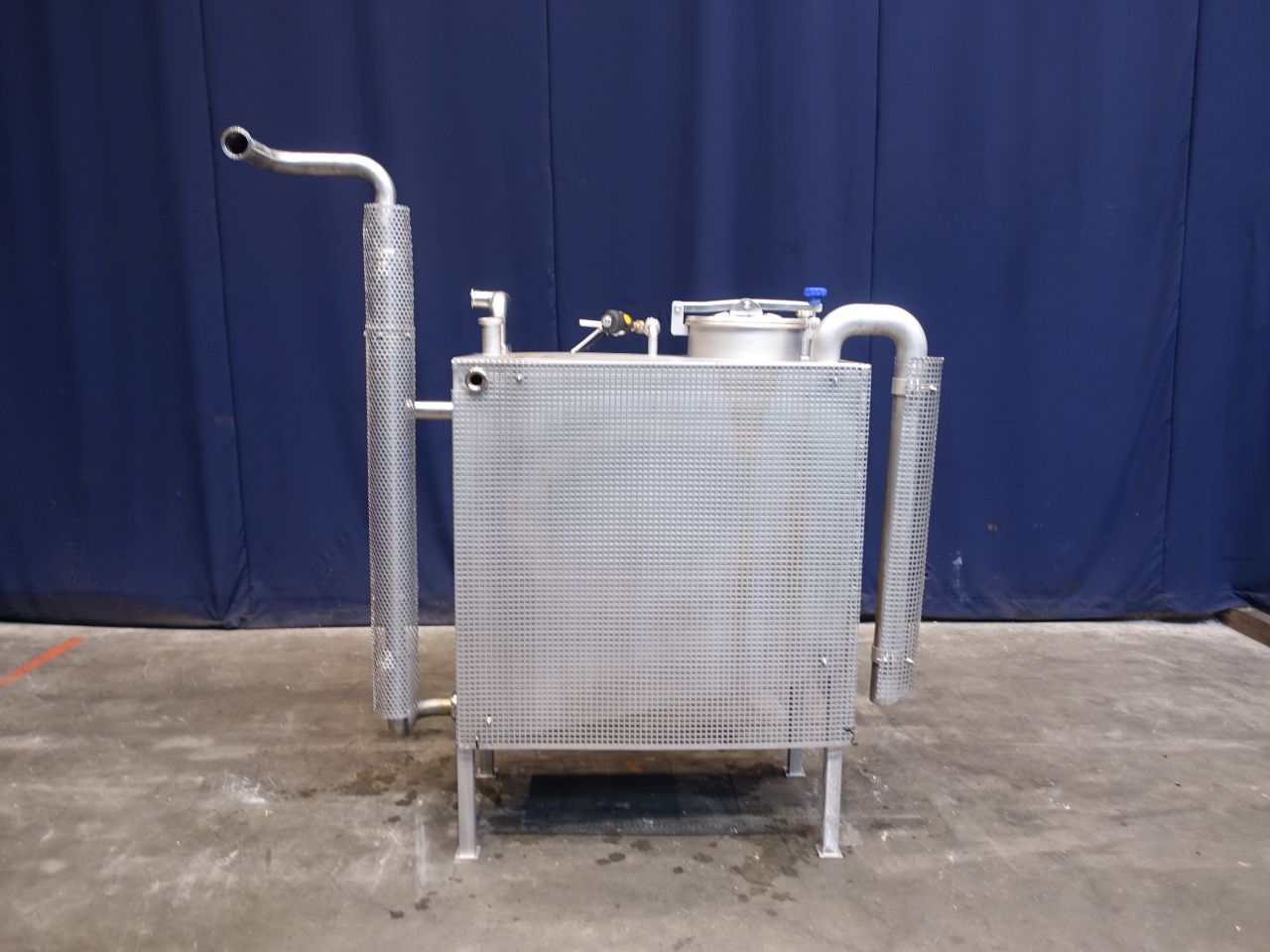 Rectangular level tank. Manhole in top. Flat to the side. Product outlet 2'' SMS. Outlet height: 30 cm. 1 CIP spray bowl. 4 Feet. Inside dimensions of tank 49 x 99 cm and height 79 up to 99 cm. Total dimensions: 160 x 60 x 180 cm.