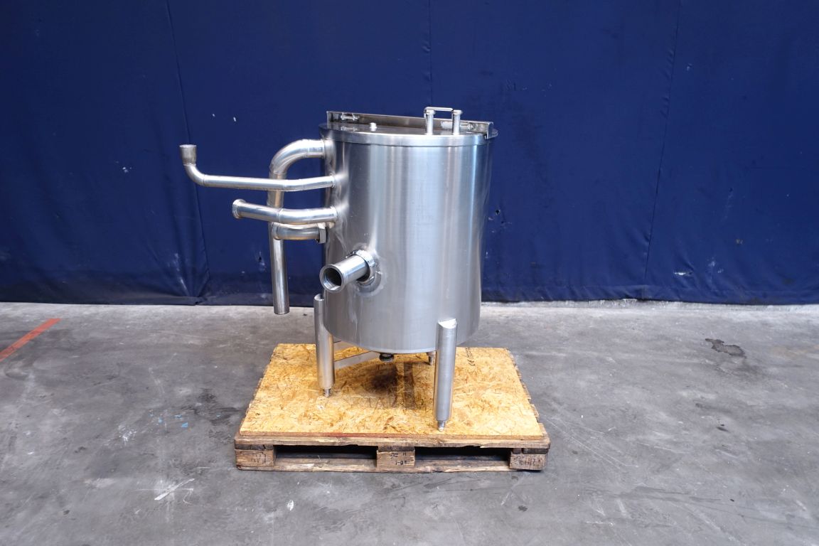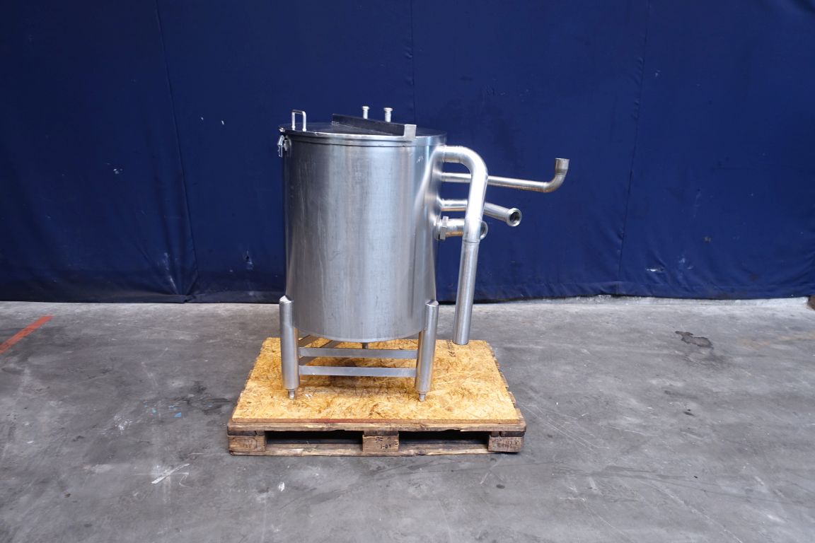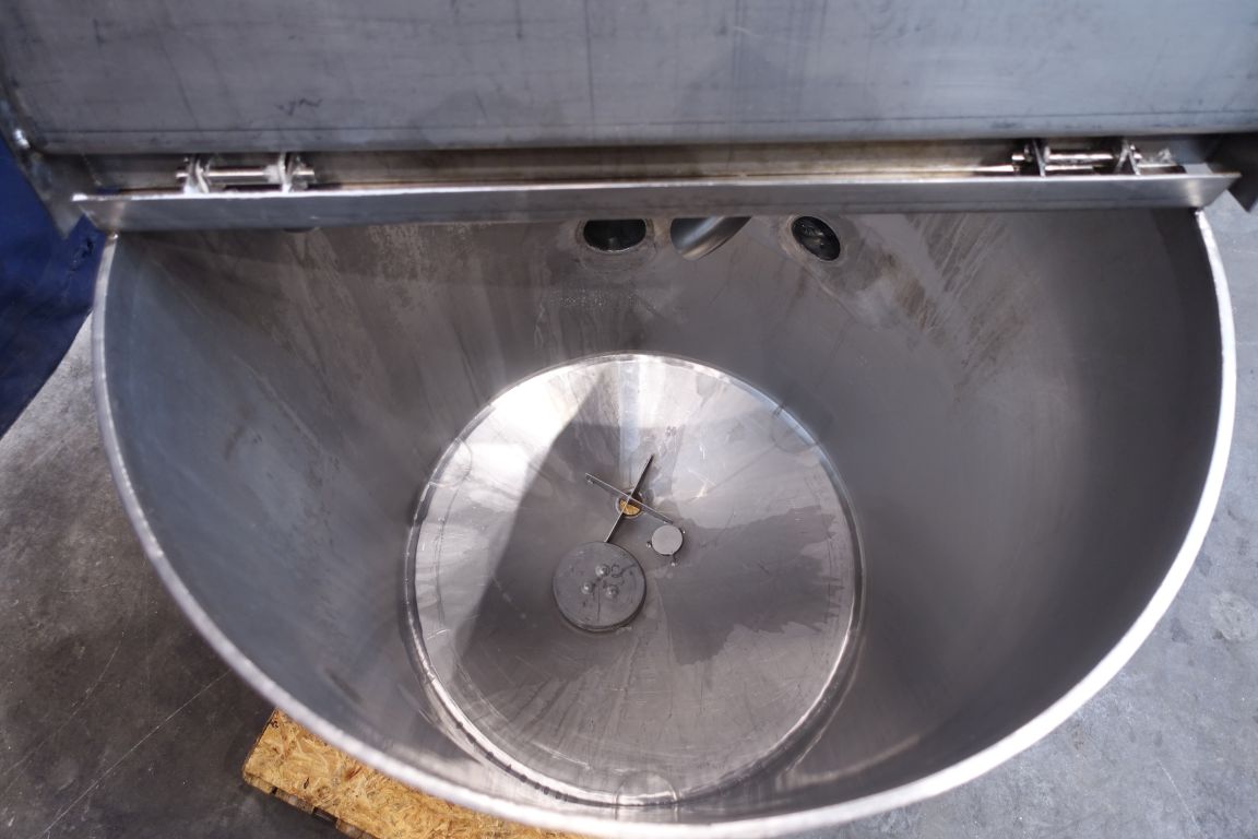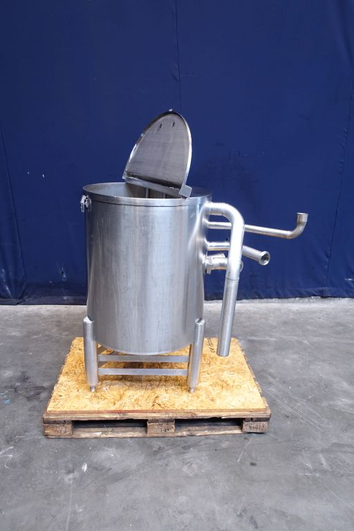 Half open top with cover leveltank. Conical. Product outlet 1,5'' SMS, outlet height: 28 cm. 3 Adjustable feet. Inside dimensions of tank diameter 62,5 cm and height 75 cm. Total dimensions: 90 x 110 x 120 cm.