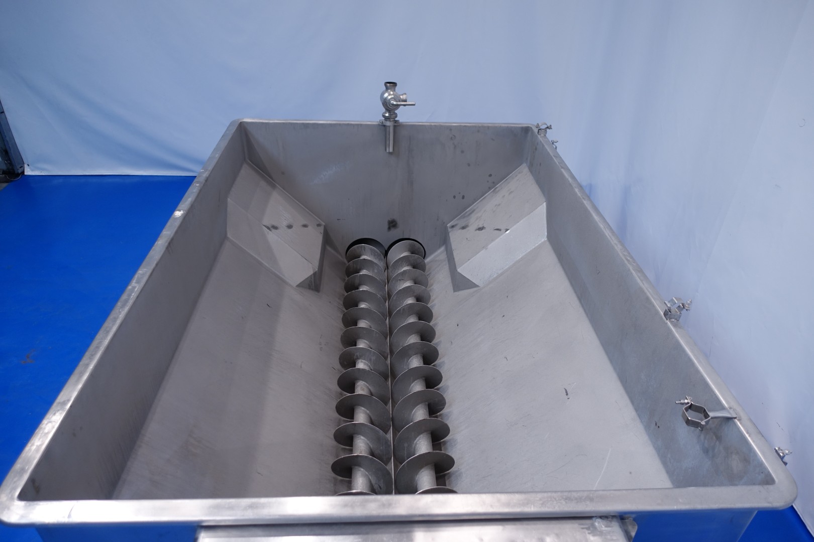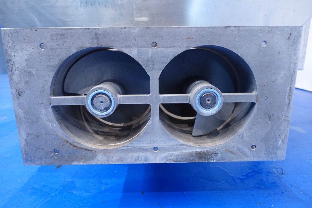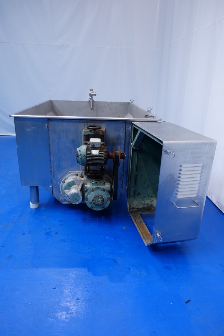 Open butter buffer tank (butter silo). 2 Augers with 1 motor with reductor. Motor 2,2 kW - 5,4 A - 950 rpm - 50 Hz. Reduction 1/30. Connections, butter outfeed 1 x 4" SMS for butterpump. Length of the augers +/- 246 cm. Total outside dimensions: 325x170x144 (lxwxh) cm. Weight: 886 kg. With simon Freres oscillating outfeed butterpump (STN15692) model S150, 3kW- 940rpm/n2: 67rpm, Gummi lobe, connections 4", SMS (last picture), weight pump 274kg