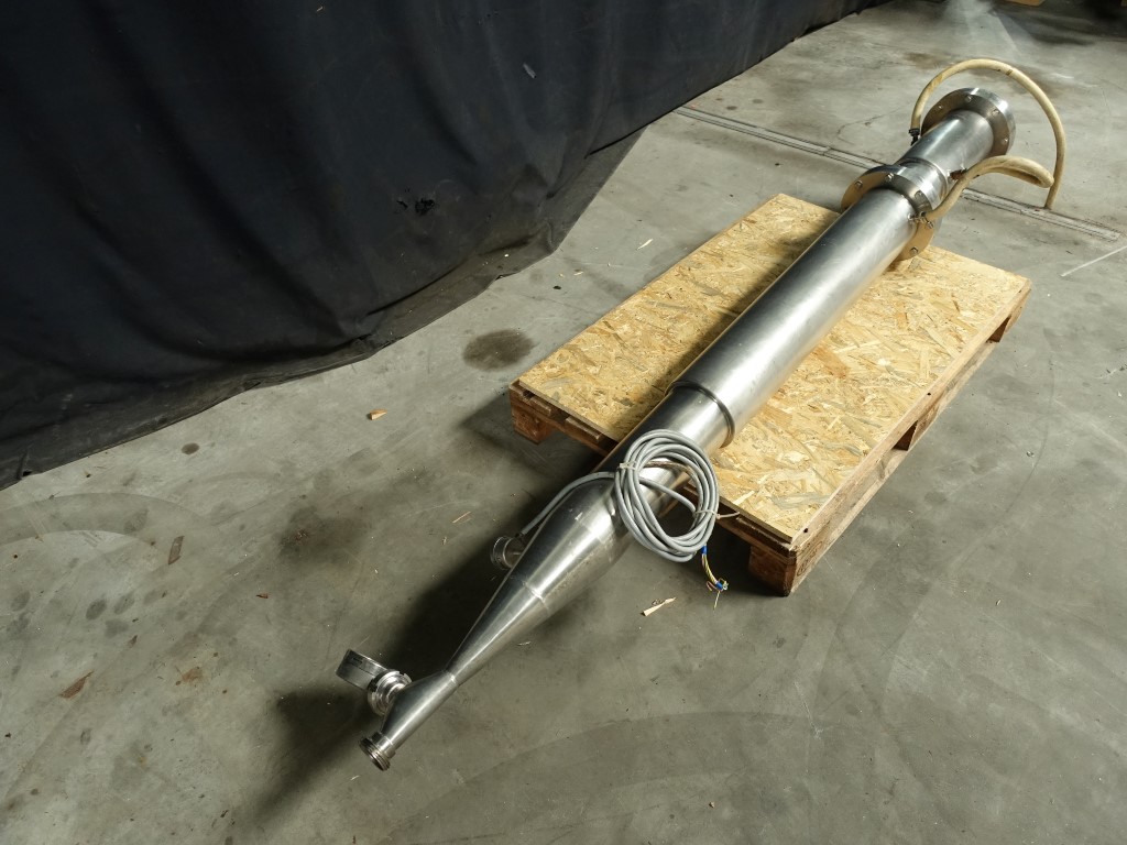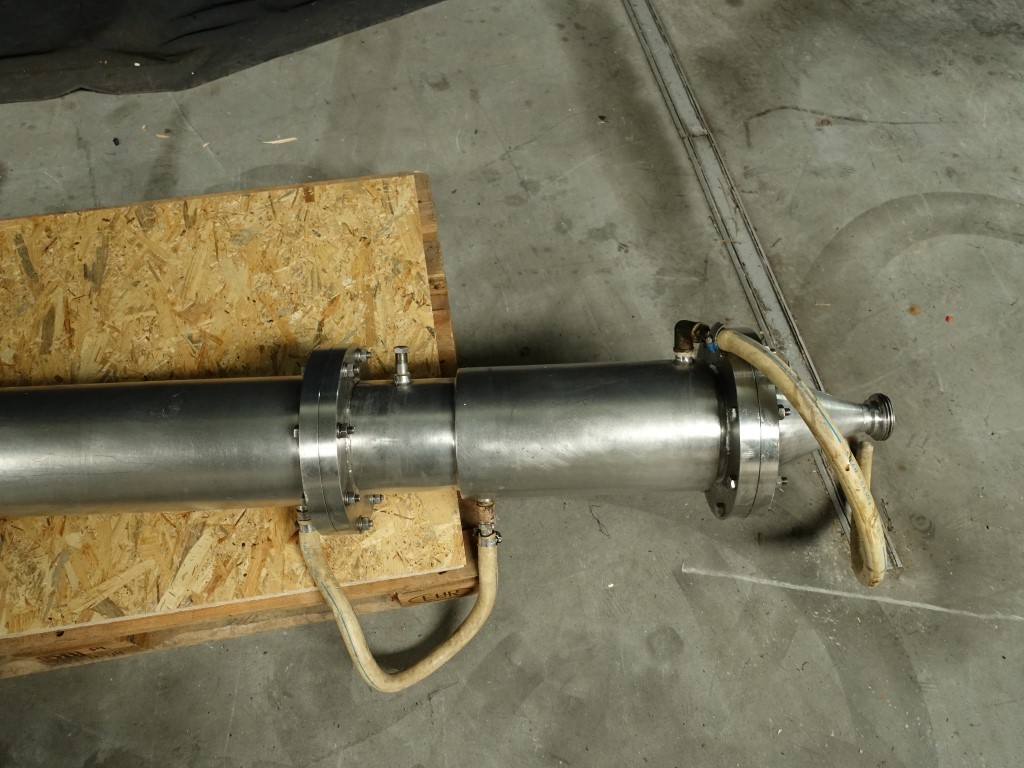 Resting tube existing out of 2 parts. Diameter 140 mm, length 50 + 150 cm. Volume: 7,5 + 22,5 = 30 ltr in total = 1 minute at 1.800 ltr/h. Connections: 2'', DIN. Including pressure indicator and PT-100 sensor. Total dimensions: 50 x 30 x 270 cm.