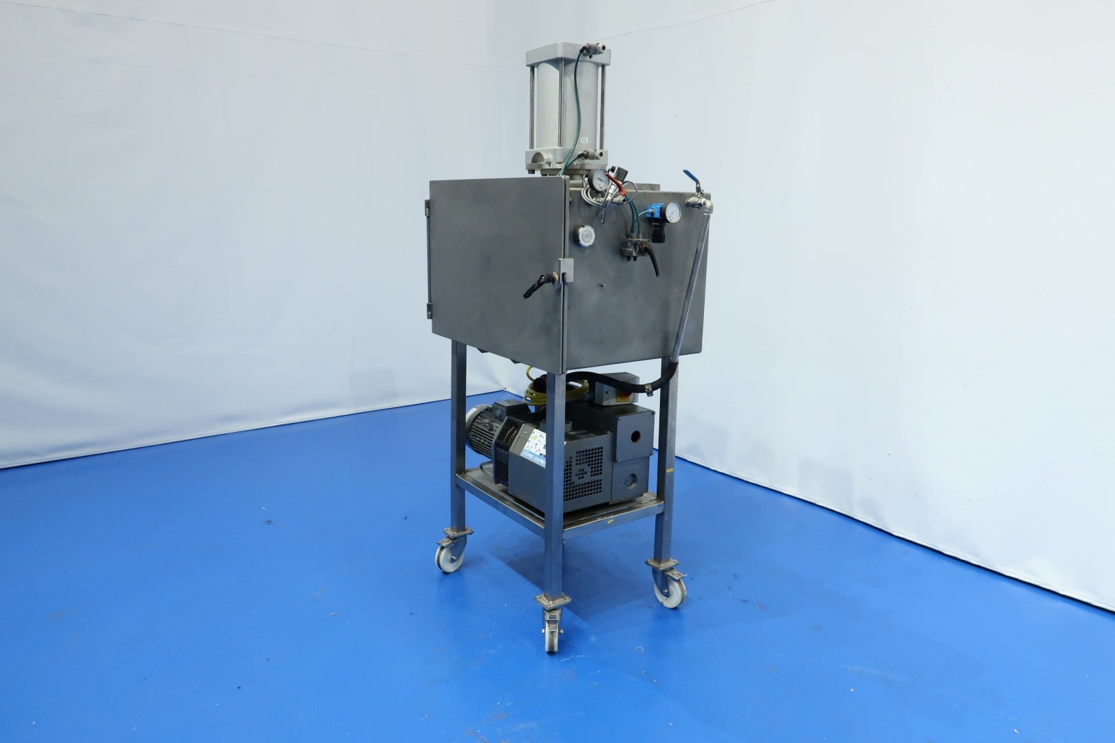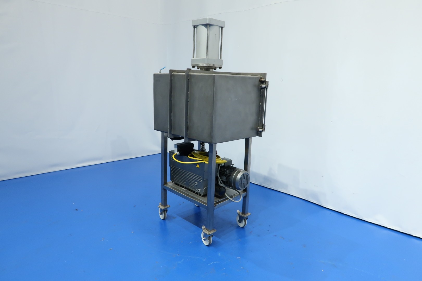 Pilot vacuum cheese press with 1 cilinder on mobile SS frame. Chamber dimensions: 80x60x53 (lxwxh) cm. Max heigth under pressplate 42 cm, min height under pressplate 22,5 cm. Inner wall coagurated coating. With Induvac vacuum pump: max vacuum 10 mbar - capacity 100 m3/h. Vacuum system to influence structure and shape of cheese. Total dimensions: 100x70x197 (lxwxh) cm - weight: 350 kg.