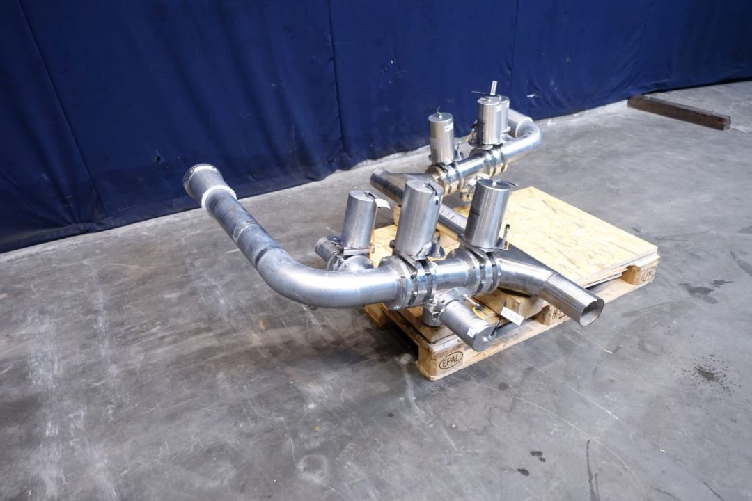 2x Trouser pieces, 100 mm. 8x pneumatic valves, 4x DN100 + 4x DN65. 2x outlets DN100 SMS.