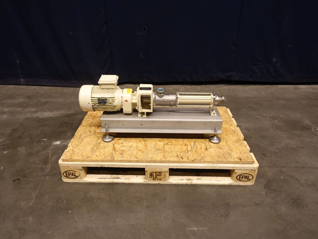Screw / mono pump. Stator diameter 5 cm. Stator length 23 cm. Current motor: 1,5 kW - 3,55 A - n1: 1395 rpm - i = 3,6 - n2 / pump speed: 388 rpm. Connections: 1,5'', DIN.