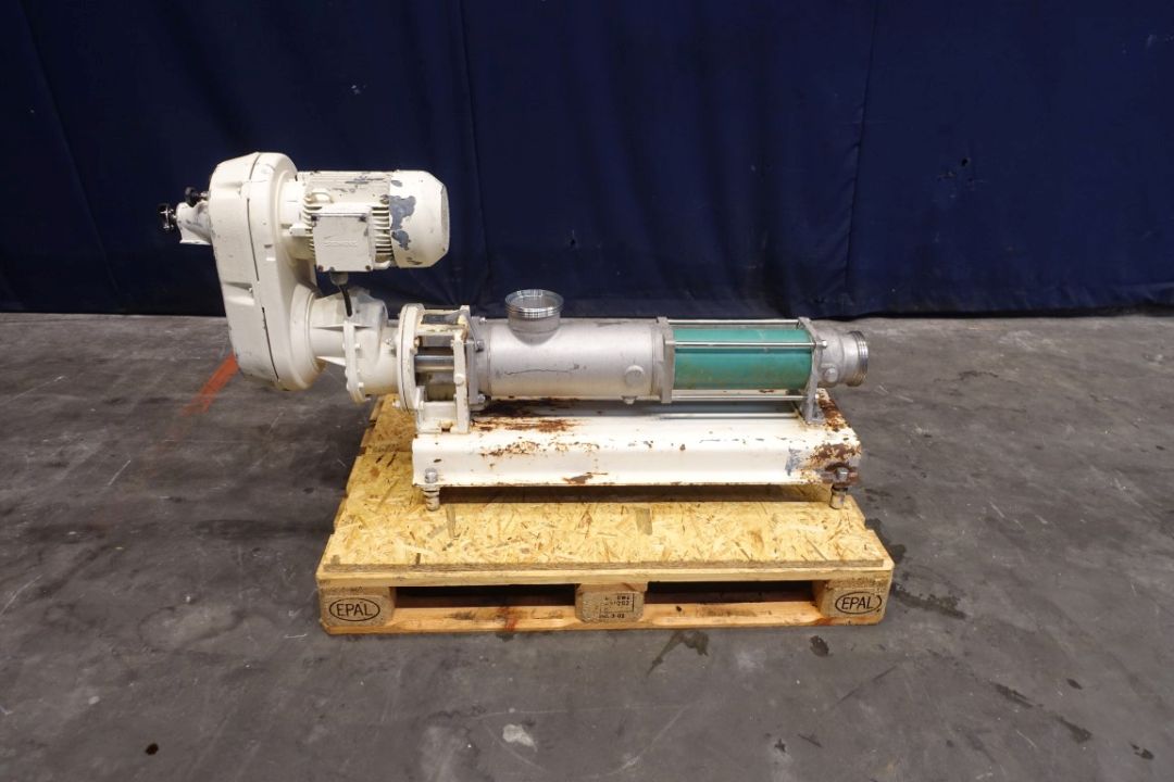 Screw / mono pump. Current motor: 3 kW - n2 = 321-53 mrpm. Mechanical variator. Steel frame mounted. Connections: DN100/DN100