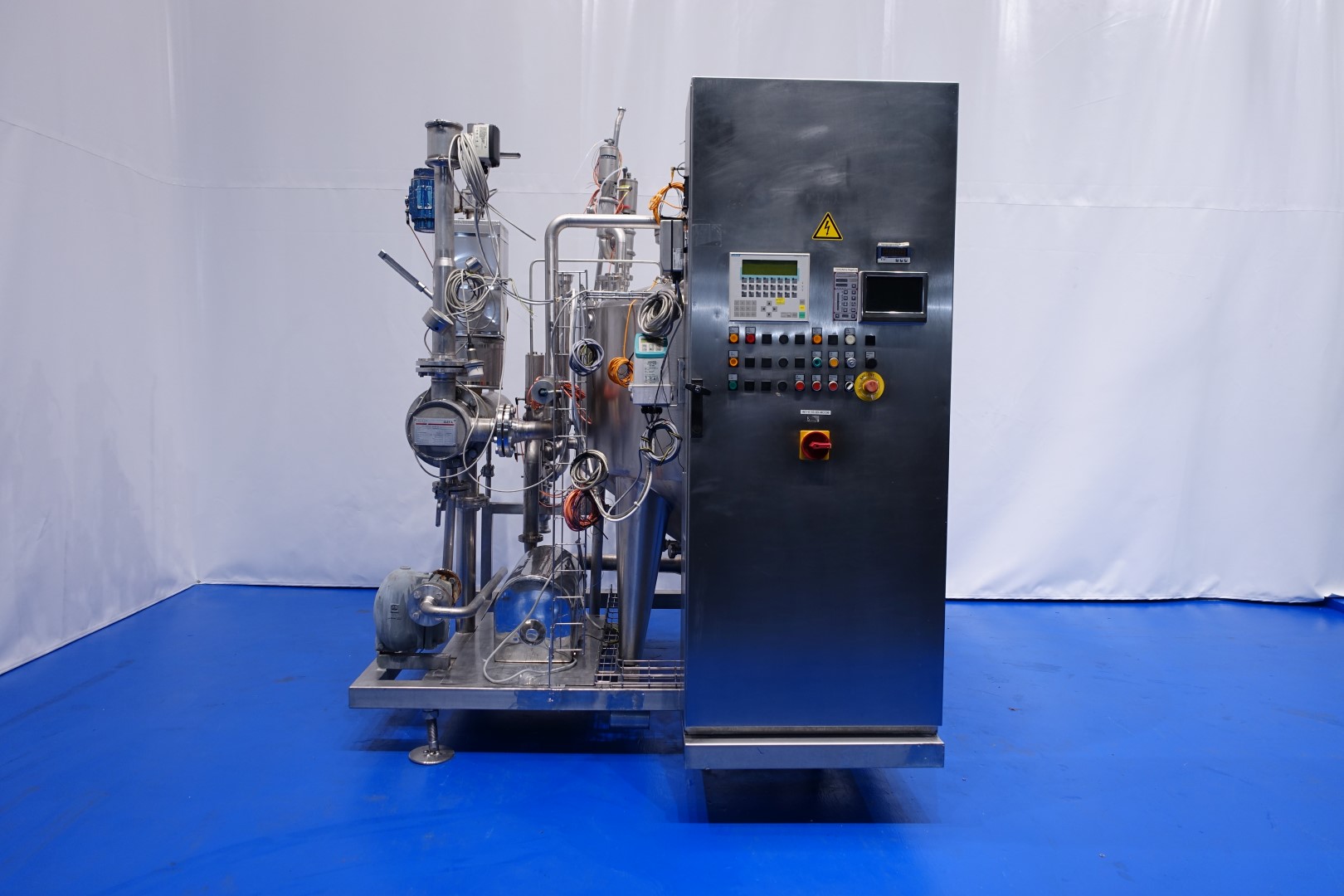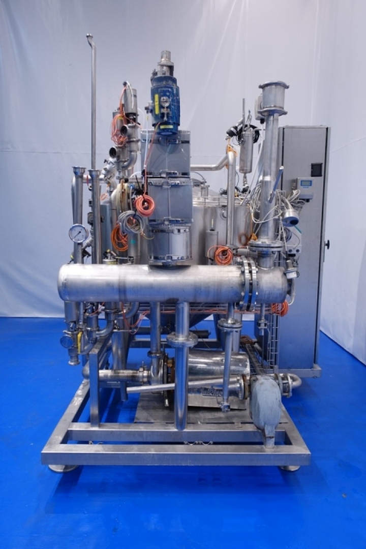 Skid mounted CIP unit which consists of: Tank, tubular heat exchanger and Centrifugal pump. Double jacketed SS tank capacity 1.000 ltrs. - with level sensors on 300/600/900ltr - Temperature sensor, Breather and round manhole in top, spray bowl. Tubular heat exchanger on outlet to heat the cleaing detergent make: IGEFA- type: 203-220-26-900-18 - built in 1991 - no. 29339 - heating surface 2,9 m2 - capacity 17/21 ltrs. - tube length 110 cm - tube head Ø 21 cm - 52 pipes Ø 16,5 mm. Centrifugal pump make: Wiking- 5,5 kW - 11 A - 50 Hz - 2.885 rpm - impellor Ø 175 mm - connections in: DN80 Din - out: DN65 Din. Controls Siemens Simatic. Total dimensions: 230x212x273 (lxwxh) cm - weight: 1.158 kg's. Documentation: PID available.