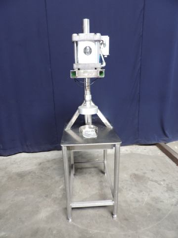 Stainless steel tabel with pneumatic cylinder for closing product by pressure. Diameter of the product ± 150 mm. Stroke 90 mm. Height adjustable. Total dimensions: 80 x 50 x 185 cm.