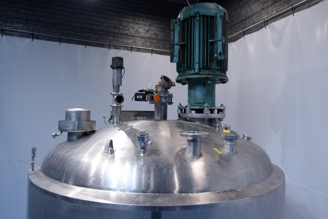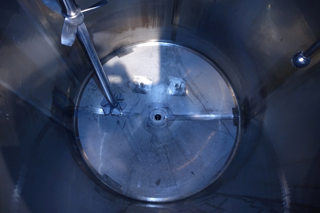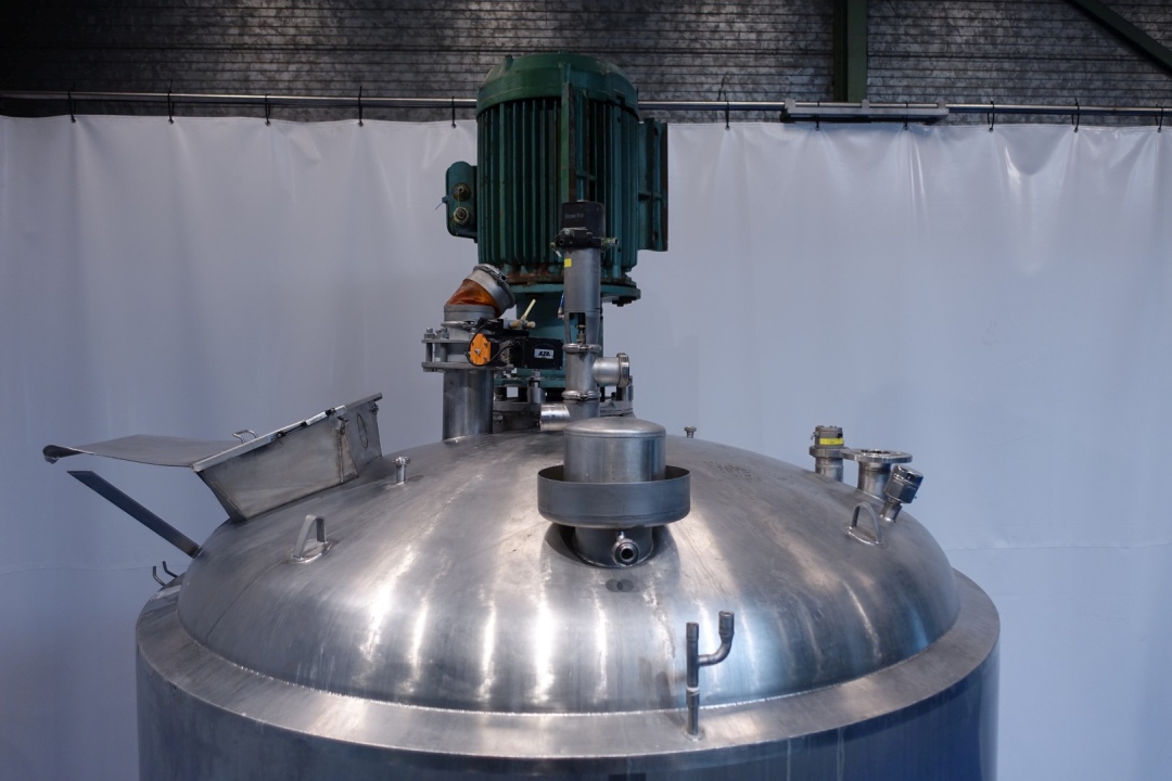 Mix and dissolve tank, double jacketed for heating or cooling. Top driven agitator with below mixer and half way a propellor. Motor power: 45 kW - 85 A - n1: 985 rpm. Working pressure in jacket: 3,5 bar. Insulated bottom. Product outlet DN80 Din, outlet height: 17 cm. Including pneumatic outlet valve. Lamp on top of tank. Sensors: high and low level sensor, temperature sensor in bottom, with breather in top. 2 CIP spray bowls. Manhole/product infeed in top rectangular 49x33 cm. 3 Adjustable feet with 3 loadcells. Inside dimensions of tank: Ø 210 cm and cylindrical height 235 cm. Connections on side: 2 x 2" Din, Connections in top: 3x 1" Din - 1 x Flange - 1 x 2,5" Din. Total dimensions: 235x225x453 (lxwxh) cm - weight: 2.220 kg.
