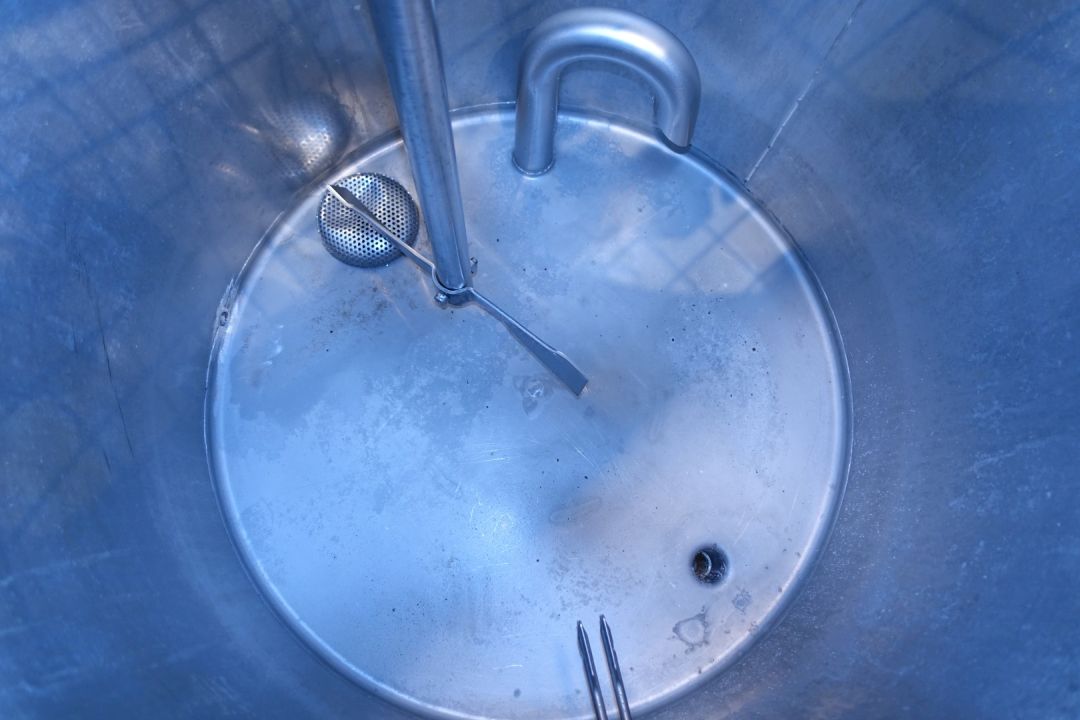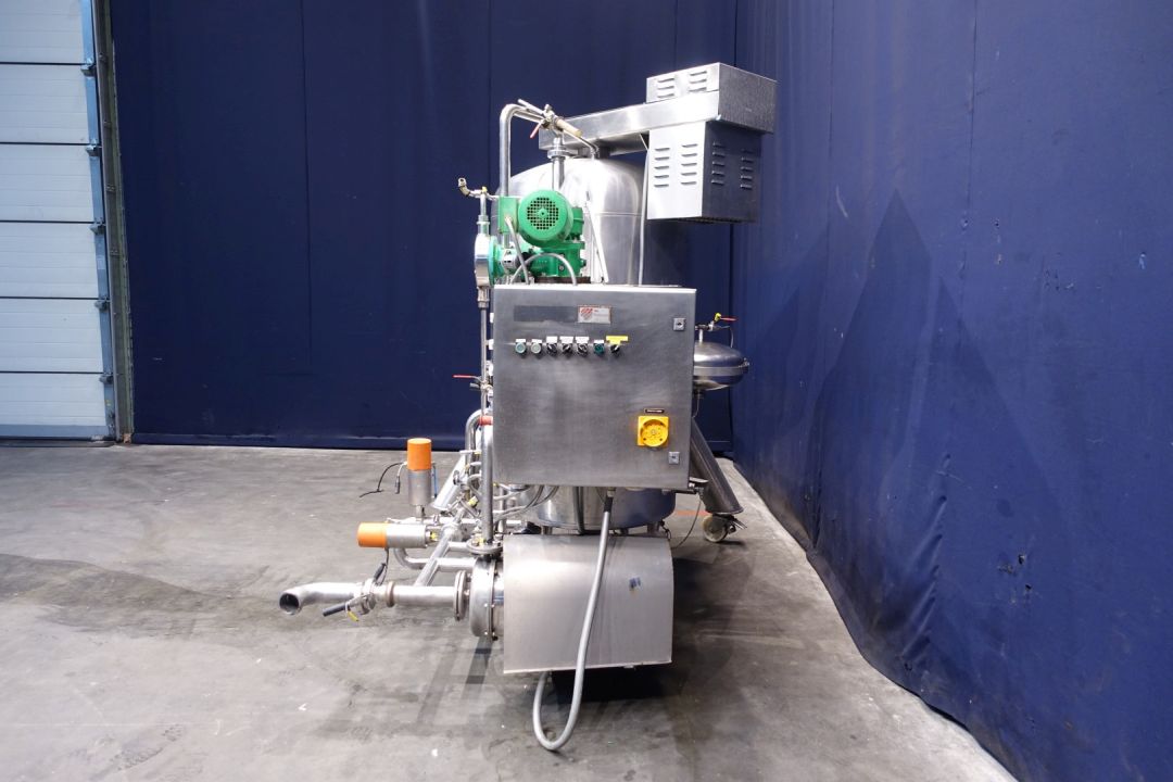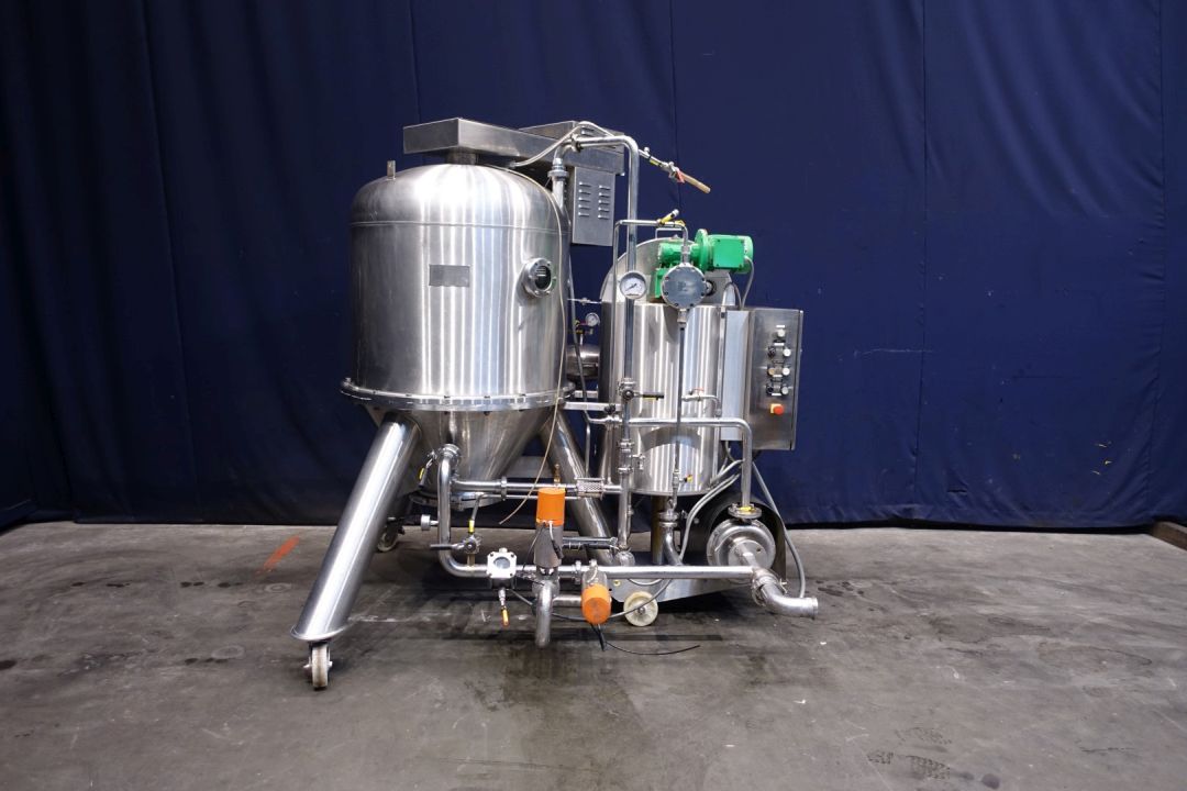 Padovan Pressure Leaf Filter, Model Green C 10 LAT. Sanitary stainless steel, 12 square meter, centrifugal dry cake discharge vertical tank, horizontal leaf pack design with a 7,5 kW top drive with hydraulic coupling for leaf pack rotation and dry cake discharge. Complete system to include: sanitary stainless steel feed pump, auxiliary plate filter for final residues, all piping and valves, precoat mix tank and controls. The filter is unitized on wheels for mobility. Total dimensions: 200 x 180 x 222 cm.