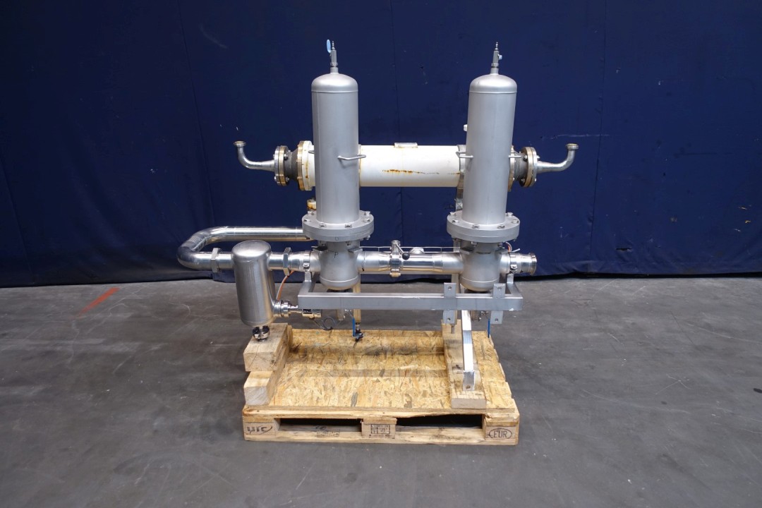 Air Filters 2 pieces on a skid. Stainless steel housing. Each filterhouse with 3 filters. Temperature up to 140°C, 5bar. Skid with pressure transmitter and tubular heat exchanger. Total dimensions: 180x65x150 mm (lxwxh) - weight: 284 kg's.