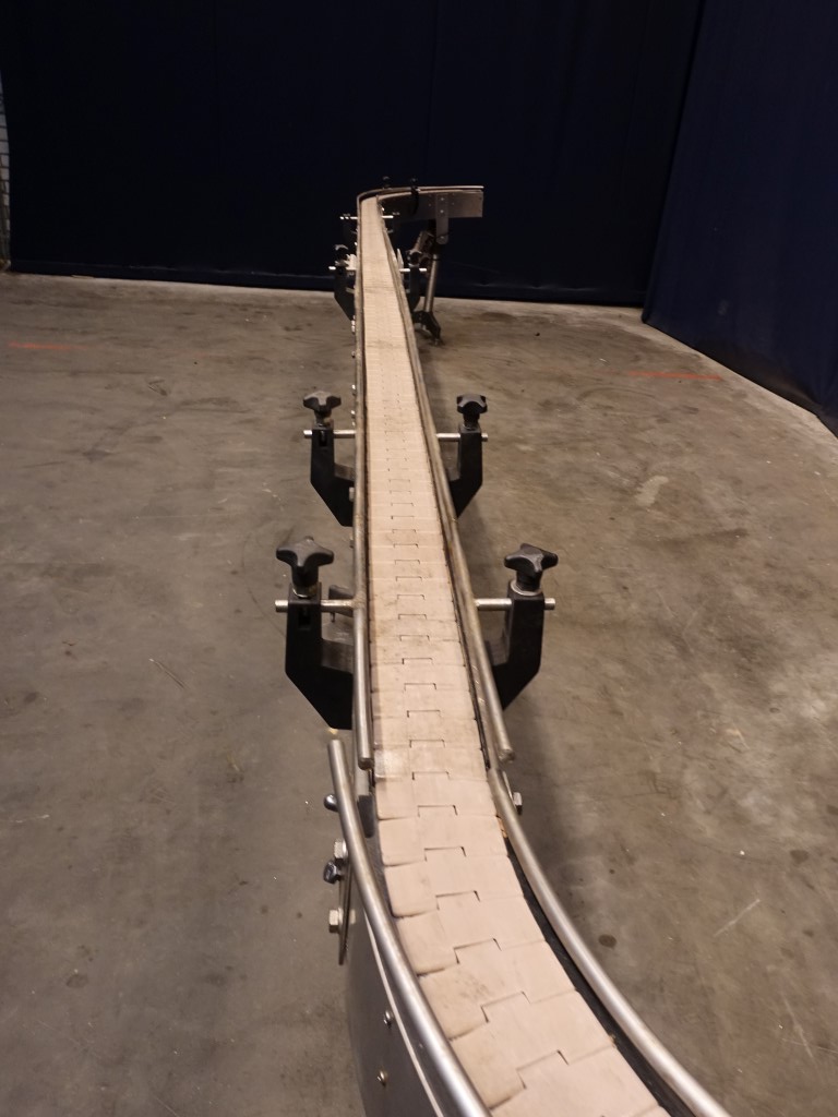 Chain conveyor. Effective Belt lxw: 600 x 8 cm + 2 x 90° corner. Motor: 0,55 kW - 1,76 A - n1: 1360 rpm - n2: 59 rpm. Horizontal. Conveyor is disassembled into 2 parts, to be connected, end roll missing.