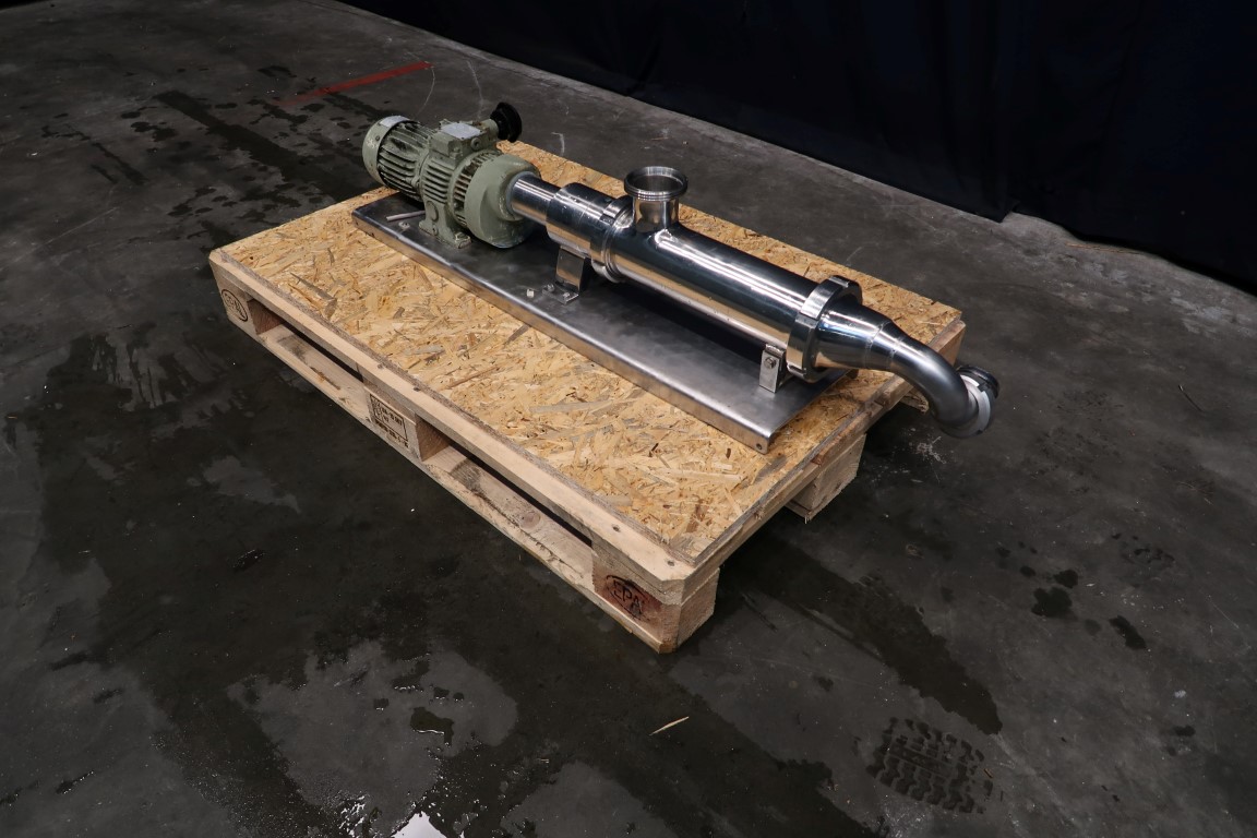Präzisions Rührer Gesellschaft (PRG) inline mixer. Motor 0,55 kW . N2: 635-106 rpm. 3x mixing points of 4 blades on the rotor. Effective rotor length: 30 cm, total rotor lenght: 35 cm. Connections: In 4''/2'' DIN - Out DN65. Total dimensions: 125 x 28 x 25 cm.
