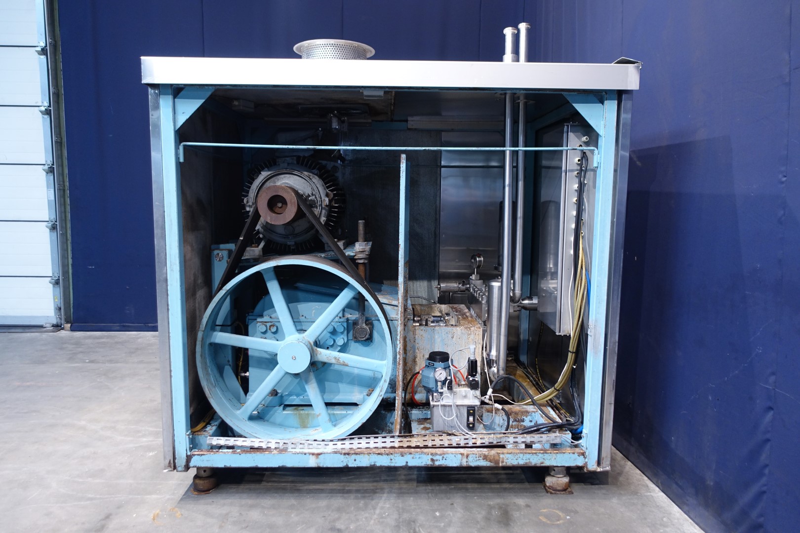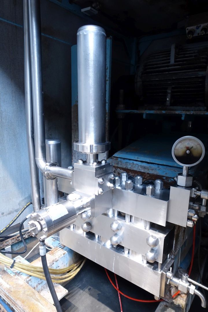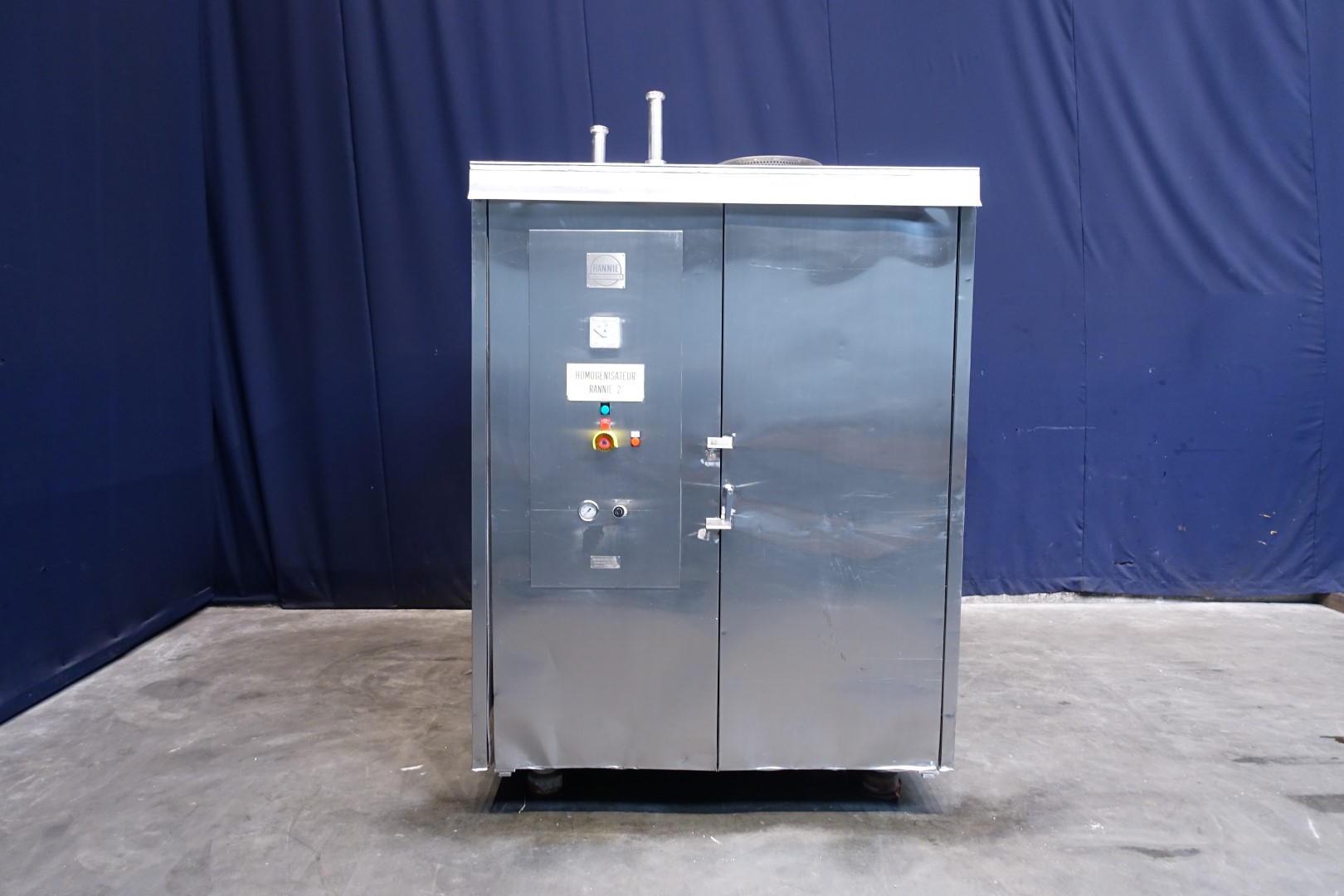 High pressure homogeniser. 1 Stage with hydraulic pressure control (automatic regulation). 3 Pistons, piston diameter: 63 mm and stroke: 80 mm. Stainless steel cladded in sound-insulated cabinet <80dB (A) (Rannie Blue Top Milieu). Connections: 2 x 2" Din. Current motor power: 90 kW - 166 A - 1.480 rpm - 50 Hz - 3x380 V. Maximum working pressure in current configuration with this 215 bar. Amount of cooling water, 200 l/h - lubricating oil 80 ltr - hydraulic oil 4 ltr. Fan for cooling of main motor is fitted on top of the cabinet. Integrated control panel no mcc or cpu. 1 x Pressure Manometer and 1 x drain tap. Circulation pump, flowswitch and external PHE on cooling water. Pulsation demper on inlet and outlet. Total dimensions: 230x162x248 (lxwxh) cm - weight: 3.650 kg. With operation manual and parts list.