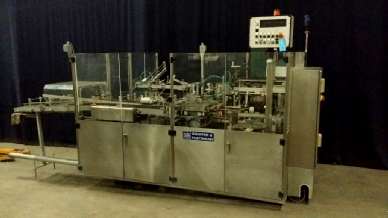 Butter / Margarine packages collector and packer for american folding boxes which operates fully automatically and all principal movements are mechanically driven. Including Nordson 3400 hot melt unit. Siemens S5 PLC. Pack scheme; 2 x 4 x 5 layers = 40 butter / margarine packages of 250 gram (100 x 75 x 35 mm) per carton = 10 kg / carton. Box size 310 x 210 x 185 mm. Capacity: 6 boxes with 5 layers / minute = 240 packages / minute. With only 1 or 2 layers, speed max 15 boxes / minute. Dimensions: ± 3,20 x 2,00 x 2,20 mtr with infeed conveyor.