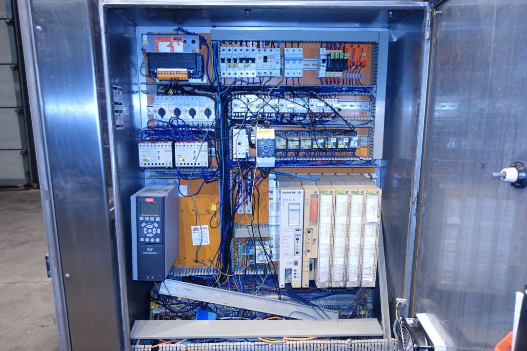 Fully automatic packer, to pack butter packs in an Carton type: American folding box. Operates fully automatically and all principal movements are mechanically driven. Used for 250gr bricks of foil 100 x 75 x 35 mm packed / and wrapped. Maximum box dimensions 330 x 220 x 230 cm. Current dimensions of the box/plano: 300 x 200 mm. Layout of the box 4x2x2 layers = 16 packs of 250 gram per carton = 4kg / carton. Capacity = max. 15 cartons per min. = max. 240 packages per min on input, 2 lanes. Nordson Problue 7 hotmelt glue unit with 3 glue points. Controls Siemens S5 PLC. Has been running together with Benhil 8362 foil packing and wrapping machine (STN15200). Total machine dimensions: 440 x 185 x 220 cm.