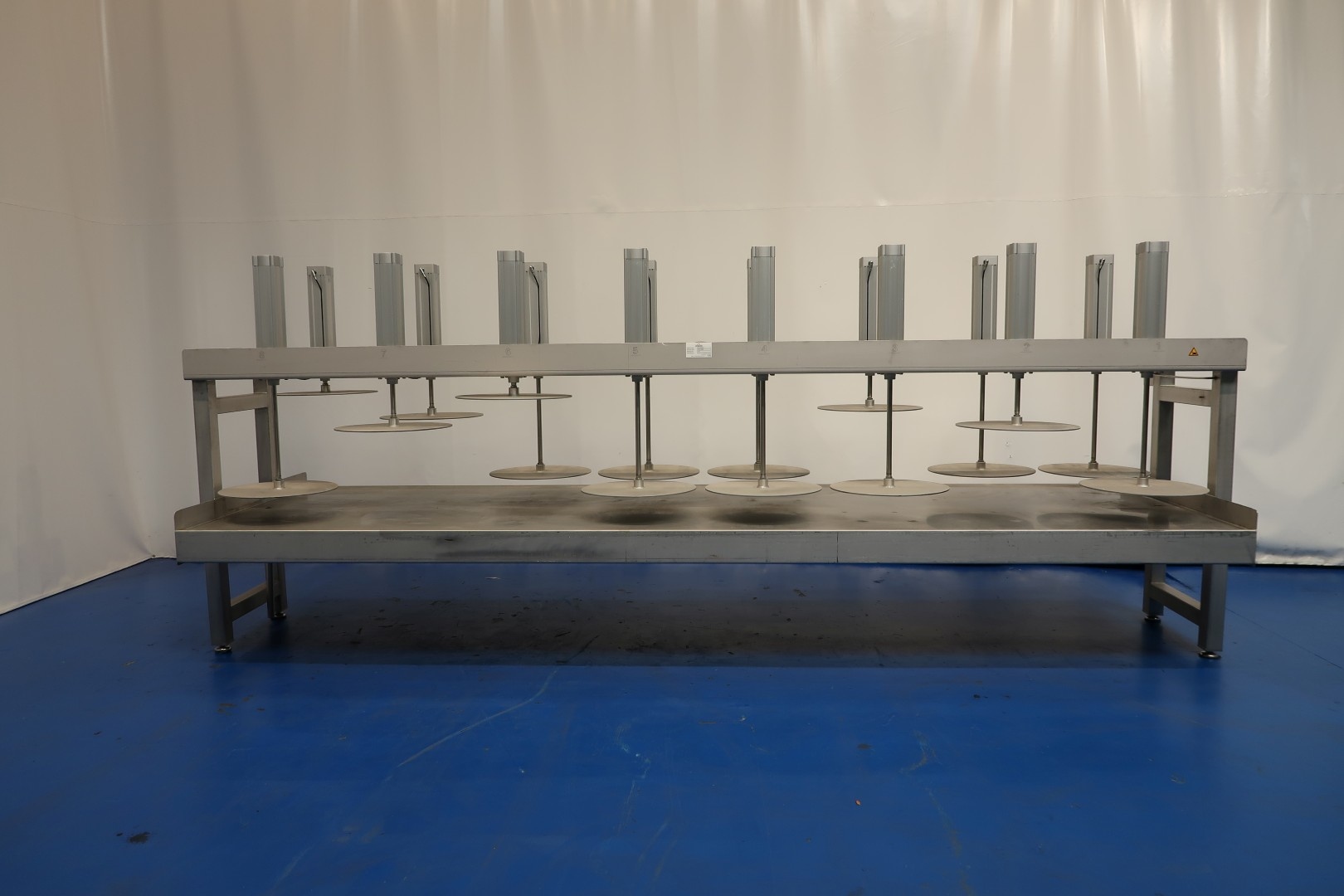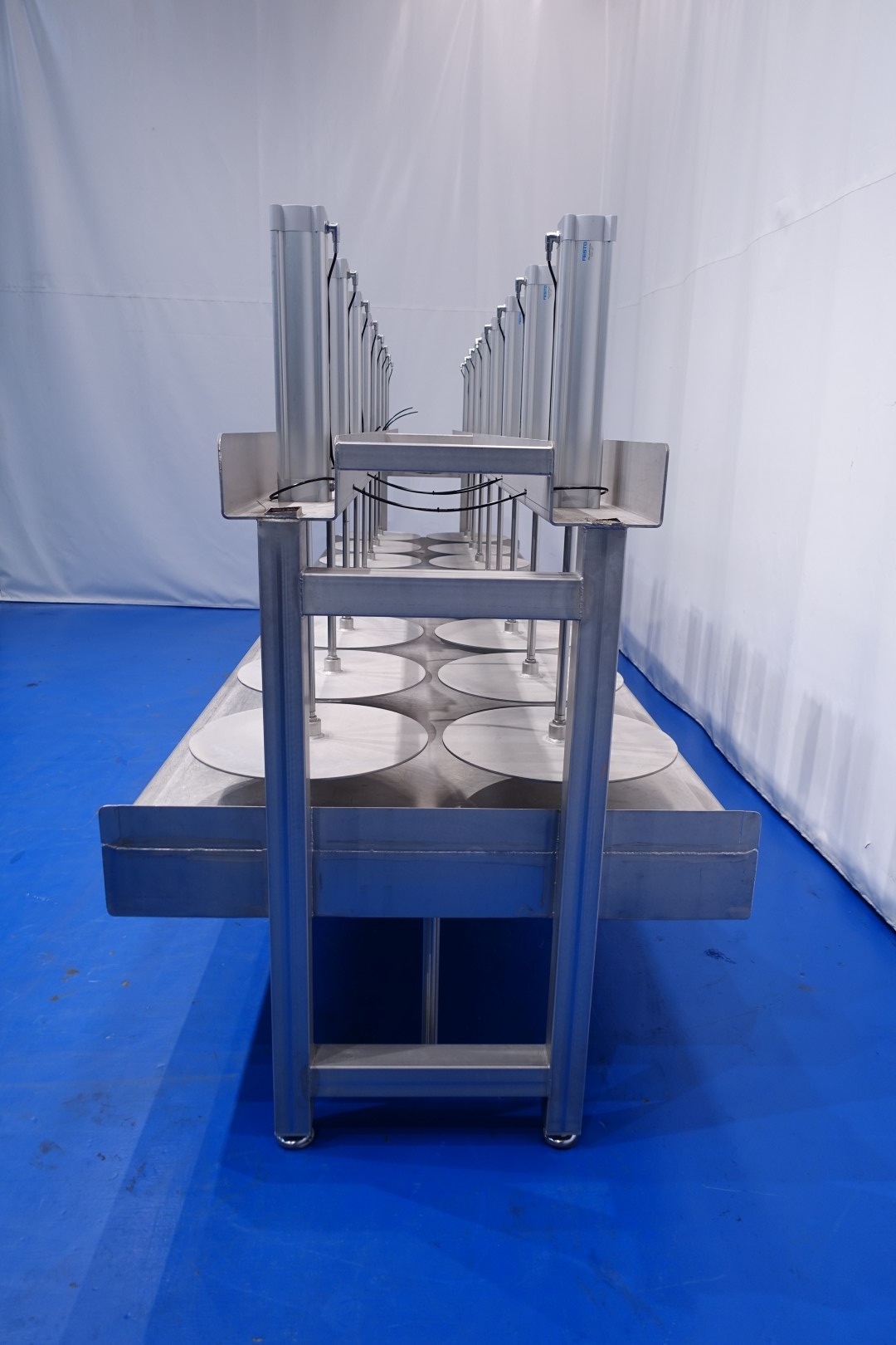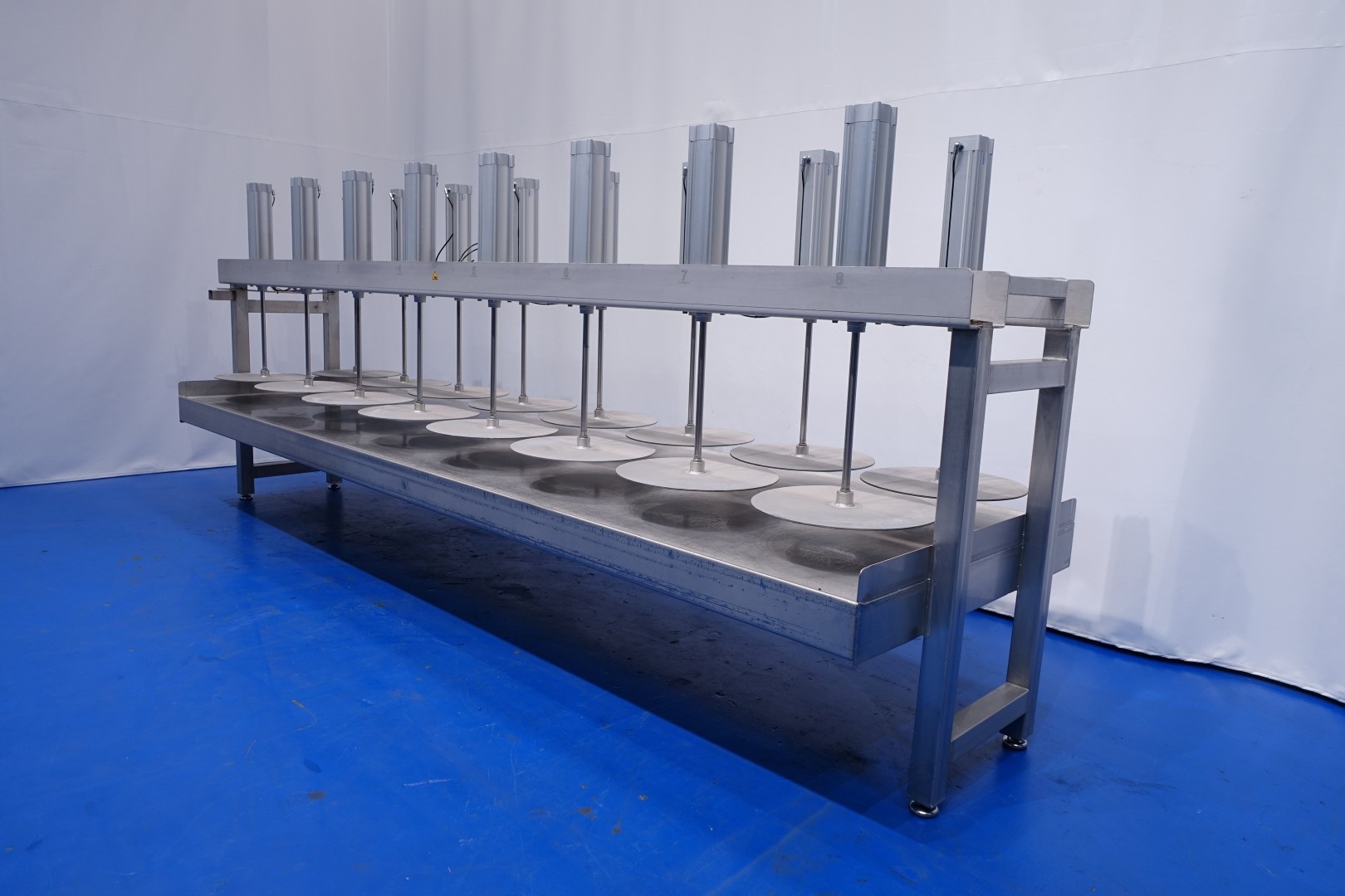 Cheese press, with 16 cylinders. Suitable for semi- and large-sized cheeses. Framework completely stainless steel with Festo alumunium cilinders. State: excellent and in working condition (video available). Table with raised edge alongside and 2 x drain point at the front and back. With 4 x adjustable feet. Max pressure per cilinder: 12 bar. Currently without controls, can be offered upon request. Drawing specification: 13014-PRS. Diameter pressing disc 56 cm. Total dimensions: 500x138x198 (lxwxh) cm - weight: 1.077 kg.