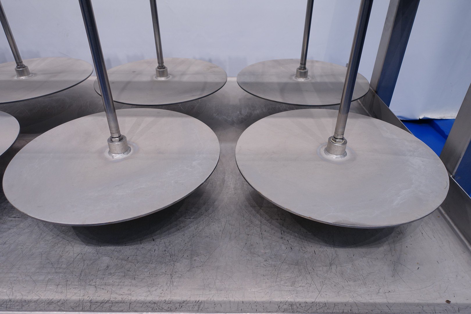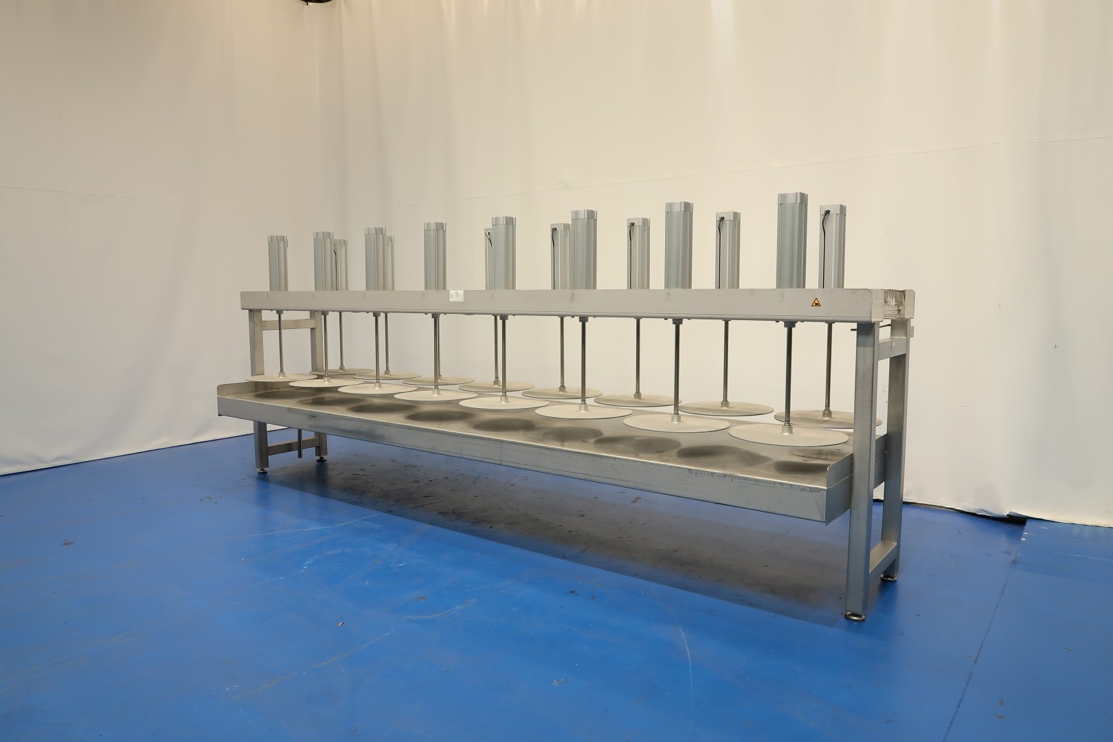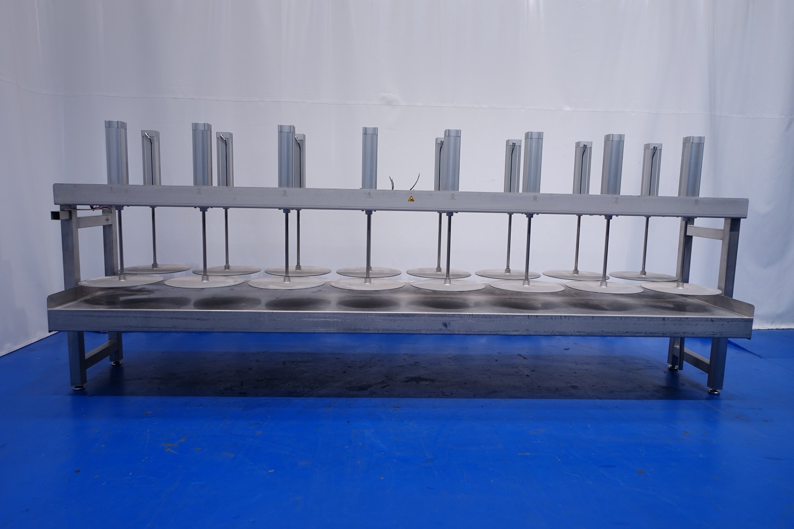 Cheese press, with 16 cylinders. Suitable for semi- and large-sized cheeses. Framework completely stainless steel with Festo alumunium cilinders. State: excellent and in working condition (video available). Table with raised edge alongside and 2 x drain point at the front and back. With 4 x adjustable feet. Max pressure per cilinder: 12 bar. Currently without controls, can be offered upon request. Drawing specification: 13014-PRS. Diameter pressing disc 56 cm. Total dimensions: 500x138x198 (lxwxh) cm - weight: 1.077 kg.