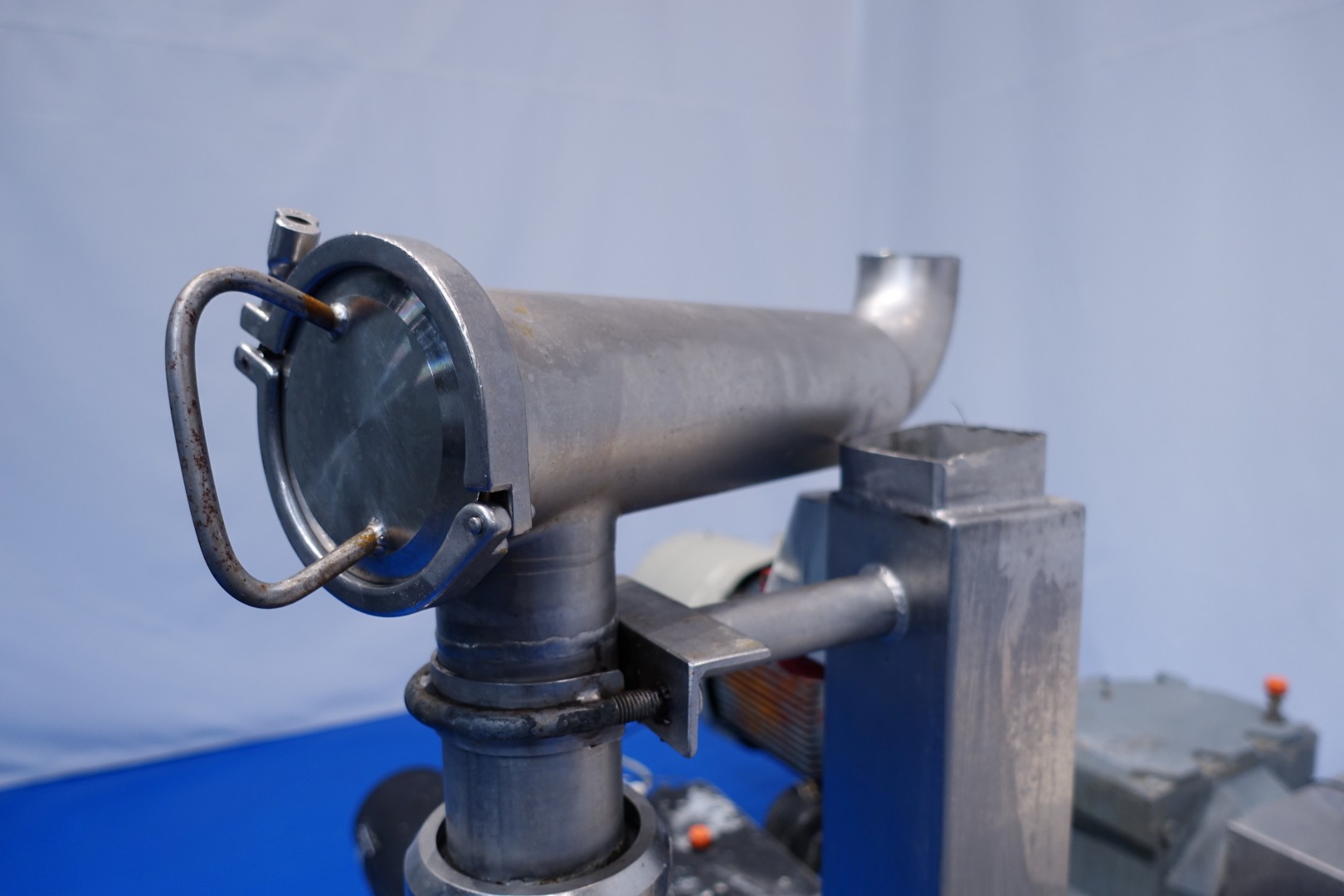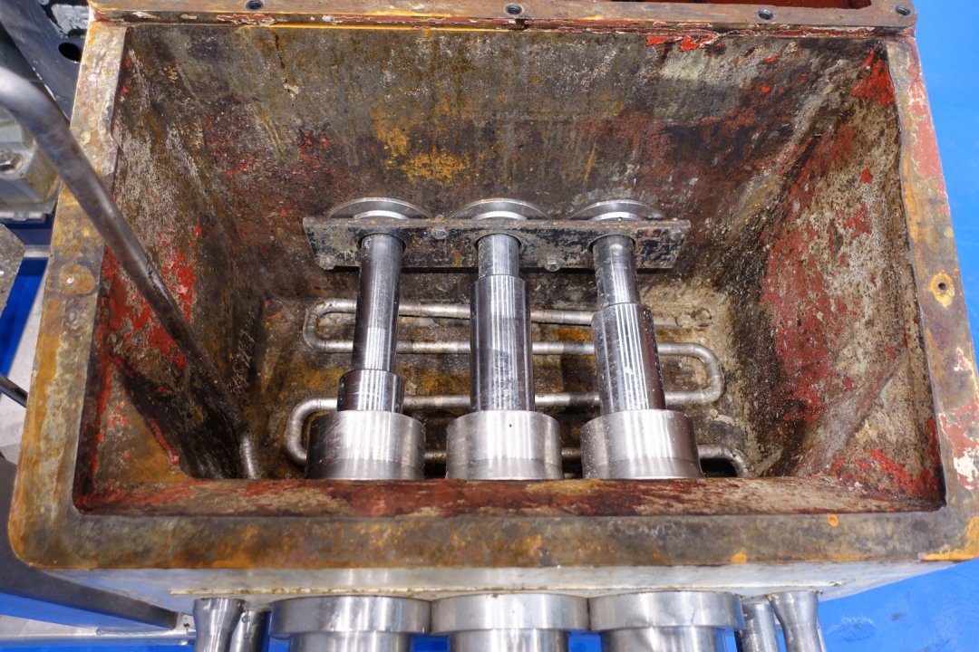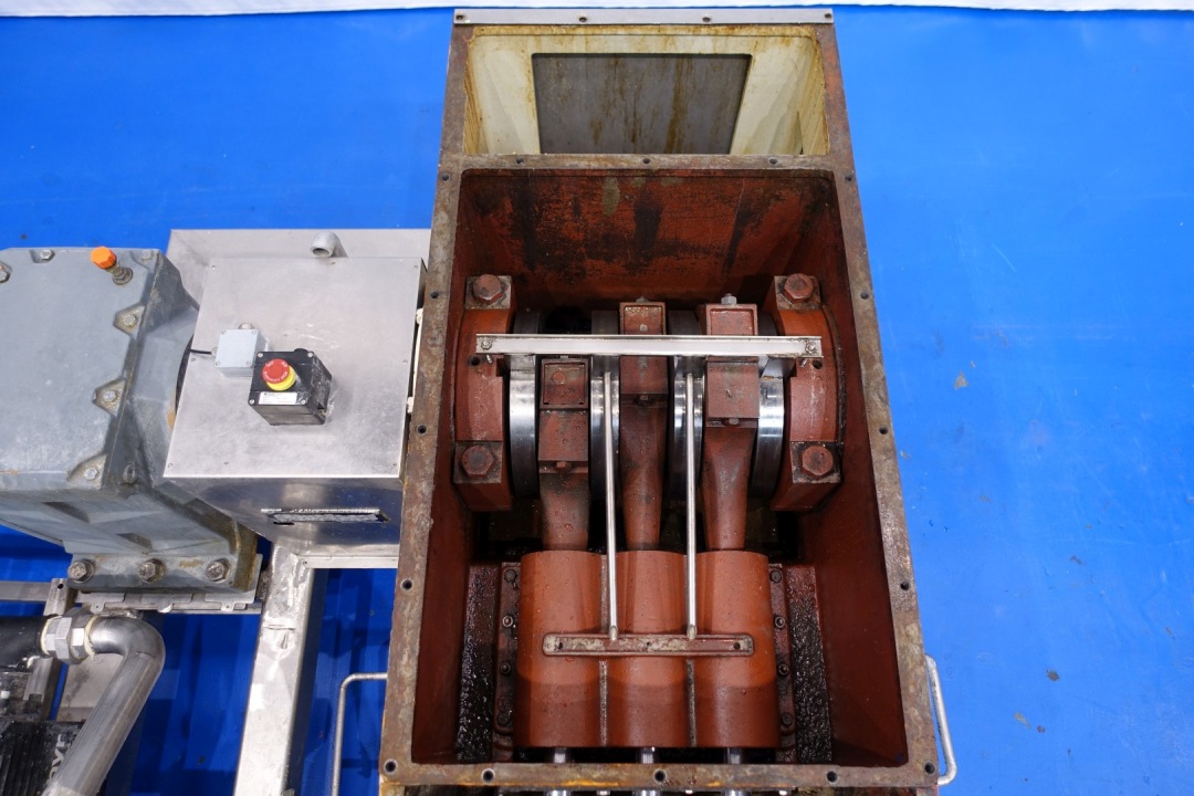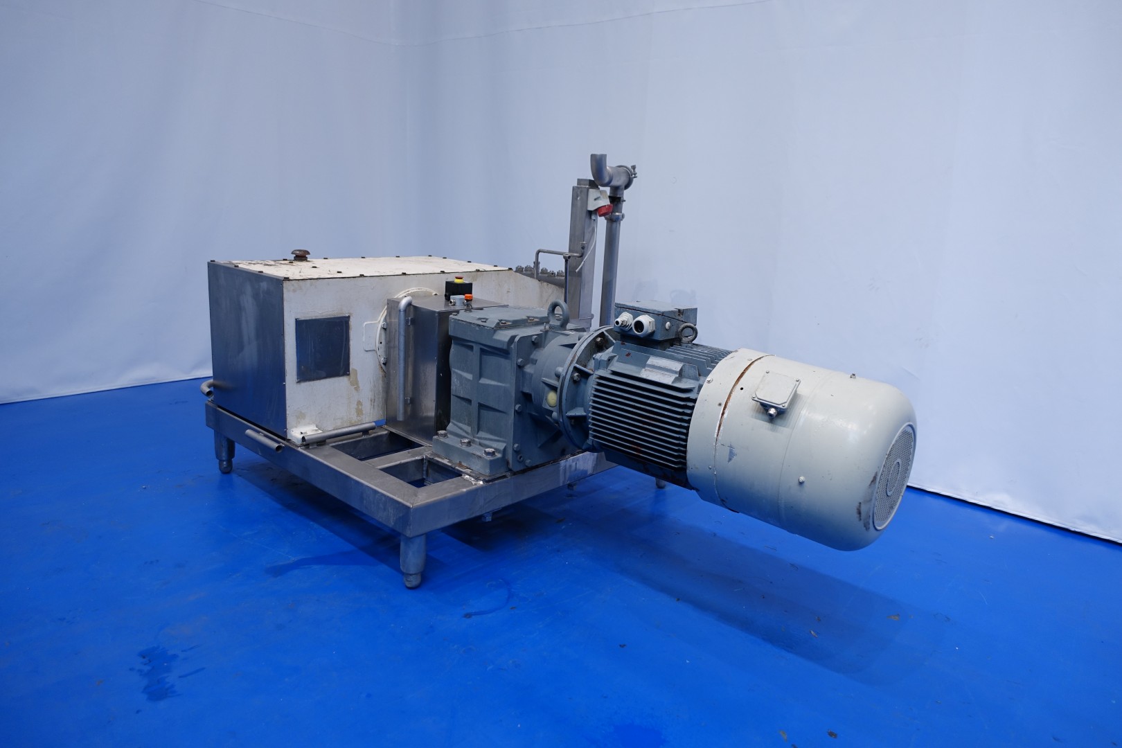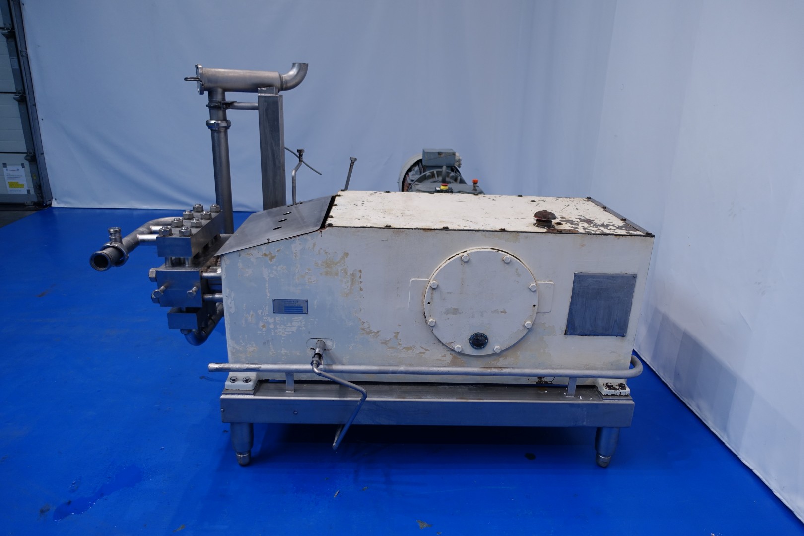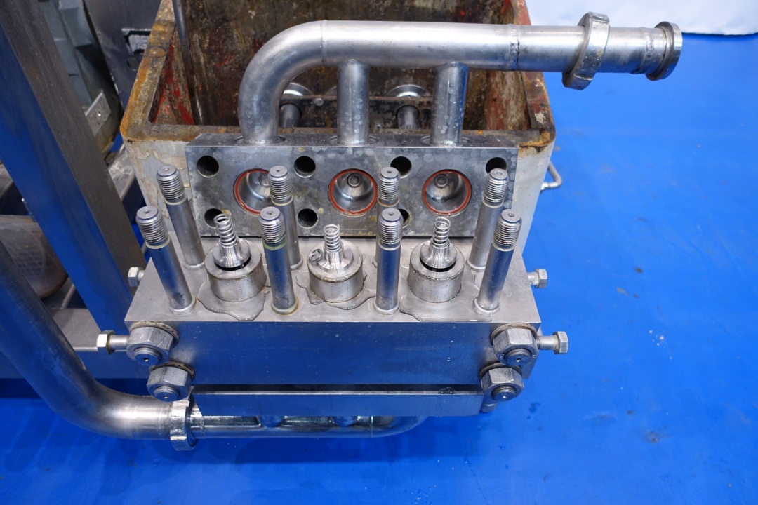 High pressure pump used for margarine. The conveying pump is a 3 piston pump with 3 suction and pressure valves. It conveys the margarine emulsion coming from the premix / buffer vessel into and through the cooling cylinders of the crystalliser. Maximum pressure: 75 bar. Piston diameter: 45 mm and stroke: +/- 120 mm. Motor: 88 kW - A - n1: 1.500 rpm - i: 13,37 - n2: 112 rpm. motor with forced cooling. Capacity normally varialbe speed by freq converter can be reduced to 2000 kg/h. Connections: 1 x 2,5"" Din and 1 x 1,5"" Din. Total dimensions: 288x210x155 (lxwxh) cm - weight: 2.840 kg."