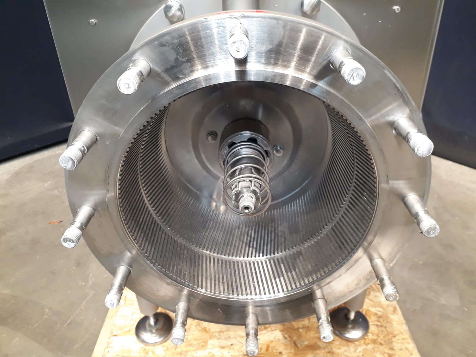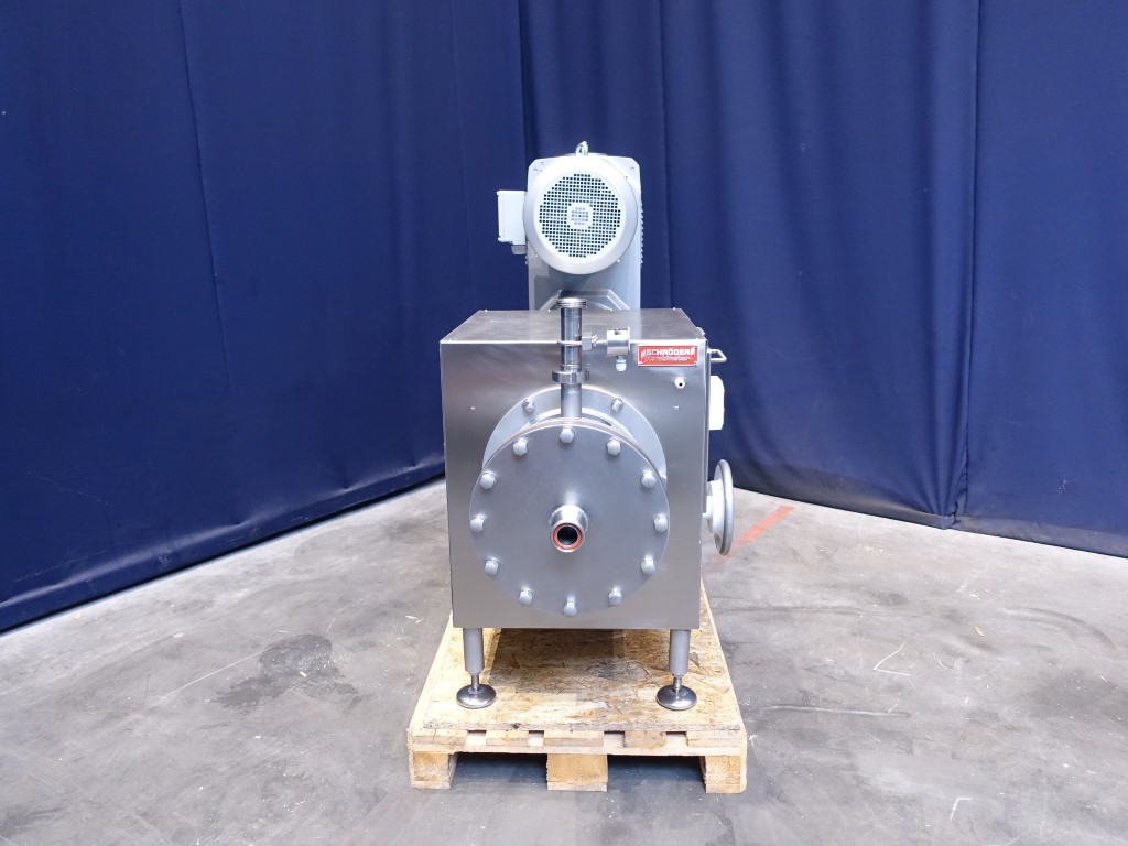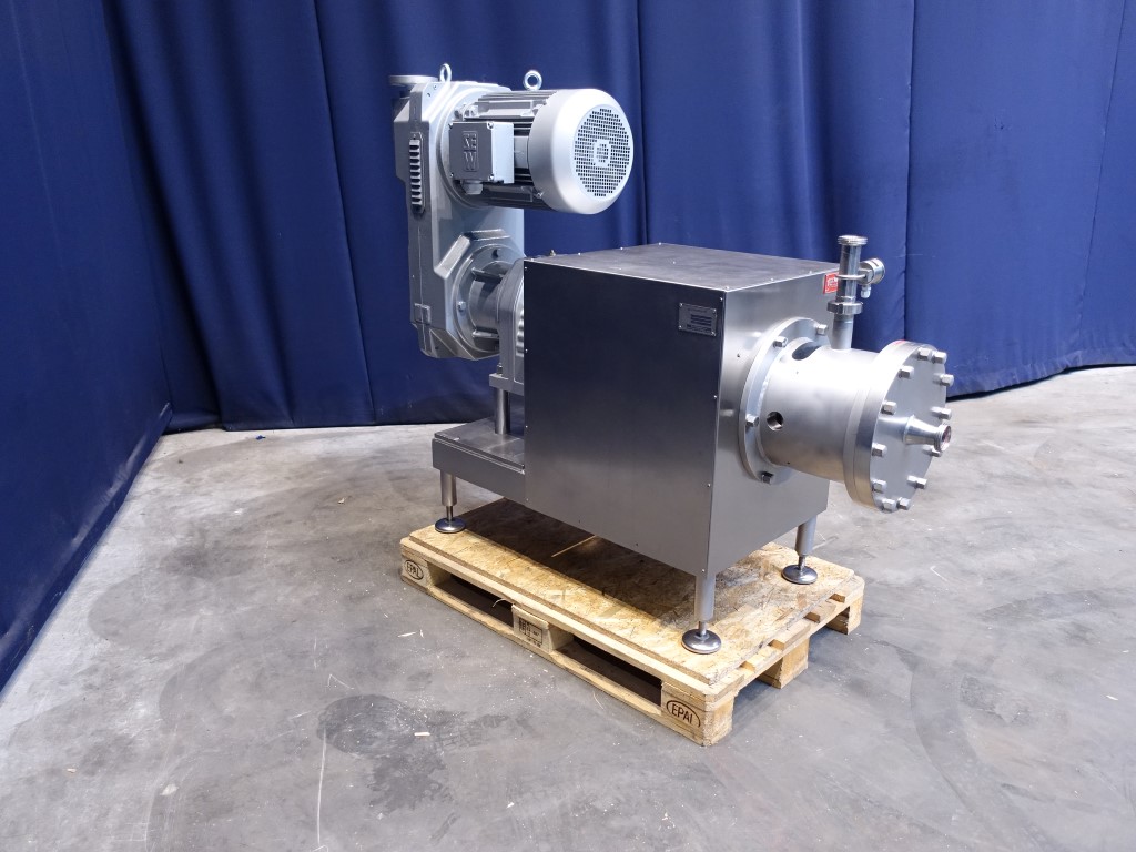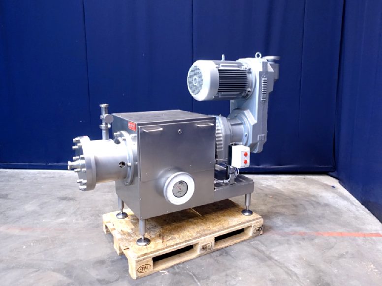 Reconditioned visco rotor. This visco rotor is a colloid mill used for production of margarine, mayonnaise, dressings, sauces and as a extra step in the low fat margarine production. The pre-emulsion is processed under high shear due to the specially designed spiral gearing. This ensures that the oil drops are continuously reduced in size and distributed homogeneously. Speed from 262 up to 1.460 rpm mechanical adjustable, motor power 15kW. Working pressure up to 50 bar. Connections: 1,5'' DIN, the spline between the rotor and stator is mechanically adjustable by handwheel between 0 and 8.5mm. Two sensors are installed to give a warning light if the minimum or maximum spline distance is achieved